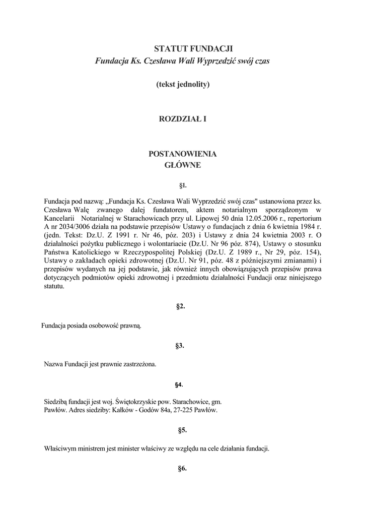 STATUT FUNDACJI Fundacja Ks. Czesława Wali Wyprzedzić swój czas (tekst jednolity) ROZDZIAŁ I POSTANOWIENIA GŁÓWNE §1. Fundacja pod nazwą: „Fundacja Ks. Czesława Wali Wyprzedzić swój czas" ustanowiona przez ks. Czesława Walę zwanego dalej fundatorem, aktem notarialnym sporządzonym w Kancelarii Notarialnej w Starachowicach przy ul. Lipowej 50 dnia 12.05.2006 r., repertorium A nr 2034/3006 działa na podstawie przepisów Ustawy o fundacjach z dnia 6 kwietnia 1984 r. (jedn. Tekst: Dz.U. Z 1991 r. Nr 46, póz. 203) i Ustawy z dnia 24 kwietnia 2003 r. O działalności pożytku publicznego i wolontariacie (Dz.U. Nr 96 póz. 874), Ustawy o stosunku Państwa Katolickiego w Rzeczypospolitej Polskiej (Dz.U. Z 1989 r., Nr 29, póz. 154), Ustawy o zakładach opieki zdrowotnej (Dz.U. Nr 91, póz. 48 z późniejszymi zmianami) i przepisów wydanych na jej podstawie, jak również innych obowiązujących przepisów prawa dotyczących podmiotów opieki zdrowotnej i przedmiotu działalności Fundacji oraz niniejszego statutu. §2. Fundacja posiada osobowość prawną. §3. Nazwa Fundacji jest prawnie zastrzeżona. §4. Siedzibą fundacji jest woj. Świętokrzyskie pow. Starachowice, gm. Pawłów. Adres siedziby: Kałków - Godów 84a, 27-225 Pawłów. §5. Właściwym ministrem jest minister właściwy ze względu na cele działania fundacji. §6. Fundacja działa na obszarze Rzeczypospolitej Polskiej. §7. Fundacja używa pieczęci prostokątnej z napisem: Fundacja Ks. Czesława Wali Wyprzedzić swój czas, Kałków - Godów 84a, 27-225 Pawłów. §8. Fundacja może przyznawać nagrody osobom fizycznym i prawnym zasłużonym dla fundacji. §9. Fundacja dla wykonania swych zadań statutowych może tworzyć stałe i czasowe placówki terenowe, biura i przedstawicielstwa oraz oddziały. §10. Fundacja może posiadać oddziały za granicą. §11. Fundacja w zakresie niezbędnym do realizacji celów statutowych może zatrudnić pracowników na podstawie umowy o prace, jak również powierzać w ramach innego stosunku prawnego wykonywanie określonych zadań lub czynności. §12. Czas trwania Fundacji jest nieograniczony. ROZDZIAŁ II CELE FUNDACJI I ZASADY DZIAŁANIA §13. Fundacja została powołana w celach: 7.Promocja zdrowia. 1.Udzielanie pomocy osobom ciężko i terminalnie chorym z powodu choroby nowotworowej i udzielanie opieki medycznej i duchowej przystosowanej do szczególnych potrzeb tych chorych. 2. Finansowe, merytoryczne i organizacyjne wspieranie form świadczenia pomocy zdrowotnej. 3.Udzielanie pomocy rodzinom osób ciężko chorych w sprawowaniu opieki nad chorymi. 4.Jednoczenie ludzi dobrej woli gotowych udzielać społecznie powyższej opieki i pomocy. 5.Wspieranie bieżącej działalności zdrowotnej. 6.Wspieranie rozwoju ochrony zdrowia. §14. Fundacja realizuje swoje cele w szczególności poprzez: 1.Programowanie idei i metody opieki nad ludźmi ciężko chorymi i osamotnionymi, zwłaszcza znajdującymi się w końcowym okresie życia lub nie mającymi właściwych warunków domowych podczas choroby. 2.organizowanie kursów, konferencji i seminariów dla swych członków i sympatyków. 3.realizowanie opieki pielęgniarsko - lekarskiej nad osobami chorymi i u schyłku życia. 4.zbieranie środków finansowych potrzebnych dla realizacji celów Fundacji. 5.inicjowanie budowy obiektów; zarządzanie posiadanymi obiektami i urządzeniami, prowadzenie hospicjów dla chorych oraz innych placówek opieki zdrowotnej 6.współpracę z placówkami Ochrony Zdrowia i Opieki Społecznej w zakresie opieki i leczenia chorych, 7.współpracę z krajowymi i zagranicznymi instytucjami o podobnym lub zbliżonym zakresie działania, 8.dla realizacji celów statutowych Fundacja może powołać Zakład Opieki Zdrowotnej a prawomocnym dla podjęcia uchwały o powołaniu i zatwierdzeniu statutu Zakładu jest Walne Zgromadzenie 9.wspieranie finansowo i materialnie działalności medycznej i opiekuńczej prowadzonej przez inne organizacje i zakłady opieki zdrowotnej 10.gromadzenie środków finansowych i zasobów materialnych pochodzących od instytucji i osób prywatnych z kraju i z za granicy 11.prowadzenie działalności gospodarczej, 12.udzielanie wsparcia finansowego, rzeczowego, pośrednictwo w udzielaniu i przekazywaniu wsparcia finansowego i rzeczowego osobom chorym i ich rodzinom 13.inne przedsięwzięcia zmierzające do realizacji celów statutowych 14.organizowanie zbiórek pieniężnych, z których dochód będzie przeznaczony na utrzymanie i rozbudowę placówek oraz inne cele statutowe 15.organizowanie imprez artystycznych i kulturalnych, w szczególności o charakterze charytatywnym 16.organizowanie szkoleń, konferencji i sympozjów naukowych oraz dofinansowywanie kursów celem podnoszenia kwalifikacji personelu medycznego 17.prowadzenie działalności informacyjnej i edukacyjnej, w tym kampanii reklamowych, promocyjnych przy użyciu środków masowego przekazu oraz wszelkich innych metod propagowania wiedzy na temat zdrowia i opieki zdrowotnej 18.prowadzenie centrum informacyjnego z zakresu profilaktyki zdrowotnej, opieki paliatywnej, terapii przeciwbólowych 19.upowszechnianie wiedzy o przyczynach chorób nowotworowych i prowadzenie działalności profilaktycznej w środowiskach młodzieży szkolnej i akademickiej oraz zakładach pracy 20.popularyzację osiągnięć innych państw zaawansowanych w zakresie profilaktyki i ochrony zdrowia 21.dofinansowywanie wyjazdów dzieci i młodzieży na kolonie i obozy, 22.dofinansowywanie leczenia w kraju i za granicą 23.dofinansowywanie osób chorych, w szczególności lekarstw dla tych osób 24.organizowanie grup wsparcia psychologicznego dla chorych i ich rodzin 25.upowszechnianie idei wolontariatu 26.organizowanie obozów, imprez turystycznych i integracyjnych dla osób chorych i ich rodzin oraz dla wolontariuszy 27.przyznawanie nagrody „Hospicyjnego Wolontariusza Roku" 28. promocje edukacji idei integracji ruchu i środowiska hospicy