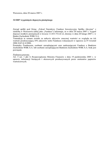 Warszawa, dnia 20 marca 2007 r. 32/2007 wygaśnięcie depozytu pieniężnego Zarząd spółki pod firmą: „Foksal Narodowy Fundusz Inwestycyjny Spółka Akcyjna” z siedzibą w Warszawie (dalej jako „Fundusz”) informuje, że w dniu 20 marca 2007 r. wygasł depozyt środków pieniężnych w kwocie 11.033.753,42 zł, złożony w dniu 20 lutego 2007 r. w Banku Zachodnim WBK S.A. Transakcja ta uznana została za nabycie aktywów znacznej wartości ze względu na ich wartość przekraczającą 10% aktywów netto Funduszu wskazanych w raporcie za IV kwartał 2006 SAF-Q 4/2006. Pomiędzy Funduszem, osobami zarządzającymi oraz nadzorującymi Fundusz a Bankiem Zachodnim WBK S.A. lub osobami zarządzającymi Bankiem Zachodnim WBK S.A. brak jest powiązań. Podstawa prawna: Art. 5 ust. 1 pkt 1) Rozporządzenia Ministra Finansów z dnia 19 października 2005 r. w sprawie informacji bieżących i okresowych przekazywanych przez emitentów papierów wartościowych.