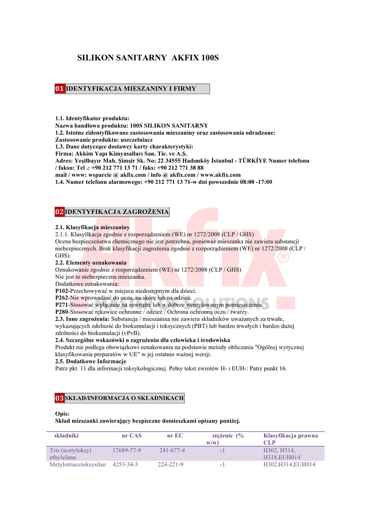 SILIKON SANITARNY AKFIX 100S 01 IDENTYFIKACJA MIESZANINY I FIRMY 1.1. Identyfikator produktu: Nazwa handlowa produktu: 100S SILIKON SANITARNY 1.2. Istotne zidentyfikowane zastosowania mieszaniny oraz zastosowania odradzane: Zastosowanie produktu: uszczelniacz 1.3. Dane dotyczące dostawcy karty charakterystyki: Firma: Akkim Yapı Kimyasalları San. Tic. ve A.Ş. Adres: Yeşilbayır Mah. Şimşir Sk. No: 22 34555 Hadımköy İstanbul - TÜRKİYE Numer telefonu / faksu: Tel .: +90 212 771 13 71 / faks: +90 212 771 38 88 mail / www: wsparcie @ akfix.com / info @ akfix.com / www.akfix.com 1.4. Numer telefonu alarmowego: +90 212 771 13 71-w dni powszednie 08:00 -17:00 02 IDENTYFIKACJA ZAGROŻENIA 2.1. Klasyfikacja mieszaniny 2.1.1. Klasyfikacja zgodnie z rozporządzeniem (WE) nr 1272/2008 (CLP / GHS) Ocena bezpieczeństwa chemicznego nie jest potrzebna, ponieważ mieszanka nie zawiera substancji niebezpiecznych. Brak klasyfikacji zagrożenia zgodnie z rozporządzeniem (WE) nr 1272/2008 (CLP / GHS). 2.2. Elementy oznakowania Oznakowanie zgodnie z rozporządzeniem (WE) nr 1272/2008 (CLP / GHS) Nie jest to niebezpieczna mieszanka. Dodatkowe oznakowania: P102-Przechowywać w miejscu niedostępnym dla dzieci. P262-Nie wprowadzać do oczu, na skórę lub na odzież. P271-Stosować wyłącznie na zewnątrz lub w dobrze wentylowanym pomieszczeniu. P280-Stosować rękawice ochronne / odzież / Ochrona ochronną oczu / twarzy. 2.3. Inne zagrożenia: Substancja / mieszanina nie zawiera składników uważanych za trwałe, wykazujących zdolność do biokumulacji i toksycznych (PBT) lub bardzo trwałych i bardzo dużej zdolności do biokumulacji (vPvB). 2.4. Szczególne wskazówki o zagrożeniu dla człowieka i środowiska Produkt nie podlega obowiązkowi oznakowania na podstawie metody obliczania "Ogólnej wytycznej klasyfikowania preparatów w UE" w jej ostatnio ważnej wersji. 2.5. Dodatkowe Informacje Patrz pkt 11 dla informacji toksykologicznej. Pełny tekst zwrotów H- i EUH-: Patrz punkt 16. 03 SKŁAD/INFORMACJA O SKŁADNIKACH Opis: Skład mieszanki zawierający bezpieczne domieszkami opisany poniżej. składniki Tris (acetyloksy) ethylsilane Metylotriacetoksysilan nr CAS nr EC 17689-77-9 241-677-4 4253-34-3 224-221-9 stężenie (% w/w) ‹1 ‹1 Klasyfikacja prawna CLP H302, H314, H318,EUH014 H302,H314,EUH014 04 PIERWSZA POMOC 4.1. Opis środków pierwszej pomocy: Zalecenia ogólne: Zdjąć zanieczyszczoną odzież roboczą i obuwie. W razie złego samopoczucia zasięgnąć porady lekarza. W przypadku wdychania: Usunąć poszkodowanego na świeże powietrze i zapewnić swobodne oddychanie. Jeśli oddychanie jest utrudnione, podać tlen. Uzyskać pomoc medyczną w przypadku pojawienia się objawów. W przypadku kontaktu ze skórą: Natychmiast zdjąć całą zanieczyszczoną odzież. Zmyć skórę dużą ilością wody. Uzyskać pomoc medyczną w przypadku pojawienia się objawów podrażnienia skóry. W przypadku kontaktu z oczami: Zabezpieczyć nieuszkodzone oko. Jeżeli to możliwe, usunąć szkła kontaktowe, jeżeli są stosowane. W przypadku kontaktu z oczami natychmiast przemyć dużą ilością wody i zasięgnąć porady lekarza. W przypadku połknięcia: Nie wywoływać wymiotów. Nigdy nie podawać niczego doustnie osobie nieprzytomnej. Dokładnie wypłukać usta wodą. Jeśli objawy nie ustępują, należy zasięgnąć porady lekarza i pokazać opakowanie lub etykietę. 4.2. Ważne objawy,skutki opóźnione: Brak danych. 4.3. Wskazania dotyczące wszelkiej natychmiastowej pomocy lekarskiej i szczególnego postępowania z poszkodowanym: Brak danych. 05 POSTĘPOWANIE W PRZYPADKU POŻARU 5.1. Środki gaśnicze: Nadające się środki gaśnicze: CO2, proszek. Większy pożar zwalczać strumieniem wody lub pianą odporną na alkohol. Nie wskazane środki gaśnicze: Silny strumień wody. 5.2. Szczególne zagrożenia związane z mieszaniny: Kontakt z produktami spalania może być niebezpieczny dla zdrowia. Niebezpieczne produkty spalania: Tlenki węgla, opary kwasu octowego. 5.3. Informacje dla strażaków: Nosić aparaty oddechowe w razie potrzeby. Stosować środki ochrony indywidualnej. Specyficzne metody gaśnicze: Użycie środków odpowiednich dla lokalnych warunków i dla środowiska gaśniczego. Stosować zraszanie wodą do chłodzenia nieotwartych pojemników. Usuń nieuszkodzone pojemniki z miejsca pożaru, jeżeli jest to możliwe. Ewakuować teren. 06 POSTĘPOWANIE W RAZIE NIEZAMIERZONEGO UWOLNIENIA 6.1. Indywidualne środki ostrożności, wyposażenie ochronne i procedury w sytuacjach awaryjnych: Używać osobisty sprzęt ochronny. Stosować produkt zgodnie z instrukcją. Osoby postronne trzymać z dala. 6.2. Środki ostrożności w zakresie ochrony środowiska: Nie dopuścić do przedostania się do wód gruntowych, ścieków lub gleby. Należy powiadomić lokalne służby jeżeli nastapił wyciek. 6.3. Metody czyszczenia i materiały zapobiegające rozprzestrzenianiu się skażeniu: Zanurzyć w obojętnym materiale sorpcyjnym, takim jak piasek, żel krzemionkowy, pochłaniacz kwasów, pochłaniacz uniwersalny, trociny. W przypadku dużych wycieków, zapewnić odpowiednie pojemniki do przechowywania materiału zapobiegające rozprzestrzenianiu się. Oczyścić skażone powierzchnie. Przepisy lokalne lub krajowe mogą regulować procedury usuwania tego materiału. 6.4. Odniesienia do innych sekcji: Patrz rozdział: 7, 8, 11, 12 i 13. 07 OBSŁUGA I PRZECHOWYWANIE 7.1. Środki ostrożności dotyczące bezpiecznego postępowania: Patrz na środki techniczne w rozdziale Kontrola narażenia / środki sekcji ochrony. Używać tylko przy odpowiednio dobrej wentylacji. Unikać wdychania oparów i par. Nie wprowadzać do oczu, na skórę lub na odzież. Stosować zgodnie z zasadami dobrej praktyki higieny i bezpieczeństwa. Po pracy umyć ręce wodą z mydłem. Skażone ubranie robocze nie powinno opuszczać miejsca pracy. Zdjąć zanieczyszczoną odzież i umyć ją przed ponownym użycie