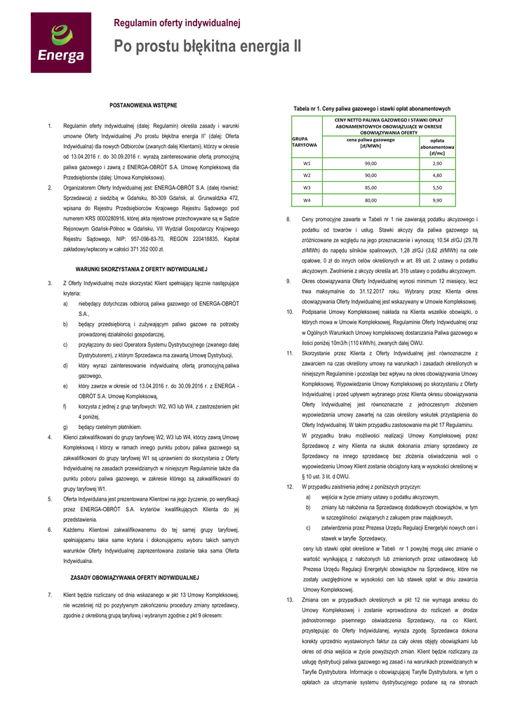 o Regulamin oferty indywidualnej Po prostu błękitna energia II POSTANOWIENIA WSTĘPNE 1. Tabela nr 1. Ceny paliwa gazowego i stawki opłat abonamentowych Regulamin oferty indywidualnej (dalej: Regulamin) określa zasady i warunki umowne Oferty Indywidualnej „Po prostu błękitna energia II” (dalej: Oferta GRUPA TARYFOWA Indywidualna) dla nowych Odbiorców (zwanych dalej Klientami), którzy w okresie od 13.04.2016 r. do 30.09.2016 r. wyrażą zainteresowanie ofertą promocyjną W1 99,00 2,90 Przedsiębiorstw (dalej: Umowa Kompleksowa). W2 90,00 4,80 Organizatorem Oferty Indywidualnej jest: ENERGA-OBRÓT S.A. (dalej również: W3 85,00 5,50 Sprzedawca) z siedzibą w Gdańsku, 80-309 Gdańsk, al. Grunwaldzka 472, W4 80,00 9,90 paliwa gazowego i zawrą z ENERGA-OBRÓT S.A. Umowę Kompleksową dla 2. CENY NETTO PALIWA GAZOWEGO I STAWKI OPŁAT ABONAMENTOWYCH OBOWIĄZUJĄCE W OKRESIE OBOWIĄZYWANIA OFERTY cena paliwa gazowego opłata [zł/MWh] abonamentowa [zł/mc] wpisana do Rejestru Przedsiębiorców Krajowego Rejestru Sądowego pod numerem KRS 0000280916, której akta rejestrowe przechowywane są w Sądzie 8. Ceny promocyjne zawarte w Tabeli nr 1 nie zawierają podatku akcyzowego i Rejonowym Gdańsk-Północ w Gdańsku, VII Wydział Gospodarczy Krajowego podatku od towarów i usług. Stawki akcyzy dla paliwa gazowego są Rejestru Sądowego, NIP: 957-096-83-70, REGON 220418835, Kapitał zróżnicowane ze względu na jego przeznaczenie i wynoszą: 10,54 zł/GJ (29,78 zakładowy/wpłacony w całości 371 352 000 zł. zł/MWh) do napędu silników spalinowych, 1,28 zł/GJ (3,62 zł/MWh) na cele opałowe, 0 zł do innych celów określonych w art. 89 ust. 2 ustawy o podatku WARUNKI SKORZYSTANIA Z OFERTY INDYWIDUALNEJ 3. Z Oferty Indywidualnej może skorzystać Klient spełniający łącznie następujące trwa maksymalnie do 31.12.2017 roku. Wybrany przez Klienta okres a) niebędący dotychczas odbiorcą paliwa gazowego od ENERGA-OBRÓT obowiązywania Oferty Indywidualnej jest wskazywany w Umowie Kompleksowej. b) będący przedsiębiorcą i zużywającym paliwo gazowe na potrzeby których mowa w Umowie Kompleksowej, Regulaminie Oferty Indywidualnej oraz prowadzonej działalności gospodarczej, w Ogólnych Warunkach Umowy kompleksowej dostarczania Paliwa gazowego w c) d) e) f) g) 10. Podpisanie Umowy Kompleksowej nakłada na Klienta wszelkie obowiązki, o ilości poniżej 10m3/h (110 kWh/h), zwanych dalej OWU. przyłączony do sieci Operatora Systemu Dystrybucyjnego (zwanego dalej Dystrybutorem), z którym Sprzedawca ma zawartą Umowę Dystrybucji, 11. Skorzystanie przez Klienta z Oferty Indywidualnej jest równoznaczne z który wyrazi zainteresowanie indywidualną ofertą promocyjną paliwa zawarciem na czas określony umowy na warunkach i zasadach określonych w gazowego, niniejszym Regulaminie i pozostaje bez wpływu na okres obowiązywania Umowy który zawrze w okresie od 13.04.2016 r. do 30.09.2016 r. z ENERGA - Kompleksowej. Wypowiedzenie Umowy Kompleksowej po skorzystaniu z Oferty OBRÓT S.A. Umowę Kompleksową, Indywidualnej i przed upływem wybranego przez Klienta okresu obowiązywania korzysta z jednej z grup taryfowych: W2, W3 lub W4, z zastrzeżeniem pkt Oferty 4 poniżej, wypowiedzenia umowy zawartej na czas określony wskutek przystąpienia do będący rzetelnym płatnikiem. Oferty Indywidualnej. W takim przypadku zastosowanie ma pkt 17 Regulaminu. jest równoznaczne z jednoczesnym złożeniem W przypadku braku możliwości realizacji Umowy Kompleksowej przez Kompleksową i którzy w ramach innego punktu poboru paliwa gazowego są Sprzedawcę z winy Klienta na skutek dokonania zmiany sprzedawcy ze zakwalifikowani do grupy taryfowej W1 są uprawnieni do skorzystania z Oferty Sprzedawcy na innego sprzedawcę bez złożenia oświadczenia woli o Indywidualnej na zasadach przewidzianych w niniejszym Regulaminie także dla wypowiedzeniu Umowy Klient zostanie obciążony karą w wysokości określonej w grupy taryfowej W1. § 10 ust. 3 lit. d OWU. 12. W przypadku zaistnienia jednej z poniższych przyczyn: Oferta Indywidulana jest prezentowana Klientowi na jego życzenie, po weryfikacji a) wejścia w życie zmiany ustawy o podatku akcyzowym, przez ENERGA-OBRÓT S.A. kryteriów kwalifikujących Klienta do jej b) zmiany lub nałożenia na Sprzedawcę dodatkowych obowiązków, w tym w szczególności związanych z zakupem praw majątkowych, przedstawienia. 6. Indywidualnej Klienci zakwalifikowani do grupy taryfowej W2, W3 lub W4, którzy zawrą Umowę punktu poboru paliwa gazowego, w zakresie którego są zakwalifikowani do 5. Okres obowiązywania Oferty Indywidualnej wynosi minimum 12 miesięcy, lecz kryteria: S.A., 4. akcyzowym. Zwolnienie z akcyzy określa art. 31b ustawy o podatku akcyzowym. 9. c) Każdemu Klientowi zakwalifikowanemu do tej samej grupy taryfowej, zatwierdzenia przez Prezesa Urzędu Regulacji Energetyki nowych cen i stawek w taryfie Sprzedawcy, spełniającemu takie same kryteria i dokonującemu wyboru takich samych warunków Oferty Indywidualnej zaprezentowana zostanie taka sama Oferta ceny lub stawki opłat określone w Tabeli nr 1 powyżej mogą ulec zmianie o Indywidualna. wartość wynikającą z nałożonych lub zmienionych przez ustawodawcę lub Prezesa Urzędu Regulacji Energetyki obowiązków na Sprzedawcę, które nie ZASADY OBOWIĄZYWANIA OFERTY INDYWIDUALNEJ 7. Klient będzie rozliczany od dnia wskazanego w pkt 13 Umowy Kompleksowej, nie wcześniej niż po pozytywnym zakończeniu procedury zmiany sprzedawcy, zgodnie z określoną grupą taryfową i wybranym zgodnie z pkt 9 okresem: zostały uwzględnione w wysokości cen lub stawek opłat w dniu zawarcia Umowy Kompleksowej. 13. Zmiana cen w przypadkach określonych w pkt 12 nie wymaga aneksu do Umowy Kompleksowej i zostanie wprowadzona do rozliczeń w drodze jednostronnego pisemnego oświadczenia Sprzedawcy, na co Klient, przystępując do Oferty Indywidulanej, wyraża zgodę. Sprzedawca dokona korekty uprz
