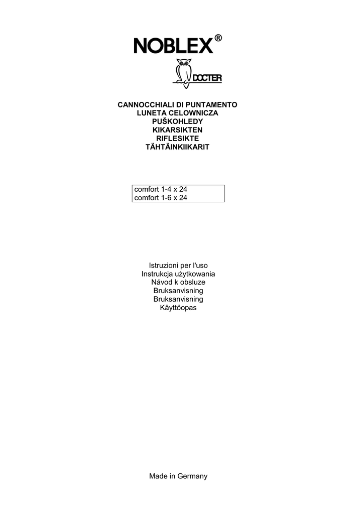CANNOCCHIALI DI PUNTAMENTO LUNETA CELOWNICZA PUŠKOHLEDY KIKARSIKTEN RIFLESIKTE TÄHTÄINKIIKARIT comfort 1-4 x 24 comfort 1-6 x 24 Istruzioni per l'uso Instrukcja użytkowania Návod k obsluze Bruksanvisning Bruksanvisning Käyttöopas Made in Germany 3 1 2 Attenzione Evitare assolutamente di guardare la luce diretta del sole con il cannocchiale. L'elevata intensità luminosa del sole può provocare gravi danni agli occhi! Uwaga Z powodu silnego wiązkowania światła bezpośrednia obserwacja słońca przy użyciu niniejszej lunety celowniczej może prowadzić do uszkodzeń oczu i dlatego należy tego koniecznie unikać. Pozor! Vzhledem k silné skupinování světla může přímé pozorování slunce s puškohledem vést k poranění očí a je proto nutné tomu bezpodmínečně vyhnout. Varning På grund av den starka fokuseringen av ljuset kan en direkt observation av solen med ett teleskop leda till skador på ögonen och ska därför undvikas. OBS Unngå å se direkte mot sola med et riflesikte fordi den sterke konsentrasjonen av lysstråler da kan skade øynene. Huom Kiikarin kautta ei saa katsoa suoraan aurinkoon. Laite fokusoi säteet voimakkaasti ja aurinkoon katsominen aiheuttaa silmävamman. Avvertenze per lo smaltimento di sistemi di puntamento con parti elettroniche Una volta usurati, i sistemi di puntamento che dispongono di un reticolo di mira illuminato e che quindi possono essere costituiti da parti elettroniche come da progetto, non devono essere mescolati con i comuni rifiuti domestici. Per il corretto trattamento, recupero e riciclo di questi prodotti, rivolgersi ai centri di raccolta appositi, che li accetteranno senza ulteriori addebiti. Lo smaltimento corretto di questi prodotti presso gli appositi centri di raccolta contribuisce alla tutela dell'ambiente ed evita possibili conseguenze dannose per l'essere umano e l'ambiente stesso, derivanti da una manipolazione errata dei rifiuti. Avvertenze per lo smaltimento delle batterie dei sistemi di puntamento Le batterie non possono essere smaltite con i rifiuti domestici. Si prega di smaltire le batterie usate presso i centri appositi di ritiro e riciclo. Il consumatore è tenuto per legge a riconsegnare le batterie scariche e non più utilizzabili. Il ritiro ha luogo presso i centri di raccolta autorizzati. Informazioni generali I cannocchiali di puntamento comfort sono sistemi ottici eccellenti e tecnologicamente avanzati. La struttura solida, le prestazioni ottiche elevate, il design piacevole e l'affidabilità, anche in condizioni meteo estreme, rendono il vostro cannocchiale comfort indispensabile. La fornitura comprende 1x calotta di protezione trasparente 2x batterie CR 2032 manuale di istruzioni certificato di garanzia Dati tecnici Modello Ingrandimento 1-4x24 1x - 4x 1-6x24 1x – 6x apertura obiettivo [mm] 24 24 tubo intermedio [mm 30 30 tubo dell'obiettivo [mm] 30 30 Lunghezza di ingombro [mm] 279 287 Peso [g] 490 530 15 - 6,0 11,1 – 4,0 Campo visivo in m a 100 metri 31,0 - 10,6 37,5 – 6,25 Distanza di osservazione esente da parallasse [m] 100 100 Punto oculare [mm] >90 >90 Valore di regolazione verticale e laterale [cm su 100m] 2,0 1,0 Intervallo di regolazione complessivo verticale e laterale [cm su 100 m] 320 370 Compensazione difetti visivi 2,5 ± 3,0 Temperatura di esercizio -25C - +40C -25C - +40C Temperatura di stoccaggio -40C - +55C -40C - +55C 1m 1m uscita pupillare [mm] Tenuta ermetica Messa in funzione Inserimento della batteria Per prima cosa svitare il coperchio del vano batterie (1). Successivamente inserire la batteria al litio CR2032 (in dotazione) nel vano batterie con il polo positivo rivolto verso l'alto e spingerla al centro fino al click. La scritta sulla pila deve essere leggibile. Infine, avvitare nuovamente il coperchio della batteria (1) per garantire la sicurezza dei contatti elettrici e la tenuta ermetica del vano batterie. Rimozione della batteria Per prima cosa svitare il coperchio del vano batterie (1). Estrarre la pila, premendone il bordo verso il basso finché la batteria non si stacca con un click e fuoriesce. Accensione e spegnimento del reticolo di mira illuminato L'accensione manuale del reticolo di mira illuminato non è prevista. Se il cannocchiale di puntamento è in funzione, il reticolo di mira si attiva in automatico. Il dispositivo si spegne se, prendendo la mira o inclinando il cannocchiale, si supera l'angolazione limite. L'angolo limite in caso di rotazione è di 45°; in caso di inclinazione è di 45° verso l'alto e 75° verso il basso come da figura …. Il dispositivo, quando è nell'armadio porta-armi, solitamente in posizione verticale, si disattiva. Inoltre, la regolazione in condizioni di luminosità ambiente esigua come ad esempio all'interno della valigia porta-armi, è predisposta per un elevato risparmio energetico anche se il dispositivo non è stato precedentemente disattivato. Regolazione della luminosità del reticolo di mira Il cannocchiale di puntamento comfort è dotato di un sistema di regolazione automatico della luminosità. Grazie a questo sistema l'intensità dello spot luminoso si adatta automaticamente alla luminosità ambiente. Non è necessario ad esempio regolare l'intensità di illuminazione al crepuscolo. La luminosità può essere impostata manualmente qualora le impostazioni di default non soddisfino le vostre esigenze. Guardando l'oculare, ruotare l'anello di regolazione (2) verso l'alto per aumentare e, verso il basso per diminuire l'intensità della luce. La freccia sull'anello di regolazione (2) indica l'impostazione attuale sulla base della barra a cinque tacche in ordine crescente. Così è possibile modificare il livello di luminosità; l'aggiustamento alla luminosità ambiente avviene in automatico successivamente. Per consentire un funzionamento ottimale, è necessario che il sensore di luminosità collocato dietro al disco in plastica non venga coperto anche durante la regolazione della luminosità. Si ricorda che i