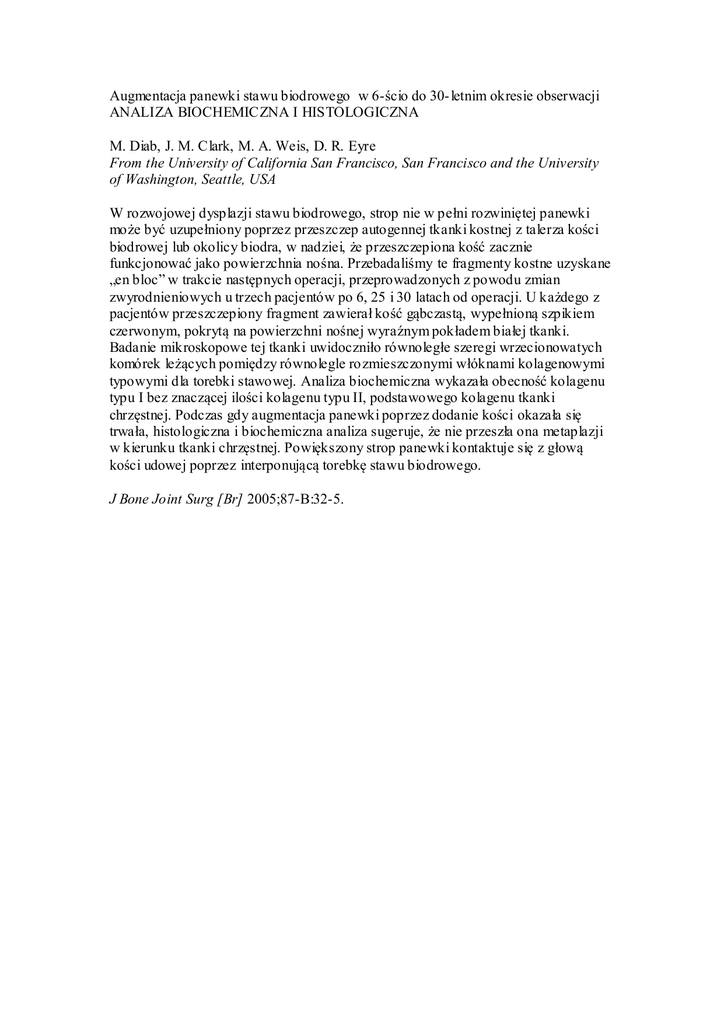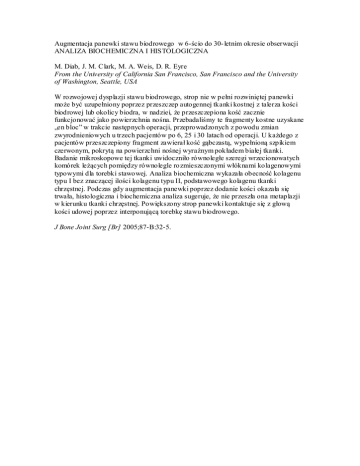 Augmentacja panewki stawu biodrowego w 6-ścio do 30- letnim okresie obserwacji ANALIZA BIOCHEMICZNA I HISTOLOGICZNA M. Diab, J. M. Clark, M. A. Weis, D. R. Eyre From the University of California San Francisco, San Francisco and the University of Washington, Seattle, USA W rozwojowej dysplazji stawu biodrowego, strop nie w pełni rozwiniętej panewki może być uzupełniony poprzez przeszczep autogennej tkanki kostnej z talerza kości biodrowej lub okolicy biodra, w nadziei, że przeszczepiona kość zacznie funkcjonować jako powierzchnia nośna. Przebadaliśmy te fragmenty kostne uzyskane „en bloc” w trakcie następnych operacji, przeprowadzonych z powodu zmian zwyrodnieniowych u trzech pacjentów po 6, 25 i 30 latach od operacji. U każdego z pacjentów przeszczepiony fragment zawierał kość gąbczastą, wypełnioną szpikiem czerwonym, pokrytą na powierzchni nośnej wyraźnym pokładem białej tkanki. Badanie mikroskopowe tej tkanki uwidoczniło równoległe szeregi wrzecionowatych komórek leżących pomiędzy równolegle rozmieszczonymi włóknami kolagenowymi typowymi dla torebki stawowej. Analiza biochemiczna wykazała obecność kolagenu typu I bez znaczącej ilości kolagenu typu II, podstawowego kolagenu tkanki chrzęstnej. Podczas gdy augmentacja panewki poprzez dodanie kości okazała się trwała, histologiczna i biochemiczna analiza sugeruje, że nie przeszła ona metaplazji w kierunku tkanki chrzęstnej. Powiększony strop panewki kontaktuje się z głową kości udowej poprzez interponującą torebkę stawu biodrowego. J Bone Joint Surg [Br] 2005;87-B:32-5.