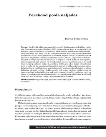 doi:10.7592/MT2012.52.brzozowska Perekond poola naljades Dorota Brzozowska Teesid: Artiklis kirjeldatakse pereelu kuvandit Poola postsotsialistlikes naljades. Tänapäevane materjal (alates 1990. aastate lõpust kuni praeguse ajani) on kogutud vastavasisulistest raamatutest, brošüüridest, ajalehtedest ja internetist, analüüsitud on 600 nalja (vrd ka üldisem ülevaade poola naljade muutumisest Brzozowska 2009). Kuna pereelust ei ole eraldi naljade tsüklit, on arvesse võetud erinevaid naljatekste, kus esinevad sõnad “naine”, “mees”, “laps” või nende sünonüümid. Uuringu tulemused näitavad, et naljades esineb mitmeid püsitegelasi, näiteks agressiivsed ämmad või truudusetud naised. Uusi teemasid ei ole eriti lisandunud: puuduvad naljad isapuhkuse kohta, mis alles hiljuti võimalikuks tehti ja mille üle ka meedias palju arutleti, samuti ei leidu nalju joobes naistest, kuigi probleem on ühiskonnas olemas ja naistel on üha rohkem lubatud avalikes kohtades alkoholi tarbida. Kokkuvõtvalt võib antud uuringu põhjal väita, et pereteemalised naljad ei käsitle jooksvaid ega päevakajalisi sündmusi, vaid on pigem jäänud peamiselt traditsiooniliseks, kajastades teatud kindlaid korduvaid teemasid, mis kuuluvad rahva kultuuripärandi keskmesse. Märksõnad: Poola perenaljad, postsotsialistlikud naljad, stereotüübid naistest, tuumpere Sissejuhatus Artiklis tuuakse välja sooliste aspektide olemasolu poola naljades,1 kus tegelasteks on naised, mehed ja lapsed. Naljaobjekte kujutatakse kõige sagedamini just privaatsfääris. Naljades esitatakse poola perekonda enamasti tuumperena, kus on ema, isa ja laps, tavaliselt poeg Jasio või Kazio. Poola naised esinevad naljades abielunaistena, kes kalduvad sageli rikkuma abielu. Mehed on joodikud, ei hoolitse oma laste eest ega ole huvitatud kodutööde tegemisest. Lapsed on targemad kui nende vanemad või õpetajad. Mõnikord sekkuvad pereellu ämmad või vanaisad. Uuemates naljades on stabiilne ja traditsiooniline meeste-naiste maailma vastandus muutunud, sest sooküsimusi käsitletakse feministlikust vaatenurgast. http://www.folklore.ee/tagused/nr52/brzozowska.pdf Dorota Brzozowska Käesoleva artikli jaoks on kokku kogutud materjal alates 1990. aastate teisest poolest kuni praeguse ajani (vrd Brzozowska 2003). Allikateks on raamatud, brošüürid, ajalehed ja internet. Kuna pereelu kohta ei ole eraldi naljade tsüklit, on arvesse võetud erinevaid naljatekste, kus esinevad sõnad “naine”, “mees”, “laps” või nende sünonüümid. Kokku analüüsiti 600 nalja – kõigist kolmest kategooriast kakssada teksti. Uuringu peamine eesmärk oli kontrollida, milline pilt antakse pereelust postsotsialistlikes naljades, kuna need naljad on tekkinud aastail, mil majanduspoliitiline olukord stabiliseerus ja elukvaliteet muutus üsnagi rahuldavaks. Mind huvitab küsimus, kuidas kujutatakse naljades avalikku ja privaatsfääri, kuidas need seostuvad stereotüüpsete meeste ja naiste rollidega ühiskonnas (vt Jędrzejko 1994) ja mil määral tuleb esile patriarhaalne maailmapilt, nagu see oli tavaks varasemates, enne 1990. aastaid ringelnud naljades. Abielu Kõige arvukam rühm nalju käesolevas valimis (ca 30%) on naistest kui abikaasadest – see on roll, millega kaasneb palju sissejuurdunud stereotüüpe naistest, vastandatuna meestele. “Naise ja mehe stereotüübi olemasolu on markantne ning sel on tähenduslik roll inimeste sotsiaalsete uskumuste seas [...]. Stereotüüpselt nähakse naisi soojade ja ekspressiivsetena, samas kui mehed on ratsionaalsed ja efektiivsed oma tegudes” (Nęcki 2000). Abielurikkumise skript on neis naljades kõige populaarsem. “Słyszałem, że twoja żona zaliczyła całe miasto?” “Też mi miasto, pięć tysięcy mieszkańców.” [“Ma kuulsin, et su naine on kogu linnaga maganud?” – “Viis tuhat inimest – kas sa nimetad seda linnaks?”] (Ale jaja. O kobietach 12/97) Truudusetuna kujutatakse naljades mitte üksnes Poola naisi, vaid ka nende meestel on abieluväliseid suhteid: “Tato – żali się córka Kowalskiemu – mąż mnie zdradza. Co mam robić?” “Poczekaj na mamę, ona ma większe doświadczenie w tej sprawie.” [“Issi,” kaebleb Kowalski tütar, “mu mees petab mind, mida ma peaksin tegema?” – “Küsi oma emalt, tal on selles asjas rohkem kogemusi.”] (Świeże dowcipy. O kelnerach 7/97) 66 www.folklore.ee/tagused Perekond Poola naljades Paljudes uuritud naljades on tegelaseks armuke, ka on märkimisväärselt palju nalju lahutusest. Need kaks teemat on tihedalt seotud, sest päriselus peab enamik paare peamiseks lahutuse põhjuseks just truudusetust. Tänapäeval on naistel rohkem võimalusi neid mitte rahuldava abielu lõpetamiseks kui mõned aastakümned tagasi. Statistika kohaselt on just naised need, kes tunnevad end abielus sagedamini õnnetuna, ja algatavad koguni 70% kõigist lahutustest (Poola Õigusabi portaal 2012). Lahutuste arv on kiiresti kasvanud, ja kuigi peamiselt abiellutakse kiriklikult ning Poola peamine religioosne institutsioon roomakatoliku kirik ei luba abielu lahutada, on purunevate abielude arv siiski suurenemas. “Czy jest pan rozwiedziony?” “Jeszcze nie.” [“Kas te olete lahutatud, härra?” – “Veel mitte.”] (Coś z dowcipami. O facetach 11/97) Mõnikord kestab abielu palju kauem, kui abikaasad sooviksid. Veel üks skript poola naljades räägib naistest, kes on juba surnud, kuid oma ikka veel elavatele meestele veskikiviks kaelas: “Nie płacz, czyżbyś nie wierzył, że spotkasz się ze swoją żoną w niebie?!” pociesza przyjaciel wdowca. “Wierzę i dlatego płaczę!” [“Ära nuta, kas sa siis ei tea, et kohtud oma naisega taevas?!” lohutab sõber leske. – “Ma usun, et ma pean temaga tõesti veel kohtuma, sellepärast nutangi!”] (Dowcip za dychę 6–7/94) Teisalt näitab statistika, et lesestunud mees ei suuda enda eest korralikult hoolitseda ja sureb sageli üsna varsti pärast abikaas