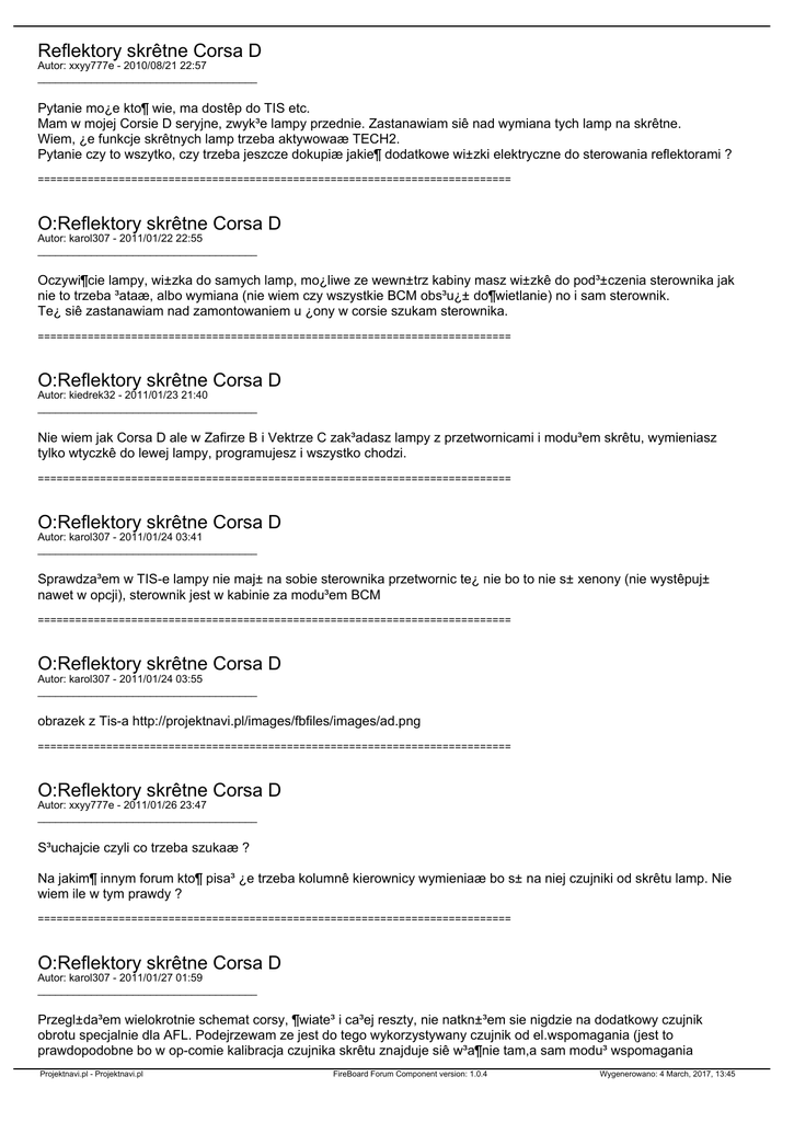 Reflektory skrêtne Corsa D Autor: xxyy777e - 2010/08/21 22:57 _____________________________________ Pytanie mo¿e kto¶ wie, ma dostêp do TIS etc. Mam w mojej Corsie D seryjne, zwyk³e lampy przednie. Zastanawiam siê nad wymiana tych lamp na skrêtne. Wiem, ¿e funkcje skrêtnych lamp trzeba aktywowaæ TECH2. Pytanie czy to wszytko, czy trzeba jeszcze dokupiæ jakie¶ dodatkowe wi±zki elektryczne do sterowania reflektorami ? ============================================================================ O:Reflektory skrêtne Corsa D Autor: karol307 - 2011/01/22 22:55 _____________________________________ Oczywi¶cie lampy, wi±zka do samych lamp, mo¿liwe ze wewn±trz kabiny masz wi±zkê do pod³±czenia sterownika jak nie to trzeba ³ataæ, albo wymiana (nie wiem czy wszystkie BCM obs³u¿± do¶wietlanie) no i sam sterownik. Te¿ siê zastanawiam nad zamontowaniem u ¿ony w corsie szukam sterownika. ============================================================================ O:Reflektory skrêtne Corsa D Autor: kiedrek32 - 2011/01/23 21:40 _____________________________________ Nie wiem jak Corsa D ale w Zafirze B i Vektrze C zak³adasz lampy z przetwornicami i modu³em skrêtu, wymieniasz tylko wtyczkê do lewej lampy, programujesz i wszystko chodzi. ============================================================================ O:Reflektory skrêtne Corsa D Autor: karol307 - 2011/01/24 03:41 _____________________________________ Sprawdza³em w TIS-e lampy nie maj± na sobie sterownika przetwornic te¿ nie bo to nie s± xenony (nie wystêpuj± nawet w opcji), sterownik jest w kabinie za modu³em BCM ============================================================================ O:Reflektory skrêtne Corsa D Autor: karol307 - 2011/01/24 03:55 _____________________________________ obrazek z Tis-a http://projektnavi.pl/images/fbfiles/images/ad.png ============================================================================ O:Reflektory skrêtne Corsa D Autor: xxyy777e - 2011/01/26 23:47 _____________________________________ S³uchajcie czyli co trzeba szukaæ ? Na jakim¶ innym forum kto¶ pisa³ ¿e trzeba kolumnê kierownicy wymieniaæ bo s± na niej czujniki od skrêtu lamp. Nie wiem ile w tym prawdy ? ============================================================================ O:Reflektory skrêtne Corsa D Autor: karol307 - 2011/01/27 01:59 _____________________________________ Przegl±da³em wielokrotnie schemat corsy, ¶wiate³ i ca³ej reszty, nie natkn±³em sie nigdzie na dodatkowy czujnik obrotu specjalnie dla AFL. Podejrzewam ze jest do tego wykorzystywany czujnik od el.wspomagania (jest to prawdopodobne bo w op-comie kalibracja czujnika skrêtu znajduje siê w³a¶nie tam,a sam modu³ wspomagania Projektnavi.pl - Projektnavi.pl FireBoard Forum Component version: 1.0.4 Wygenerowano: 4 March, 2017, 13:45 montowany jest na kolumnie kierowniczej).Ja mam ESP i dodatkowego czujnika do tego systemu te¿ niema, dlatego to wdaje sie byæ logiczne tym bardziej ¿e wszystkie te modu³y komunikuj± siê za po¶rednictwem magistrali HI-CAN wiêc nie ma problemu ¿eby te systemy obs³ugiwa³ jeden czujnik. No i jak kto¶ ma corse bez elektrycznego wspomagania (mo¿liwe ¿e by³y takie wersje) to wtedy faktycznie kolumna do wymiany i to pewnie nie koniec. ============================================================================ O:Reflektory skrêtne Corsa D Autor: xxyy777e - 2011/01/27 22:31 _____________________________________ Wiesz wydaje mi siê ¿e Corsa D ma w standardzie elektryczne wspomaganie kierownicy. U mnie jest. Piszesz ¿e szukasz sterownika, czyli tej kostki oznaczonej strza³k± na rysunku ? Masz mo¿e jakie¶ oznaczenia/numer tej czê¶ci ? ============================================================================ O:Reflektory skrêtne Corsa D Autor: karol307 - 2011/01/27 23:10 _____________________________________ Witam Sprawdzê w EPC ============================================================================ Projektnavi.pl - Projektnavi.pl FireBoard Forum Component version: 1.0.4 Wygenerowano: 4 March, 2017, 13:45