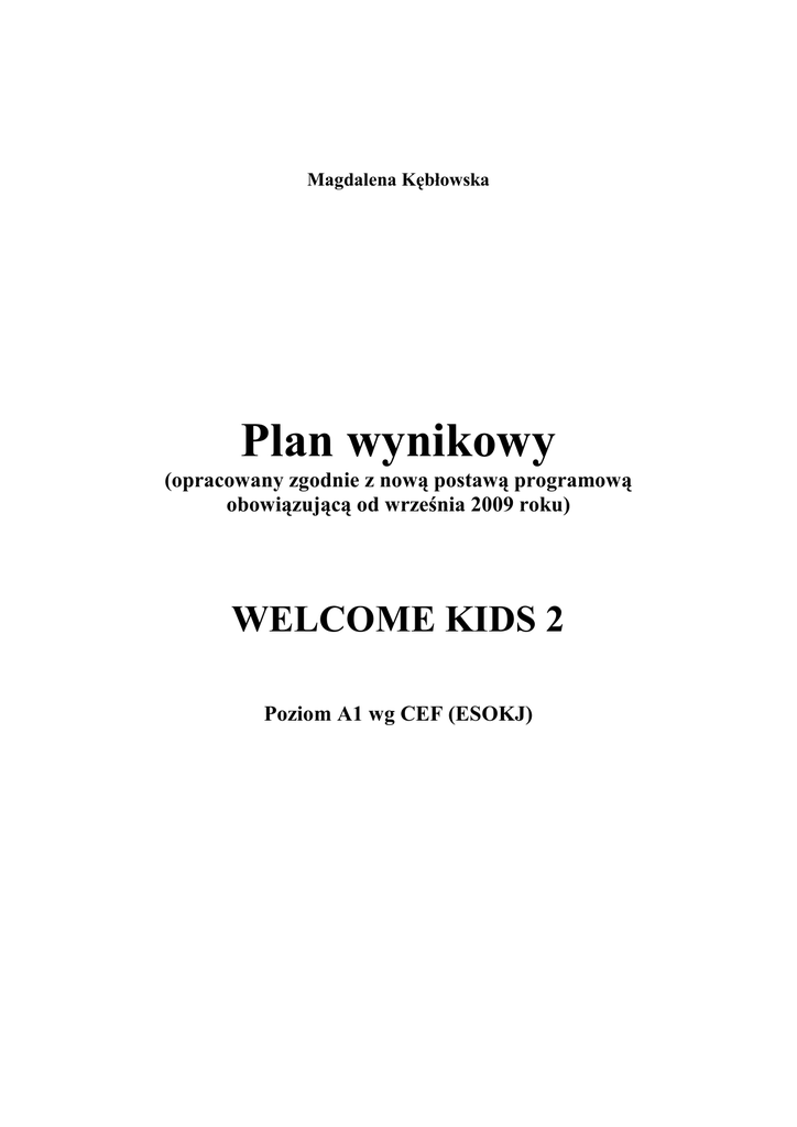 Magdalena Kębłowska Plan wynikowy (opracowany zgodnie z nową postawą programową obowiązującą od września 2009 roku) WELCOME KIDS 2 Poziom A1 wg CEF (ESOKJ) Wstęp 1. Czym jest plan wynikowy Powtarzając za H. Komorowską, za podstawową zmianę, jaka powinna dokonać się w systemie edukacji w Polsce, naleŜy uwaŜać „ukierunkowanie działań dydaktycznych na osobę ucznia, a nie na osobę nauczyciela” (2000:5)1. Plan wynikowy, który określa o c z e k i w a n e o s i ą g n i ę c i a u c z n i ó w po przerobieniu danej partii materiału, znakomicie spełnia ten warunek i pozostaje w zgodzie z postulatem podejścia skoncentrowanego na uczniu (learner-centeredness). Tak skonstruowany, stanowi nieocenioną pomoc w wielu aspektach pracy nauczyciela. Po pierwsze, pozwala zaplanować zajęcia, przygotować dodatkowe materiały i ćwiczenia, pomoce wizualne, tematy prac projektowych itp. zarówno na najbliŜszy tydzień, jak i na cały rok szkolny, a nawet na koniec danego etapu edukacyjnego. W ten sposób przyczynia się do bardziej spójnego i lepiej zorganizowanego procesu dydaktycznego. Po drugie, jest szczególnie przydatny przy opracowywaniu testów i kartkówek, poniewaŜ pomaga wyznaczyć właściwe kryteria oceny. Dzięki temu moŜe się równieŜ okazać pomocny w kontaktach nauczyciela z rodzicami, dla których jasno sformułowane w planie wynikowym umiejętności i wiedza są bardziej czytelne niŜ spis treści w języku obcym w podręczniku. Rodzice mogą się takŜe zainteresować planem wynikowym, by wiedzieć, jak pracować z dzieckiem w domu, czy jakie materiały mu dostarczyć, by wspomóc pracę nauczyciela, a tym samym przyczynić się do większej niezaleŜności ucznia. Sami uczniowie, zwłaszcza na wyŜszych poziomach, mogą docenić plan wynikowy przy wytyczaniu i realizowaniu swoich celów. Wreszcie będzie plan wynikowy wskazówką dla nauczycieli innych przedmiotów w procesie integracji wiedzy i umiejętności. 1 Komorowska, H. 2000. „Nowe tendencje w nauczaniu języków obcych.” W: Komorowska, H. (red.). 2000. Nauczanie języków obcych w zreformowanej szkole. Warszawa: IBE. 2 2. Plan wynikowy do podręcznika Welcome Kids 2 (Podręcznik ucznia, Zeszyt ćwiczeń ucznia, Zestaw płyt CD) 2.1. Cele podręcznika Welcome Kids 1 jest przeznaczony do nauczania dzieci wczesnoszkolnych. Zasadniczym celem podręcznika jest nauka słów oraz prostych struktur gramatycznych zaprezentowanych w nieskomplikowanych dialogach. Dzieci mają okazję do rozwoju podstawowych umiejętności komunikacyjnych w prostych konwersacjach z kolegami, a bliska uczniowi tematyka kursu (np. rodzina, szkoła, zabawki) sprzyja wyraŜaniu ich uczuć, myśli i pragnień. Welcome Kids 2 koncentruje się na rozwoju sprawności słuchania i mówienia oraz uczy pisania i czytania prostych wyrazów, a następnie całych zdań i krótkich, prostych tekstów. 2.2. Organizacja Planu PoniŜszy plan wynikowy podzielony został na u m i e j ę t n o ś c i r e c e p t y w n e, a więc związane ze słuchaniem i czytaniem, a takŜe z bierną znajomością słów, wyraŜeń lub zwrotów, oraz p r o d u k t y w n e, czyli co uczeń potrafi powiedzieć czy narysować. Te ostatnie podzielono z kolei na n i e w e r b a l n e (rysowanie, kolorowanie, wycinanie kształtów) oraz w e r b a l n e (wypowiadanie słów, krótkich zdań, zadawanie pytań i udzielanie odpowiedzi). Zgodnie z zasadą integracji sprawności, w czasie jednej jednostki lekcyjnej, a nawet pojedynczych ćwiczeń, wiele zadań będzie wymagało zarówno udziału umiejętności receptywnych (np. słuchania), jak i produktywnych (np. zaznaczenia odpowiedniego obrazka). W takich wypadkach daną umiejętność przyporządkowano do sprawności bardziej złoŜonej i wymagającej intelektualnie większego wysiłku ze strony ucznia. W celu ułatwienia nauczycielowi określenia właściwych kryteriów oceny postępów dzieci Plan proponuje zastosowanie kategoryzacji wg taksonomii prof. Niemierki w odniesieniu do umiejętności receptywnych oraz produktywnych werbalnych. I tak jako kategorię A oznaczono zapamiętywanie i rozpoznawanie wiadomości zwłaszcza leksykalnych (np. dziecko potrafi rozpoznać usłyszane nazwy zwierząt) oraz odtworzyć z pamięci słówka, wierszyki czy piosenki. Umiejętności zakwalifikowane do kategorii B wymagają myślenia, a więc dla dziecka w wieku 6-9 lat będą obejmowały np. nazywanie ludzi, zwierząt itp. na obrazku, rozumienie pytań i udzielanie odpowiedzi na podstawie wzoru lub podanych informacji, uzupełnianie zdań na podstawie obrazka itp. Kategoria C to stosowanie wiadomości w określonych sytuacjach komunikacyjnych. Znajdziemy 3 tu czytanie i słuchanie ze zrozumieniem (np. dialogu, piosenki) oraz umiejętności związane z komunikacją ustną i pisemną w sytuacjach, kiedy dziecko samo decyduje o wyborze treści, a nie jedynie powtarza lub odwzorowuje przykłady z podręcznika (np. opisuje narysowany przez siebie obrazek, odpowiada na pytania o swoje umiejętności itp.). Plan proponuje takŜe rozwój umiejętności na p o z i o m i e p o d s t a w o w y m, a więc odpowiednim dla przeciętnego ucznia, oraz oddzielnie wyszczególnionym p o z i o m i e p o n a d p o d s t a w o w y m, skierowanym do ucznia bardziej samodzielnego, znajdującego się na poziomie wyŜszym niŜ przeciętny. Dodatkowo dla lepszej przejrzystości planu podano osobno i gramatyczne k a t e g o r i e l e k s y k a l n e dla kaŜdego modułu. Pamiętać jednak naleŜy, iŜ na tym etapie nauczania zarówno słownictwo, jak i gramatyka powinny być realizowane w ramach opisanych powyŜej umiejętności (które je uwzględniają), nie zaś jako odrębne kategorie. Pod tabelą z umiejętnościami ucznia umieszczono tabelę z wytycznymi Podstawy programowej, które moŜna realizować w ramach danego modułu. Zawiera ona szereg istotnych elementów, dzięki którym proces nauczania/ uczenia się staje się bardziej aktualn