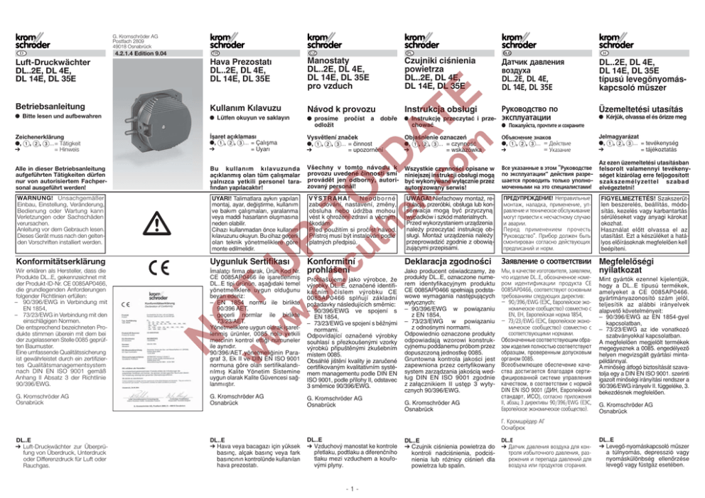 G. Kromschröder AG Postfach 2809 49018 Osnabrück D Luft-Druckwächter DL..2E, DL 4E, DL 14E, DL 35E 4.2.1.4 Edition 9.04 TR Hava Prezostat∂ DL..2E, DL 4E, DL 14E, DL 35E PL CZ Manostaty DL..2E, DL 4E, DL 14E, DL 35E pro vzduch DL..2E, DL 4E, DL 14E, DL 35E Instrukcja obs∏ugi ObjaÊnienie oznaczeƒ ●, , , ... = czynnoÊç ➔ = wskazówka ●, , , ... = ; ➔ = < Betriebsanleitung Kullan∂m K∂lavuzu ● Bitte lesen und aufbewahren Návod k provozu ● Lütfen okuyun ve saklay∂n ● prosíme odloÏit Zeichenerklärung ●, , , ... = Tätigkeit ➔ = Hinweis ∑µaret aç∂klamas∂ ●, , , ... = Çal∂µma ➔ = Uyar∂ Vysvûtlení znaãek ●, , , ... = ãinnost ➔ = upozornûní Alle in dieser Betriebsanleitung aufgeführten Tätigkeiten dürfen nur von autorisiertem Fachpersonal ausgeführt werden! Bu kullan∂m k∂lavuzunda V‰echny v tomto návodu k Wszystkie czynnoÊci opisane w aç∂klanm∂µ olan tüm çal∂µmalar provozu uvedené ãinnosti smí niniejszej instrukcji obs∏ugi mogà yaln∂zca yetkili personel tara- provádût jen odborn˘, autori- byç wykonywane wy∏àcznie przez zovan˘ personál! autoryzowany serwis! f∂ndan yap∂lacakt∂r! WARNUNG! Unsachgemäßer Einbau, Einstellung, Veränderung, Bedienung oder Wartung kann Verletzungen oder Sachschäden verursachen. Anleitung vor dem Gebrauch lesen. Dieses Gerät muss nach den geltenden Vorschriften installiert werden. UYARI! Talimatlara ayk∂r∂ yap∂lan montaj, ayar, deπiµtirme, kullan∂m ve bak∂m çal∂µmalar∂, yaralanma veya maddi hasarlar∂n oluµmas∂na neden olabilir. Cihaz∂ kullanmadan önce kullan∂m k∂lavuzunu okuyun. Bu cihaz geçerli olan teknik yönetmeliklere göre monte edilmelidir. Konformitätserklärung Uygunluk Sertifikas∂ Wir erklären als Hersteller, dass die Produkte DL..E, gekennzeichnet mit der Produkt-ID-Nr. CE 0085AP0466, die grundlegenden Anforderungen folgender Richtlinien erfüllen: – 90/396/EWG in Verbindung mit EN 1854, – 73/23/EWG in Verbindung mit den einschlägigen Normen. Die entsprechend bezeichneten Produkte stimmen überein mit dem bei der zugelassenen Stelle 0085 geprüften Baumuster. Eine umfassende Qualitätssicherung ist gewährleistet durch ein zertifiziertes Qualitätsmanagementsystem nach DIN EN ISO 9001 gemäß Anhang II Absatz 3 der Richtlinie 90/396/EWG. ∑malatç∂ firma olarak, Ürün Kod Nr. CE 0085AP0466 ile iµaretlenmiµ DL..E tipi ürünün, aµaπ∂daki temel yönetmeliklere uygun olduπunu beyan ederiz: – EN 1854 normu ile birlikte 90/396 AET, – geçerli normlar ile birlikte 73/23/AET. Yönetmeliklere uygun olarak iµaretlenmiµ ürünler, 0085 nolu yetkili mercinin kontrol ettiπi numuneler ile ayn∂d∂r. 90/396/AET yönetmeliπinin Paragraf 3, Ek II ve DIN EN ISO 9001 normuna göre olan sertifikaland∂r∂lm∂µ Kalite Yönetim Sistemine uygun olarak Kalite Güvencesi saπlanm∂∂µt∂r. G. Kromschröder AG Osnabrück G. Kromschröder AG Osnabrück proãíst a dobfie V¯STRAHA! Neodborné zabudování, nastavení, zmûny, obsluha nebo údrÏba mohou vést k ohroÏení zdraví a vûcn˘m ‰kodám. Pfied pouÏitím si proãíst návod. Pfiístroj musí b˘t instalován podle platn˘ch pfiedpisÛ. Konformitní prohlá‰ení Prohla‰ujeme jako v˘robce, Ïe v˘robky DL..E, oznaãené identifikaãním ãíslem v˘robku CE 0085AP0466 splÀují základní poÏadavky následujících smûrnic: – 90/396/EWG ve spojení s EN 1854, – 73/23/EWG ve spojení s bûÏn˘mi normami. Odpovídající oznaãené v˘robky souhlasí s pfiezkou‰en˘mi vzorky v˘robkÛ pfiipu‰tûn˘mi zku‰ebním místem 0085. Obsáhlé ji‰tûní kvality je zaruãené certifikovan˘m kvalitativním systémem managementu podle DIN EN ISO 9001, podle pfiílohy II, odstavec 3 smûrnice 90/396/EWG. G. Kromschröder AG Osnabrück RUS Czujniki ciÊnienia powietrza DL..2E, DL 4E, DL 14E, DL 35E ● Instrukcj´ przeczytaç i prze- chowaç ● , H DL..2E, DL 4E, DL 14E, DL 35E típusú levegœnyomáskapcsoló mæszer Üzemeltetési utasítás ● Kérjük, olvassa el és œrizze meg Jelmagyarázat ●, , , ... = tevékenység ➔ = tájékoztatás Az ezen üzemeltetési utasításban ! “ felsorolt valamennyi tevékeny ” - séget kizárólag erre feljogosított " # # - szakszemélyzettel szabad !! !! elvégeztetni! UWAGA! Niefachowy monta˝, regulacja, przeróbki, obs∏uga lub konserwacja mogà byç przyczynà wypadków i szkód materialnych. Przed wykorzystaniem urzàdzenia nale˝y przeczytaç instrukcj´ obs∏ugi. Monta˝ urzàdzenia nale˝y przeprowadziç zgodnie z obowiàzujàcymi przepisami. %&%'%()%! " > #, , , # . ? > "B“. ? # > . Deklaracja zgodnoÊci Megfelelœségi , , , nyilatkozat Jako producent oÊwiadczamy, ˝e produkty DL..E, oznaczone numerem identyfikacyjnym produktu CE 0085AP0466 spe∏niajà podstawowe wymagania nast´pujàcych wytycznych: – 90/396/EWG w powiàzaniu z EN 1854, – 73/23/EWG w powiàzaniu z odnoÊnymi normami. Odpowiednio oznaczone produkty odpowiadajà wzorowi konstrukcyjnemu poddanemu próbom przez dopuszczonà jednostk´ 0085. Gruntowna kontrola jakoÊci jest zapewniona przez certyfikowany system zarzàdzania jakoÊcià wed∏ug DIN EN ISO 9001 zgodnie z za∏àcznikiem II ust´p 3 wytycznych 90/396/EWG. G. Kromschröder AG Osnabrück DL..E, 0085AP0466, : – 90/396/EWG (, ! ) EN, ", 1854, – 73/23/EWG (, ! ) . Обозначенные соответствующим образом изделия полностью соответствуют образцам, проверенным допусковым органом 0085. Всеобъемлющее обеспечение качества достигается благодаря сертифицированной системе управления качеством, в соответствии с нормой DIN ЕN ISO 9001 (ДИН, Европейский стандарт, ИСО), # II, 3 90/396/EWG (, ! ). FIGYELMEZTETÉS! Szakszer