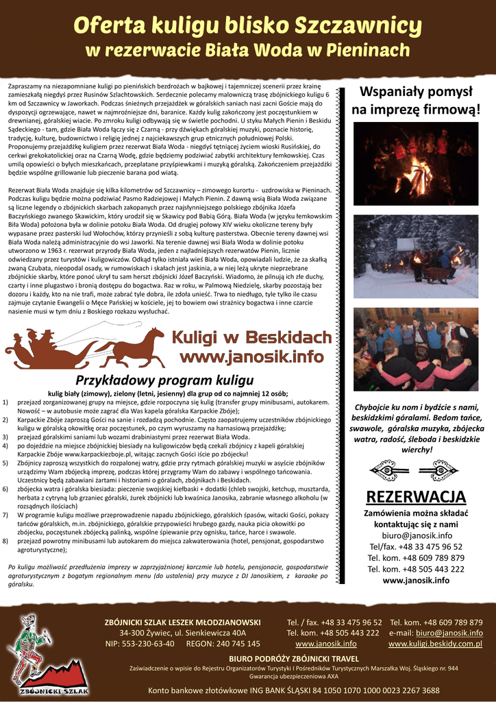 Oferta kuligu blisko Szczawnicy w rezerwacie Biała Woda w Pieninach Zapraszamy na niezapomniane kuligi po pienińskich bezdrożach w bajkowej i tajemniczej scenerii przez krainę zamieszkałą niegdyś przez Rusinów Szlachtowskich. Serdecznie polecamy malowniczą trasę zbójnickiego kuligu 6 km od Szczawnicy w Jaworkach. Podczas śnieżnych przejażdżek w góralskich saniach nasi zacni Goście mają do dyspozycji ogrzewające, nawet w najmroźniejsze dni, baranice. Każdy kulig zakończony jest poczęstunkiem w drewnianej, góralskiej wiacie. Po zmroku kuligi odbywają się w świetle pochodni. U styku Małych Pienin i Beskidu Sądeckiego - tam, gdzie Biała Woda łączy się z Czarną - przy dźwiękach góralskiej muzyki, poznacie historię, tradycję, kulturę, budownictwo i religię jednej z najciekawszych grup etnicznych południowej Polski. Proponujemy przejażdżkę kuligiem przez rezerwat Biała Woda - niegdyś tętniącej życiem wioski Rusińskiej, do cerkwi grekokatolickiej oraz na Czarną Wodę, gdzie będziemy podziwiać zabytki architektury łemkowskiej. Czas umilą opowieści o byłych mieszkańcach, przeplatane przyśpiewkami i muzyką góralską. Zakończeniem przejażdżki będzie wspólne grillowanie lub pieczenie barana pod wiatą. Wspaniały pomysł na imprezę firmową! Rezerwat Biała Woda znajduje się kilka kilometrów od Szczawnicy – zimowego kurortu - uzdrowiska w Pieninach. Podczas kuligu będzie można podziwiać Pasmo Radziejowej i Małych Pienin. Z dawną wsią Biała Woda związane są liczne legendy o zbójnickich skarbach zakopanych przez najsłynniejszego polskiego zbójnika Józefa Baczyńskiego zwanego Skawickim, który urodził się w Skawicy pod Babią Górą. Biała Woda (w języku łemkowskim Biła Woda) położona była w dolinie potoku Biała Woda. Od drugiej połowy XIV wieku okoliczne tereny były wypasane przez pasterski lud Wołochów, którzy przynieśli z sobą kulturę pasterstwa. Obecnie tereny dawnej wsi Biała Woda należą administracyjnie do wsi Jaworki. Na terenie dawnej wsi Biała Woda w dolinie potoku utworzono w 1963 r. rezerwat przyrody Biała Woda, jeden z najładniejszych rezerwatów Pienin, licznie odwiedzany przez turystów i kuligowiczów. Odkąd tylko istniała wieś Biała Woda, opowiadali ludzie, że za skałką zwaną Czubata, nieopodal osady, w rumowiskach i skałach jest jaskinia, a w niej leżą ukryte nieprzebrane zbójnickie skarby, które ponoć ukrył tu sam herszt zbójnicki Józef Baczyński. Wiadomo, że pilnują ich złe duchy, czarty i inne plugastwo i bronią dostępu do bogactwa. Raz w roku, w Palmową Niedzielę, skarby pozostają bez dozoru i każdy, kto na nie trafi, może zabrać tyle dobra, ile zdoła unieść. Trwa to niedługo, tyle tylko ile czasu zajmuje czytanie Ewangelii o Męce Pańskiej w kościele, jej to bowiem owi strażnicy bogactwa i inne czarcie nasienie musi w tym dniu z Boskiego rozkazu wysłuchać. Przykładowy program kuligu 1) 2) 3) 4) 5) 6) 7) 8) kulig biały (zimowy), zielony (letni, jesienny) dla grup od co najmniej 12 osób; przejazd zorganizowanej grupy na miejsce, gdzie rozpoczyna się kulig (transfer grupy minibusami, autokarem. Nowość – w autobusie może zagrać dla Was kapela góralska Karpackie Zbóje); Karpackie Zbóje zaproszą Gości na sanie i rozdadzą pochodnie. Często zaopatrujemy uczestników zbójnickiego kuligu w góralską okowitkę oraz poczęstunek, po czym wyruszamy na harnasiową przejażdżkę; przejazd góralskimi saniami lub wozami drabiniastymi przez rezerwat Biała Woda. po dojeździe na miejsce zbójnickiej biesiady na kuligowiczów będą czekali zbójnicy z kapeli góralskiej Karpackie Zbóje www.karpackiezboje.pl, witając zacnych Gości iście po zbójecku! Zbójnicy zaproszą wszystkich do rozpalonej watry, gdzie przy rytmach góralskiej muzyki w asyście zbójników urządzimy Wam zbójecką imprezę, podczas której przygramy Wam do zabawy i wspólnego tańcowania. Uczestnicy będą zabawiani żartami i historiami o góralach, zbójnikach i Beskidach. zbójecka watra i góralska biesiada: pieczenie swojskiej kiełbaski + dodatki (chleb swojski, ketchup, musztarda, herbata z cytryną lub grzaniec góralski, żurek zbójnicki lub kwaśnica Janosika, zabranie własnego alkoholu (w rozsądnych ilościach) W programie kuligu możliwe przeprowadzenie napadu zbójnickiego, góralskich śpasów, witacki Gości, pokazy tańców góralskich, m.in. zbójnickiego, góralskie przypowieści hrubego gazdy, nauka picia okowitki po zbójecku, poczęstunek zbójecką palinką, wspólne śpiewanie przy ognisku, tańce, harce i swawole. przejazd powrotny minibusami lub autokarem do miejsca zakwaterowania (hotel, pensjonat, gospodarstwo agroturystyczne); Chybojcie ku nom i bydźcie s nami, beskidzkimi góralami. Bedom tańce, swawole, góralska muzyka, zbójecka watra, radość, śleboda i beskidzkie wierchy! Po kuligu możliwość przedłużenia imprezy w zaprzyjaźnionej karczmie lub hotelu, pensjonacie, gospodarstwie agroturystycznym z bogatym regionalnym menu (do ustalenia) przy muzyce z DJ Janosikiem, z karaoke po góralsku. ZBÓJNICKI SZLAK LESZEK MŁODZIANOWSKI 34-300 Żywiec, ul. Sienkiewicza 40A NIP: 553-230-63-40 REGON: 240 745 145 REZERWACJA Zamówienia można składać kontaktując się z nami [email protected] Tel/fax. +48 33 475 96 52 Tel. kom. +48 609 789 879 Tel. kom. +48 505 443 222 www.janosik.info Tel. / fax. +48 33 475 96 52 Tel. kom. +48 609 789 879 Tel. kom. +48 505 443 222 e-mail: [email protected] www.janosik.info www.kuligi.beskidy.com.pl BIURO PODRÓŻY ZBÓJNICKI TRAVEL Zaświadczenie o wpisie do Rejestru Organizatorów Turystyki I Pośredników Turystycznych Marszałka Woj. Śląskiego nr. 944 Gwarancja ubezpieczeniowa AXA Konto bankowe złotówkowe ING BANK ŚLĄSKI 84 1050 1070 1000 0023 2267 3688 Oferta kuligu blisko Szczawnicy w rezerwacie Biała Woda w Pieninach Trasa zbójnickiego kuligu prowadzi z zaprzyjaźnionego ośro
