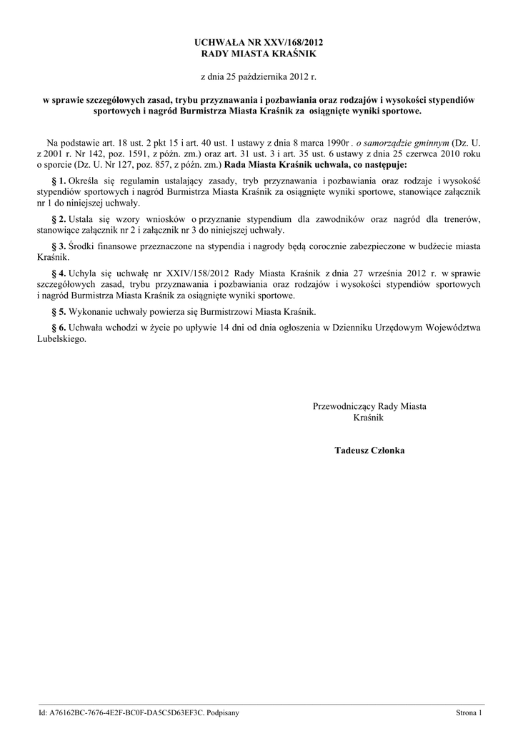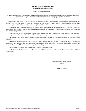 UCHWAŁA NR XXV/168/2012 RADY MIASTA KRAŚNIK z dnia 25 października 2012 r. w sprawie szczegółowych zasad, trybu przyznawania i pozbawiania oraz rodzajów i wysokości stypendiów sportowych i nagród Burmistrza Miasta Kraśnik za osiągnięte wyniki sportowe. Na podstawie art. 18 ust. 2 pkt 15 i art. 40 ust. 1 ustawy z dnia 8 marca 1990r . o samorządzie gminnym (Dz. U. z 2001 r. Nr 142, poz. 1591, z późn. zm.) oraz art. 31 ust. 3 i art. 35 ust. 6 ustawy z dnia 25 czerwca 2010 roku o sporcie (Dz. U. Nr 127, poz. 857, z późn. zm.) Rada Miasta Kraśnik uchwala, co następuje: § 1. Określa się regulamin ustalający zasady, tryb przyznawania i pozbawiania oraz rodzaje i wysokość stypendiów sportowych i nagród Burmistrza Miasta Kraśnik za osiągnięte wyniki sportowe, stanowiące załącznik nr 1 do niniejszej uchwały. § 2. Ustala się wzory wniosków o przyznanie stypendium dla zawodników oraz nagród dla trenerów, stanowiące załącznik nr 2 i załącznik nr 3 do niniejszej uchwały. § 3. Środki finansowe przeznaczone na stypendia i nagrody będą corocznie zabezpieczone w budżecie miasta Kraśnik. § 4. Uchyla się uchwałę nr XXIV/158/2012 Rady Miasta Kraśnik z dnia 27 września 2012 r. w sprawie szczegółowych zasad, trybu przyznawania i pozbawiania oraz rodzajów i wysokości stypendiów sportowych i nagród Burmistrza Miasta Kraśnik za osiągnięte wyniki sportowe. § 5. Wykonanie uchwały powierza się Burmistrzowi Miasta Kraśnik. § 6. Uchwała wchodzi w życie po upływie 14 dni od dnia ogłoszenia w Dzienniku Urzędowym Województwa Lubelskiego. Przewodniczący Rady Miasta Kraśnik Tadeusz Członka ————————————————————————————————————————————————————————— Id: A76162BC-7676-4E2F-BC0F-DA5C5D63EF3C. Podpisany Strona 1 Załącznik Nr 1 do Uchwały Nr XXV/168/2012 Rady Miasta Kraśnik z dnia 25 października 2012 r. Regulamin ustalający zasady, tryb przyznawania i pozbawiania oraz rodzaje i wysokość stypendiów sportowych i nagród Burmistrza Miasta Kraśnik za osiągnięte wyniki sportowe. § 1. Niniejsze zasady określają: 1) stypendia sportowe dla zawodników zwane dalej stypendiami za osiągnięte wyniki sportowe, 2) nagrody dla trenerów prowadzących szkolenie zawodników osiągających wysokie wyniki sportowe w międzynarodowym i krajowym współzawodnictwie sportowym. § 2. 1. Ustanawia się stypendia dla zawodników za wysokie wyniki sportowe w międzynarodowym lub krajowym współzawodnictwie sportowym, w dyscyplinach lub konkurencjach objętych programem ogólnopolskiego współzawodnictwa sportowego dzieci i młodzieży w ramach Systemu Sportu Młodzieżowego. 2. Stypendia mają na celu wspieranie rozwoju zawodników szczególnie uzdolnionych sportowo. § 3. Stypendium przyznane jest raz w danym roku kalendarzowym i jest wypłacane jednorazowo. § 4. Stypendium może otrzymać zawodnik będący mieszkańcem Miasta Kraśnik. § 5. Stypendium może otrzymać zawodnik, który spełnia następujące warunki: 1) spełnia przynajmniej jedno kryterium sportowe wymienione w § 6, w konkurencjach i dyscyplinach występujących w Systemie Współzawodnictwa Dzieci i Młodzieży – Polskiej Federacji Sportu Młodzieżowego. 2) wywiązuje się z podstawowych obowiązków sportowca i przestrzega powszechnie obowiązujących norm społecznych. § 6. 1. Stypendium może otrzymać zawodnik, który spełnia przynajmniej jedno z poniższych kryteriów: 1) Pierwszego stopnia ( 2000 - 3000 PLN ): a) jest medalistą Mistrzostw Świata lub Mistrzostw Europy ( grupy wiekowe od juniora młodszego do seniora włącznie); b) reprezentował Kraj podczas Igrzysk Olimpijskich. 2) Drugiego stopnia ( 1000 - 1500 PLN ): a) jest członkiem kadry narodowej; b) jest posiadaczem jednej z klas sportowych : mistrzowskiej międzynarodowej ( MM ) mistrzowskiej ( M ) lub pierwszej ( I ); c) jest członkiem drużyny, która osiągnęła lokatę 1-8 w Mistrzostwach Polski ( grupy wiekowe od juniora młodszego do seniora włącznie) organizowanych przez odpowiedni Polski Związek Sportowy, spośród 4 dyscyplin – piłka nożna, piłka siatkowa, piłka ręczna i koszykówka; d) jest medalistą Mistrzostw Polski, Ogólnopolskiej Olimpiady Młodzieży ( grupy wiekowe od juniora młodszego do seniora włącznie). 3) Trzeciego stopnia ( 300 - 500 PLN ): a) jest członkiem kadry województwa ( grupy wiekowe od juniora młodszego do seniora włącznie); b) jest posiadaczem drugiej ( II ) klasy sportowej; ————————————————————————————————————————————————————————— Id: A76162BC-7676-4E2F-BC0F-DA5C5D63EF3C. Podpisany Strona 1 c) jest członkiem drużyny, która osiągnęła awans do półfinałów Mistrzostw Polski ( grupy wiekowe od młodzika do seniora włącznie) organizowanych przez odpowiedni Polski Związek Sportowy, spośród 4 dyscyplin – piłka nożna, piłka siatkowa, piłka ręczna i koszykówka; d) jest medalistą Międzywojewódzkich Mistrzostw Młodzików; e) zdobył miejsce 4-8 Mistrzostw Polski, Ogólnopolskiej Olimpiady Młodzieży ( grupy wiekowe od juniora młodszego do seniora włącznie) lub w pływaniu plasuje się do 8 miejsca w rankingu ogólnopolskim. 2. W grach zespołowych stypendium może otrzymać maksymalnie 150% składu osobowego zawodników występujących na boisku zgodnie z regulaminem dyscypliny. 3. W przypadku osiągnięcia przez zawodnika dwóch lub więcej wysokich wyników sportowych, o których mowa w ust 1 , zawodnikowi przysługuje stypendium za najwyższe osiągnięcie. § 7. Wysokość stypendium ustala się następująco: 1) 2000 - 3000 zł– dla zawodnika, który osiągnął wynik pierwszego stopnia, 2) 1000 - 1500 zł dla zawodnika, który osiągnął wynik drugiego stopnia, 2) 300 - 500 zł – dla zawodnika, który osi