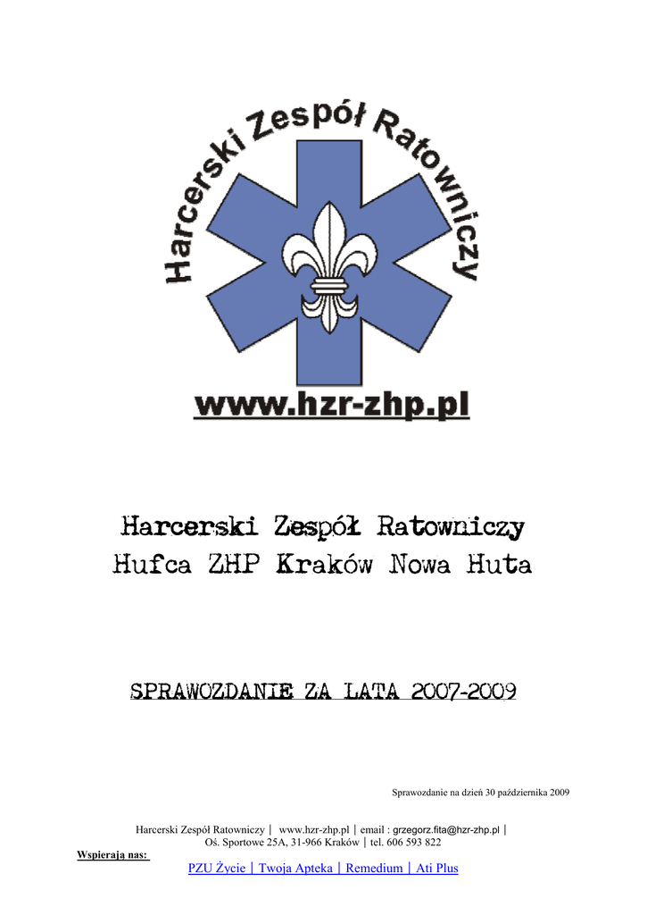 Harcerski Zespół Ratowniczy Hufca ZHP Kraków Nowa Huta SPRAWOZDANIE ZA LATA 2007 2007-2009 2009 Sprawozdanie na dzień 30 października 2009 Harcerski Zespół Ratowniczy| www.hzr-zhp.pl|email : [email protected]| Oś. Sportowe 25A, 31-966 Kraków|tel. 606 593 822 Wspierają nas: PZU Życie|Twoja Apteka|Remedium|Ati Plus 1. Charakterystyka Czym jest Harcerski Zespół Ratowniczy? Harcerski Zespół Ratowniczy jest klubem harcerskim, działającym ściśle wg kryteriów działalności drużyn i klubów specjalnościowych. HZR zrzesza harcerzy starszych oraz instruktorów, którzy nie mogą rozwijać swoich zainteresować z dziedziny ratownictwa i pierwszej pomocy w swoich macierzystych jednostkach. HZR działa przede wszystkim na terenie Nowej Huty. Cele i założenia HZR. Do głównych celów Harcerskiego Zespołu Ratowniczego należy prowadzenie działalności ratowniczej, prewencyjnej, szkoleniowej oraz edukacyjnej w zakresie szeroko rozumianego ratownictwa i profilaktyki bezpieczeństwa dla hufca Kraków Nowa Huta i wchodzących w jego skład szczepów i drużyn. Realizacja celów Nasze cele realizujemy poprzez: 1. Zabezpieczanie imprez hufca, szczepów i drużyn (biwaki, rajdy, biegi harcerskie) 2. Przygotowywanie profesjonalnych punktów na biegach harcerskich oraz gier ratowniczych 3. Przygotowywanie warsztatów i szkoleń dla kadr hufca, szczepów i drużyn 4. Współpraca z Zespołem Kadry Kształcącej hufca w zakresie przygotowywania zajęć na kursach drużynowych i zastępowych z zakresu pierwszej pomocy. 5. Wspieranie drużynowych i pomoc przy prowadzeniu zajęć z „samarytanki” 6. Organizacja kursów Pierwszej Pomocy oraz tzw. Brązowej Odznaki Ratownika ZHP dla członków hufca Nowa Huta Kadra Kadrę naszego zespołu tworzą obecnie osoby, które kończyły kursy organizowane przez Zespół: Szef zespołu: pwd. Grzegorz Fita Ratownik ZHP, instruktor potencjalny Polskiej i Europejskiej Rady Resuscytacji BLS/AED Zakres obowiązków: Koordynacja działań kadry Zespołu Reprezentacja Zespołu na zewnątrz hufca Pozyskiwanie nowych członków Zespołu Podjęcie wszelkich działań, które nie leżą w zakresie obowiązków pozostałych członków kadry Zespołu. Harcerski Zespół Ratowniczy| www.hzr-zhp.pl|email : [email protected]| Oś. Sportowe 25A, 31-966 Kraków|tel. 606 593 822 Wspierają nas: PZU Życie|Twoja Apteka|Remedium|Ati Plus Kierownik Sekcji ds. Pozyskiwania Środków: phm. Magdalena Soból Ratownik ZHP, członek hufcowego ZKK. Zakres obowiązków: Przygotowanie pisma Rozmowy ze sponsorami Przygotowanie oferty dla sponsorów Opieka nad sponsorami (wysyłanie życzeń, podziękowań, itp) Kierownik Sekcji ds. Kwatermistrzowskich: Dh. Paulina Adamska Ratownik ZHP. Zakres obowiązków: Pilnowanie sprzętu Dbanie o dobry stan sprzętu Dbanie o uzupełnianie apteczek Przygotowywanie list koniecznych zakupów Kierownik Sekcji ds. Organizacji Imprez: Dh. Karolina Ciastoń Ratownik ZHP. Zakres obowiązków: Zbieranie zamówień i zapotrzebowania na zabezpieczenie imprez Prowadzenie rozmów z klientami Organizacja zabezpieczeń (zebranie ludzi, przygotowanie miejsca imprezy, prowadzenie zabezpieczenia) Organizacja szkoleń (zebranie ludzi, przygotowanie programu na podstawie zapotrzebowania klienta) Kierownik Sekcji ds. Wyszkolenia: Dh. -atasza Leśniak Ratownik ZHP. Zakres obowiązków: Przygotowanie planu szkoleń na cały rok adekwatnie do wiedzy, umiejętności i doświadczenia członków Zespołu Przygotowanie zakresu tematycznego spotkania Zespołu Przygotowanie symulacji na spotkania Zespołu Harcerski Zespół Ratowniczy| www.hzr-zhp.pl|email : [email protected]| Oś. Sportowe 25A, 31-966 Kraków|tel. 606 593 822 Wspierają nas: PZU Życie|Twoja Apteka|Remedium|Ati Plus Rada HZR Wszystkie decyzje dotyczące działalności Zespołu, przyjmowania nowych członków, mianowania na funkcje, tworzenie planu pracy, itp. podejmuje zgodnie z zapisami Statutu HZR rada Harcerskiego Zespołu Ratowniczego. W skład Rady wchodzą wszyscy członkowie Zespołu posiadający status Ratownika HZR. Wyposażenie HZR Harcerski Zespół Ratowniczy posiada na wyposażeniu: 2 fantomy do nauki Resuscytacji Krążeniowo-Oddechowej Little Anne firmy Laerdal 3 apteczki plecakowe AP-20 firmy JanySport 11 apteczek osobistych AOM firmy JanySport Kołnierz ortopedyczny wielokrotnego użytku firmy AMBU Podkoszulki ratownicze Polary ratownicze Noże ratownicze 2 szt. noszy brezentowych Ciśnieniomierz elektroniczny Wyposażenie HZR pozwala na przeprowadzenie szkoleń i warsztatów dla członków hufca Nowa Huta. Harcerski Zespół Ratowniczy| www.hzr-zhp.pl|email : [email protected]| Oś. Sportowe 25A, 31-966 Kraków|tel. 606 593 822 Wspierają nas: PZU Życie|Twoja Apteka|Remedium|Ati Plus 2. Co było, czyli osiągnięcia HZR w poprzednich latach Organizacja 3 kursów pierwszej pomocy HSR dla harcerzy hufca W ciągu lat 2007-2009 HZR zorganizował 3 kursy pierwszej pomocy HSR. Dwa z nich (kursy letnie) odbyły się na terenie poligonu Szkoły Aspirantów PSP w Kościelcu. Trzeci, zimowy kurs, odbył się na terenie szkoły nr 104 na os. Wysokim. We wszystkich trzech kursach łącznie wzięło udział 52 harcerzy, z czego 10 nawiązało dalszą współpracę z Zespołem. Współpraca z jednostkami Hufca Przeprowadziliśmy zajęcia z pierwszej pomocy dla trzech drużyn naszego hufca oraz drużynowych podczas złazu hufca w Łazach w 2009 roku. Ponadto przeprowadziliśmy grę ratowniczą dla 7amiestnictwa Starszoharcerskiego oraz Wędrowniczego „Ruber Ignis”. Przygotowaliśmy poradnik pierwszej pomocy dla uczestników kursu drużynowych Alma Mater 2009. Podnoszenie prestiżu Zespołu Prestiż HZR ciągle jest podnoszony a marka coraz bardziej rozpoznawalna, dzięki zabezpieczaniu międzynarodowych imprez sportowych tj. III międzynarodowy turniej rugby - 7owa Huta 7's czy I Turniej Grand Prix w Siatkówce Plażowej Mężczyzn. Strona HZR jest wyświetlana na pierwszych stronach wyników 