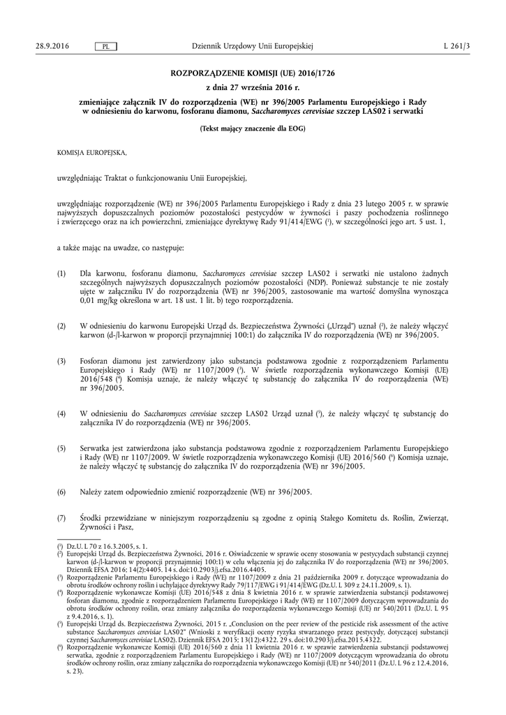 28.9.2016 Dziennik Urzędowy Unii Europejskiej PL L 261/3 ROZPORZĄDZENIE KOMISJI (UE) 2016/1726 z dnia 27 września 2016 r. zmieniające załącznik IV do rozporządzenia (WE) nr 396/2005 Parlamentu Europejskiego i Rady w odniesieniu do karwonu, fosforanu diamonu, Saccharomyces cerevisiae szczep LAS02 i serwatki (Tekst mający znaczenie dla EOG) KOMISJA EUROPEJSKA, uwzględniając Traktat o funkcjonowaniu Unii Europejskiej, uwzględniając rozporządzenie (WE) nr 396/2005 Parlamentu Europejskiego i Rady z dnia 23 lutego 2005 r. w sprawie najwyższych dopuszczalnych poziomów pozostałości pestycydów w żywności i paszy pochodzenia roślinnego i zwierzęcego oraz na ich powierzchni, zmieniające dyrektywę Rady 91/414/EWG (1), w szczególności jego art. 5 ust. 1, a także mając na uwadze, co następuje: (1) Dla karwonu, fosforanu diamonu, Saccharomyces cerevisiae szczep LAS02 i serwatki nie ustalono żadnych szczególnych najwyższych dopuszczalnych poziomów pozostałości (NDP). Ponieważ substancje te nie zostały ujęte w załączniku IV do rozporządzenia (WE) nr 396/2005, zastosowanie ma wartość domyślna wynosząca 0,01 mg/kg określona w art. 18 ust. 1 lit. b) tego rozporządzenia. (2) W odniesieniu do karwonu Europejski Urząd ds. Bezpieczeństwa Żywności („Urząd”) uznał (2), że należy włączyć karwon (d-/l-karwon w proporcji przynajmniej 100:1) do załącznika IV do rozporządzenia (WE) nr 396/2005. (3) Fosforan diamonu jest zatwierdzony jako substancja podstawowa zgodnie z rozporządzeniem Parlamentu Europejskiego i Rady (WE) nr 1107/2009 (3). W świetle rozporządzenia wykonawczego Komisji (UE) 2016/548 (4) Komisja uznaje, że należy włączyć tę substancję do załącznika IV do rozporządzenia (WE) nr 396/2005. (4) W odniesieniu do Saccharomyces cerevisiae szczep LAS02 Urząd uznał (5), że należy włączyć tę substancję do załącznika IV do rozporządzenia (WE) nr 396/2005. (5) Serwatka jest zatwierdzona jako substancja podstawowa zgodnie z rozporządzeniem Parlamentu Europejskiego i Rady (WE) nr 1107/2009. W świetle rozporządzenia wykonawczego Komisji (UE) 2016/560 (6) Komisja uznaje, że należy włączyć tę substancję do załącznika IV do rozporządzenia (WE) nr 396/2005. (6) Należy zatem odpowiednio zmienić rozporządzenie (WE) nr 396/2005. (7) Środki przewidziane w niniejszym rozporządzeniu są zgodne z opinią Stałego Komitetu ds. Roślin, Zwierząt, Żywności i Pasz, (1) Dz.U. L 70 z 16.3.2005, s. 1. (2) Europejski Urząd ds. Bezpieczeństwa Żywności, 2016 r. Oświadczenie w sprawie oceny stosowania w pestycydach substancji czynnej karwon (d-/l-karwon w proporcji przynajmniej 100:1) w celu włączenia jej do załącznika IV do rozporządzenia (WE) nr 396/2005. Dziennik EFSA 2016; 14(2):4405. 14 s. doi:10.2903/j.efsa.2016.4405. 3 ( ) Rozporządzenie Parlamentu Europejskiego i Rady (WE) nr 1107/2009 z dnia 21 października 2009 r. dotyczące wprowadzania do obrotu środków ochrony roślin i uchylające dyrektywy Rady 79/117/EWG i 91/414/EWG (Dz.U. L 309 z 24.11.2009, s. 1). (4) Rozporządzenie wykonawcze Komisji (UE) 2016/548 z dnia 8 kwietnia 2016 r. w sprawie zatwierdzenia substancji podstawowej fosforan diamonu, zgodnie z rozporządzeniem Parlamentu Europejskiego i Rady (WE) nr 1107/2009 dotyczącym wprowadzania do obrotu środków ochrony roślin, oraz zmiany załącznika do rozporządzenia wykonawczego Komisji (UE) nr 540/2011 (Dz.U. L 95 z 9.4.2016, s. 1). (5) Europejski Urząd ds. Bezpieczeństwa Żywności, 2015 r. „Conclusion on the peer review of the pesticide risk assessment of the active substance Saccharomyces cerevisiae LAS02” (Wnioski z weryfikacji oceny ryzyka stwarzanego przez pestycydy, dotyczącej substancji czynnej Saccharomyces cerevisiae LAS02). Dziennik EFSA 2015; 13(12):4322. 29 s. doi:10.2903/j.efsa.2015.4322. (6) Rozporządzenie wykonawcze Komisji (UE) 2016/560 z dnia 11 kwietnia 2016 r. w sprawie zatwierdzenia substancji podstawowej serwatka, zgodnie z rozporządzeniem Parlamentu Europejskiego i Rady (WE) nr 1107/2009 dotyczącym wprowadzania do obrotu środków ochrony roślin, oraz zmiany załącznika do rozporządzenia wykonawczego Komisji (UE) nr 540/2011 (Dz.U. L 96 z 12.4.2016, s. 23). L 261/4 PL Dziennik Urzędowy Unii Europejskiej 28.9.2016 PRZYJMUJE NINIEJSZE ROZPORZĄDZENIE: Artykuł 1 W załączniku IV do rozporządzenia (WE) nr 396/2005 dodaje się w kolejności alfabetycznej pozycje w brzmieniu: „fosforan diamonu” „karwon (*) (*) W momencie włączenia do załącznika IV zalecenie Europejskiego Urzędu ds. Bezpieczeństwa Żywności odnosi się do obecnych zastosowań. Jeżeli przewiduje się nowe zastosowania, wpływ na poziom narażenia konsumentów musi zostać ponownie rozpatrzony przez upoważniające państwo członkowskie.” „Saccharomyces cerevisiae szczep LAS02” „serwatka”. Artykuł 2 Niniejsze rozporządzenie wchodzi w życie dwudziestego dnia po jego opublikowaniu w Dzienniku Urzędowym Unii Europejskiej. Niniejsze rozporządzenie wiąże w całości i jest bezpośrednio stosowane we wszystkich państwach członkowskich. Sporządzono w Brukseli dnia 27 września 2016 r. W imieniu Komisji Jean-Claude JUNCKER Przewodniczący