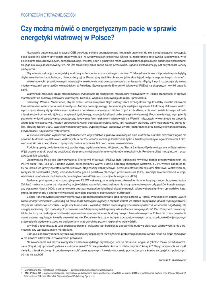 Postrzeganie teraźniejszości Czy można mówić o energetycznym pacie w sprawie energetyki wiatrowej w Polsce? Nazywanie patem sytuacji w części OZE polskiego sektora energetycznego i regułach prawnych do niej się odnoszących występuje dość często nie tylko w artykułach prasowych, ale i w wypowiedziach ekspertów. Słowo to, zaczerpnięte ze słownika szachowego, w tej pięknej grze dla ludzi myślących, oznacza sytuację, w której jeden z graczy nie może wykonać żadnego posunięcia zgodnego z przepisami, ale jego król nie jest szachowany, tzn. nie jest atakowany przez żadną bierkę przeciwnika. Zgodnie z zasadami gry pat natychmiast kończy partię remis. Czy obecna sytuacja z energetyką wiatrową w Polsce ma coś wspólnego z remisem? Zdecydowanie nie. Odpowiedniejsze byłyby chyba określenia chaos, bałagan, niemoc decyzyjna. Przyjrzyjmy się kilku objawom, jakie skłaniają do użycia wspomnianych określeń. Wokół nowych i przewidywanych inwestycji w elektrownie wiatrowe panuje spore zamieszanie. Między innymi rozpoczęła się wojna między władzami samorządów wojewódzkich a Polskiego Stowarzyszenia Energetyki Wiatrowej (PSEW) na ekspertyzy i wyniki badania opinii. Warmińsko-mazurski urząd marszałkowski wystosował do wszystkich marszałków województw w Polsce stanowisko w sprawie moratorium1) na budowę elektrowni wiatrowych. Ci z kolei wspólnie skierowali je do rządu i prezydenta. Samorząd Warmii i Mazur chce, aby do czasu uchwalenia przez Sejm ustawy, która szczegółowo regulowałaby kwestie lokowania farm wiatraków, wstrzymano takie inwestycje. Autorzy zwracają uwagę, że samorządy wydające zgodę na lokalizację elektrowni wiatrowych często kierują się spodziewanym zyskiem z podatków, stanowiącym istotną część ich budżetu, a nie rzeczywistą troską o zdrowie mieszkańców i ochronę krajobrazu w sytuacji żywiołowego rozwoju lokalizacji dużej energetyki wiatrowej. Podstawę takiego wystąpienia stanowiły wnioski opracowania dotyczącego lokowania farm elektrowni wiatrowych na Warmii i Mazurach, wykonanego na zlecenie władz tego województwa. Autorzy opracowania wzięli pod uwagę kryteria takie, jak: rezerwaty przyrody, parki krajobrazowe, grunty leśne, obszary Natura 2000, uwarunkowania turystyczne, wypoczynkowe, zabudowę zwartą i rozproszoną oraz niezwykłej wartości walory przyrodnicze i turystyczne tych terenów. W efekcie rozważań wykluczono większość ziem województwa z planów lokalizacji na nich wiatraków. Na 90% obszaru w ogóle nie powinno budować się elektrowni wiatrowych, a na 9% terenów można je lokalizować tylko z bardzo poważnymi ograniczeniami. Lokować wiatraki bez szkód dla ludzi i przyrody można jedynie na 0,5 proc. terenu województwa. Podobną opinię co do terenów woj. podlaskiego wydała niedawno Wojewódzka Stacja Sanitarno-Epidemiologiczna w Białymstoku. W jej ocenie wiatraki powinny znajdować się przynajmniej dwa kilometry od domów mieszkalnych. Położone bliżej mogą ludziom przeszkadzać lub szkodzić. Odpowiedzią Polskiego Stowarzyszenia Energetyki Wiatrowej (PSEW) było ogłoszenie wyników badań przeprowadzonych dla PSEW przez TNS Polska2). Z badań wynika, że mieszkańcy Warmii i Mazur aprobują energetykę wiatrową, a 75% wyraża zgodę na to, by na terenie ich gminy powstała farma wiatrowa. Najczęściej wskazywanymi przez ankietowanych zaletami elektrowni wiatrowych są: korzyści dla środowiska (65%), wzrost dochodów gmin z podatków płaconych przez inwestora (51%), zmniejszenie bezrobocia w województwie i zamówienia dla lokalnych przedsiębiorców (46%) oraz rozwój technologiczny (42%). Badania opinii społecznej rozpoczęte przez PSEW wykazują, że urzędy marszałkowskie nie orientują się, czego chcą mieszkańcy. Odnieść można wrażenie, że mieszkańcy województwa warmińsko-mazurskiego nie chcą rezerwatów przyrody, parków krajobrazowych czy obszarów Natura 2000, a zahamowanie poprzez moratorium lokalizacji dużej energetyki wiatrowej grozi gminom „prawdziwą katastrofą, bo przychody z energetyki wiatrowej są ważną pozycją w planowanych budżetach”. Z kolei Pan Prezydent Bronisław Komorowski podczas zorganizowanej pod koniec sierpnia w Pałacu Prezydenckim debaty „Nowe źródła energii” stwierdził: „Docierają do mnie coraz liczniejsze sygnały z różnych źródeł, że daleko idący woluntaryzm w podejmowaniu decyzji na najniższym szczeblu – wójta czy burmistrza – wywołuje daleko idące negatywne skutki społeczne, uruchamia negatywną, złą energię społeczną. Być może daje to szanse na produkcję energii elektrycznej, ale społeczna energia jest zła”. Pan Prezydent oświadczył także, że liczy na dyskusję o możliwości wprowadzenia moratorium na budowę nowych farm wiatrowych w Polsce do czasu powstania nowej ustawy, regulującej kwestie zezwoleń na nie. Dodał również, że w jednym z przygotowywanych przez rząd projektów jest pomysł przeniesienia wydawania zgód na budowę farm wiatrowych na poziom regionalny, wojewódzki. Wynikać z tego może, że „zła energia społeczna” związana jest bardziej ze zgodami na budowę elektrowni wiatrowych, a nie z odmowami czy wprowadzeniem moratorium. Z drugiej zaś strony można wyrazić wątpliwość czy najlepszym rozwiązaniem problemu jest poszukiwanie nieco na ślepo rozwiązań w nie zawsze zdrowych usztywnieniach prawnych. Na zakończenie zaś można skorzystać z zalecenia sędziego rzymskiego Luciusa Cassiusa Longinusa (około 125 rok przed narodzeniem Chrystusa) i postawić pytanie – cui bono (fuerit)? Co się przekłada: komu to miało przynieść korzyść? Mając oczywiście na myśli nie tylko mieszkańców gmin „obdarowywanych” przez sprawnych inwestorów, często pochodzących z krajów europejskich położonych od nas na zachód. Tomasz E. Kołakowski Moratorium (łac. moratorius ‘zwlekający’) – zawieszenie, tymc