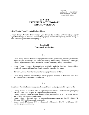 Załącznik do Uchwały Nr XLV/342/10 Rady Powiatu w Krakowie z dnia 31.03. 2010 r. STATUT URZĘDU PRACY POWIATU KRAKOWSKIEGO Misja Urzędu Pracy Powiatu Krakowskiego: „Urząd Pracy Powiatu Krakowskiego jest Instytucją kreującą zrównowaŜony rozwój kapitału ludzkiego w powiecie krakowskim poprzez świadczenie wysokiej jakości usług na rzecz klientów i partnerów rynku pracy.” Rozdział I Postanowienia Ogólne §1 1. Urząd Pracy Powiatu Krakowskiego jest samodzielną powiatową jednostką budŜetową, organizacyjnie wchodzącą w skład powiatowej administracji zespolonej, realizującą zadania organu zatrudnienia – Starosty w ramach publicznej słuŜby zatrudnienia. 2. Urząd Pracy Powiatu Krakowskiego realizuje zadania Powiatu Krakowskiego w zakresie przeciwdziałania bezrobociu oraz aktywizacji rynku pracy. 3. Siedzibą Urzędu Pracy Powiatu Krakowskiego jest miasto Kraków. 4. Urząd Pracy Powiatu Krakowskiego działa poprzez Siedzibę w Krakowie oraz Filie w Krzeszowicach, Skawinie i Słomnikach. §2 Urząd Pracy Powiatu Krakowskiego działa na podstawie następujących aktów prawnych: 1) Ustawy z dnia 20 kwietnia 2004 r. o promocji zatrudnienia i instytucjach rynku pracy (Dz. U. z 2008 r. Nr 69, poz. 415 z późniejszymi zmianami), 2) Ustawy z dnia 05 czerwca 1998 r. o samorządzie powiatowym (Dz. U. z 2001 r. Nr 142, poz. 1592 z późniejszymi zmianami), 3) Ustawy z dnia 21 listopada 2008 r. o pracownikach samorządowych (Dz. U. z 2008 r. Nr 223, poz. 1458 z późniejszymi zmianami). 4) Ustawy z dnia 27 sierpnia 2009 r. o finansach publicznych (Dz. U. Nr 157, poz. 1240 z późniejszymi zmianami), 1 5) Ustawy z dnia 27 sierpnia 1997 r. o rehabilitacji zawodowej i społecznej oraz zatrudnianiu osób niepełnosprawnych (Dz. U. z 2008 r. Nr 14, poz. 92 z późniejszymi zmianami), 6) Ustawy z dnia 13 października 1998 r. o systemie ubezpieczeń społecznych. (Dz. U. z 2009 r. Nr 205, poz. 1585 z późniejszymi zmianami.), 7) Ustawy z dnia 17 grudnia 1998 r. o emeryturach i rentach z Funduszu Ubezpieczeń Społecznych (Dz. U. z 2009 r. Nr 153, poz. 1227 z późniejszymi zmianami), 8) Ustawy z dnia 14 czerwca 1960 r. - Kodeks postępowania administracyjnego (Dz. U. z 2000, Nr 98, poz.1071 z późniejszymi zmianami), 9) Ustawy z dnia 27 sierpnia 2004 r. o świadczeniach opieki zdrowotnej finansowanych ze środków publicznych ( Dz. U. z 2008 r. Nr 164, poz. 1027 z późniejszymi zmianami), 10) innych właściwych przepisów prawa, oraz 11) Regulaminu Organizacyjnego uchwalonego przez Zarząd Powiatu w Krakowie, 12) niniejszego Statutu, 13) aktów prawnych wydanych przez Zarząd oraz Radę Powiatu w Krakowie. Rozdział II Zadania Urzędu Pracy Powiatu Krakowskiego §3 Urząd Pracy Powiatu Krakowskiego wykonuje zadania określone w ustawie z dnia 20 kwietnia 2004 roku o promocji zatrudnienia i instytucjach rynku pracy, ustawie z dnia 27 sierpnia 1997 roku o rehabilitacji zawodowej i społecznej oraz zatrudnianiu osób niepełnosprawnych, innych właściwych przepisach prawa, w zakresie promocji zatrudnienia, łagodzenia skutków bezrobocia oraz aktywizacji zawodowej, w celu: 1) pełnego i produktywnego zatrudnienia; 2) rozwoju zasobów ludzkich; 3) osiągnięcia wysokiej jakości pracy; 4) wzmacniania integracji oraz solidarności społecznej; 5) zwiększania mobilności na rynku pracy. §4 1. Urząd Pracy Powiatu Krakowskiego działając w imieniu Powiatu Krakowskiego prowadzi sprawy i realizuje zadania z zakresu polityki rynku pracy, do których naleŜy w szczególności: 1) opracowanie i realizacja programu promocji zatrudnienia oraz aktywizacji lokalnego rynku pracy stanowiącego część powiatowej strategii rozwiązywania problemów społecznych, o której mowa w odrębnych przepisach; 2) pozyskiwanie i gospodarowanie środkami finansowymi na realizację zadań z zakresu aktywizacji lokalnego rynku pracy; 3) udzielania informacji o moŜliwościach i zakresie pomocy określonej w ustawie o promocji zatrudnienia i instytucjach rynku pracy; 2 4) udzielanie informacji o moŜliwościach i zakresie pomocy określonej w ustawie; 5) udzielanie pomocy bezrobotnym i poszukującym pracy w znalezieniu pracy przez pośrednictwo pracy, poradnictwo zawodowe i informację zawodową oraz pomoc w aktywnym poszukiwaniu pracy; 6) udzielanie pomocy pracodawcom w pozyskiwaniu pracowników przez pośrednictwo pracy oraz poradnictwo zawodowe i informację zawodową; 7) rejestrowanie bezrobotnych i poszukujących pracy; 8) inicjowanie, organizowanie i finansowanie usług i instrumentów rynku pracy; 9) inicjowanie i wspieranie metodyczne tworzenia klubów pracy działających w innych niŜ powiatowy urząd pracy instytucjach i organizacjach; 10) inicjowanie, organizowanie i finansowanie szkoleń i przygotowania zawodowego dorosłych; 11) opracowywanie analiz i sprawozdań, w tym prowadzenie monitoringu zawodów deficytowych i nadwyŜkowych, oraz dokonywanie ocen dotyczących rynku pracy na potrzeby powiatowej rady zatrudnienia oraz organów zatrudnienia; 12) inicjowanie i realizowanie przedsięwzięć mających na celu rozwiązanie lub złagodzenie problemów związanych z planowanymi zwolnieniami grup pracowników z przyczyn dotyczących zakładu pracy; 13) współdziałanie z powiatowymi radami zatrudnienia w zakresie promocji zatrudnienia oraz wykorzystania środków Funduszu Pracy; 14) współpraca z gminami w zakresie upowszechniania ofert pracy, upowszechniania informacji o usługach poradnictwa zawodowego, szkoleniach, przygotowaniu zawodowym dorosłych, staŜach, organizacji robót publicznych oraz zatrudnienia socjalnego na podstawie odrębnych przepisów; 15) współpraca z wojewódzkimi urzędami pracy w zakresie świadczenia podstawowych usług rynku pracy, w tym w opracowywaniu i aktualizacji informacji zawodowych oraz innych zasobów informacji dotyczących lokalnego rynku pracy przydatnych w poszukiwaniu pracy; 16) przyznawanie i wypłacanie zasiłków oraz innych świadczeń z