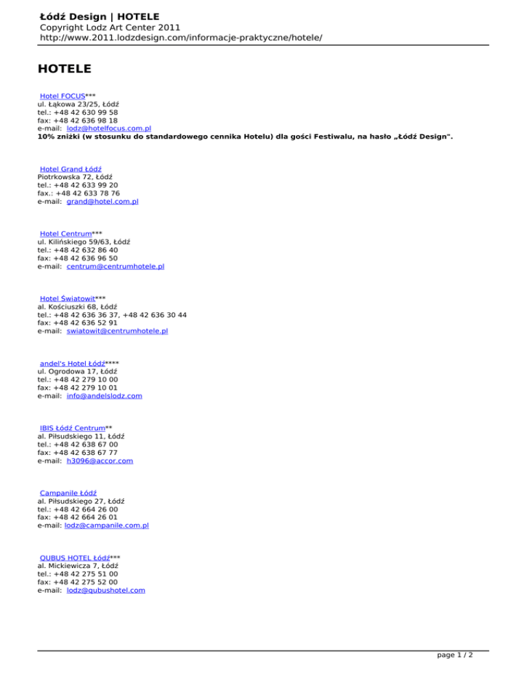 Łódź Design | HOTELE Copyright Lodz Art Center 2011 http://www.2011.lodzdesign.com/informacje-praktyczne/hotele/ HOTELE Hotel FOCUS*** ul. Łąkowa 23/25, Łódź tel.: +48 42 630 99 58 fax: +48 42 636 98 18 e-mail: [email protected] 10% zniżki (w stosunku do standardowego cennika Hotelu) dla gości Festiwalu, na hasło „Łódź Design". Hotel Grand Łódź Piotrkowska 72, Łódź tel.: +48 42 633 99 20 fax.: +48 42 633 78 76 e-mail: [email protected] Hotel Centrum*** ul. Kilińskiego 59/63, Łódź tel.: +48 42 632 86 40 fax: +48 42 636 96 50 e-mail: [email protected] Hotel Światowit*** al. Kościuszki 68, Łódź tel.: +48 42 636 36 37, +48 42 636 30 44 fax: +48 42 636 52 91 e-mail: [email protected] andel's Hotel Łódź**** ul. Ogrodowa 17, Łódź tel.: +48 42 279 10 00 fax: +48 42 279 10 01 e-mail: [email protected] IBIS Łódź Centrum** al. Piłsudskiego 11, Łódź tel.: +48 42 638 67 00 fax: +48 42 638 67 77 e-mail: [email protected] Campanile Łódź al. Piłsudskiego 27, Łódź tel.: +48 42 664 26 00 fax: +48 42 664 26 01 e-mail: [email protected] QUBUS HOTEL Łódź*** al. Mickiewicza 7, Łódź tel.: +48 42 275 51 00 fax: +48 42 275 52 00 e-mail: [email protected] page 1 / 2 Łódź Design | HOTELE Copyright Lodz Art Center 2011 http://www.2011.lodzdesign.com/informacje-praktyczne/hotele/ Hostel Flamingo ul. Siekiewicza 67, Łódź tel.: +48 42 66 11 888 e-mail: [email protected] Boutique Hostel ul. Stefanowskiego 17, Łódź tel.: +48 42 636 22 01 e-mail: [email protected] Boutique Hotel's ul. Milionowa 25, Łódź tel.: +48 42 684 75 10 e-mail: [email protected] Arrivia Bed & Breakfast ul. Narutowicza 24 m. 34, Łódź tel.: +48 42 661 01 00, +48 602 78 33 44 fax: +48 42 661 01 02 e-mail: [email protected] Linat Orchim ul. Pomorska 18, Łódź tel.: +48 42 632 46 61, +48 42 632 46 99 fax: +48 42 632 47 99 e-mail: [email protected] Pokoje Gościnne – Słomkowscy ul. Piotrkowska 247, Łódź tel.: +48 694 380 995 e-mail: [email protected] Willa Epejro ul. 3 Maja 15a, Łódź tel.: +48 42 680 94 45 e-mail: [email protected] Pensjonat Villa Alberto della Vita ul. Kopcińskiego 34a, Łódź tel.: +48 42 678 38 52 fax: +48 42 671 36 66 e-mail: [email protected] page 2 / 2