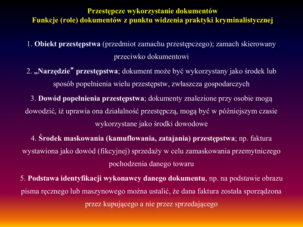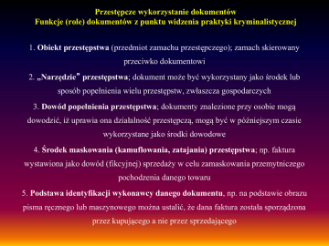 Przestępcze wykorzystanie dokumentów Funkcje (role) dokumentów z punktu widzenia praktyki kryminalistycznej 1. Obiekt przestępstwa (przedmiot zamachu przestępczego); zamach skierowany przeciwko dokumentowi 2. „Narzędzie” przestępstwa; dokument może być wykorzystany jako środek lub sposób popełnienia wielu przestępstw, zwłaszcza gospodarczych 3. Dowód popełnienia przestępstwa; dokumenty znalezione przy osobie mogą dowodzić, iż uprawia ona działalność przestępczą, mogą być w późniejszym czasie wykorzystane jako środki dowodowe 4. Środek maskowania (kamuflowania, zatajania) przestępstwa; np. faktura wystawiona jako dowód (fikcyjnej) sprzedaży w celu zamaskowania przemytniczego pochodzenia danego towaru 5. Podstawa identyfikacji wykonawcy danego dokumentu, np. na podstawie obrazu pisma ręcznego lub maszynowego można ustalić, że dana faktura została sporządzona przez kupującego a nie przez sprzedającego Przykładowe cele przestępczego wykorzystania fałszywego/sfałszowanego dowodu osobistego 1. Założenie fikcyjnej firmy i dokonywanie wyłudzeń towarów 2. Wyłudzanie kredytów bankowych 3. Założenie konta osobistego 4. Wyrobienie na podstawie DO innych dokumentów np.paszportu, prawa jazdy 5. Wyłudzenia ogłoszeniowe (oszust pośrednikiem) 6. Popełnienie bigamii 7. Wyłudzanie towarów przy ratalnym systemie sprzedaży 8. Tworzenie wysokiego debetu na koncie założonym na podstawie fałszywego dowodu 9. Legitymowanie się fałszywym dowodem w przypadkach kontroli (np.sprawdzanie tożsamości) itd. DOKUMENTY POTWIERDZAJĄCE TOŻSAMOŚĆ - DOWODY OSOBISTE Dowód osobisty wydawany jest przez właściwy organ gminy (wójt, burmistrz lub prezydent miasta) ze względu na miejsce pobytu stałego osoby ubiegającej się o wydanie w/w dokumentu a w razie braku takiego miejsca - według ostatniego miejsca pobytu stałego tej osoby. Tymczasowy dowód osobisty - od 1 stycznia 2001 r. tymczasowe dowody osobiste nie są już wydawane; wydane przed 1 stycznia 2001 r. straciły ważność wraz z upływem terminów w nich określonych. Zaświadczenie o utracie dowodu osobistego - wydawane, gdy osoba utraciła dowód osobisty przez najbliższy organ gminy. Poświadczenie ważne jest do czasu wydania nowego dokumentu. W chwili obecnej w obiegu powinny znajdować się jeden typ dowodów osobistych z dwoma rodzajami zabezpieczeń: emisji 2001r. i zmodernizowany w 2013r. DOKUMENTY POTWIERDZAJĄCE TOŻSAMOŚĆ - DOWODY OSOBISTE Szczegółowe zasady dotyczące dowodów osobistych określa Ustawa z dnia 10 kwietnia 1974 r. o ewidencji ludności i dowodach osobistych z późniejszymi zmianami (Dz. U. 1974 Nr 14 poz. 85 z późn.zm.) Dowód osobisty - obowiązany jest posiadać obywatel polski zamieszkały w RP od: ukończenia 18 roku życia z ważnością na 10 lat, ukończenia 15 roku życia, jeżeli pozostaje w stosunku pracy lub nie zamieszkuje wspólnie z osobami, pod których władzą rodzicielską lub opieką się znajduje albo nie pozostaje pod władzą rodzicielską lub opieką z ważnością na 5 lat. Osoba będąca obywatelem polskim ma prawo posiadać dowód osobisty od 13 roku życia. Dowód osobisty wydany osobie, która ukończyła 65 rok życia, jest ważny na czas nieoznaczony, jeżeli osoba ta zwróciła się o wydanie dowodu osobistego z takim terminem ważności. DOKUMENTY POTWIERDZAJĄCE TOŻSAMOŚĆ Rejestr PESEL Powszechny Elektroniczny System Ewidencji Ludności. Prowadzony od 1979 roku przez organy państwa na mocy ustawy z dnia 10.04.1974r. o ewidencji ludności i dowodach osobistych. Rejestr Dowodów Osobistych RDO W Rejestrze Dowodów Osobistych gromadzi się: 1)dane, o których mowa w art. 28 pkt 1–7 (dane z formularza o wydanie DO) 2)fotografię, o której mowa w art. 29; 3) dane dotyczące wniosku o wydanie dowodu osobistego: a) numer wniosku, b) datę złożenia wniosku, c) oznaczenie organu wydającego dowód osobisty, d) status wniosku, e) dane o pozostawieniu wniosku bez rozpoznania: datę pozostawienia wniosku bez rozpoznania, oznaczenie organu pozostawiającego wnio-sek bez rozpoznania oraz przyczynę pozostawienia wniosku bez rozpo-znania; 4) dane dotyczące dowodu osobistego: a) serię i numer dowodu osobistego, b) datę ważności, Rejestr Dowodów Osobistych c) oznaczenie organu wydającego dowód osobisty, d) status dowodu osobistego: – datę wydania, – datę przekazania do organu gminy, – datę przyjęcia w organie gminy, – datę odbioru przez obywatela, – datę unieważnienia, – przyczynę unieważnienia, – oznaczenie organu unieważniającego, – datę przekazania danych o unieważnieniu do Systemu Informacyj-nego Schengen, e) przyczynę wydania dowodu osobistego, f) numer i datę wydania decyzji, o której mowa w art. 32, oraz oznaczenie organu wydającego decyzję, g) numer i datę wydania decyzji, o której mowa w art. 52, oraz oznaczenie organu wydającego decyzję; 5) (uchylony); 6) dane dotyczące utraconych i błędnie spersonalizowanych blankietów dowo-dów osobistych: a) serię i numer blankietu, b) przyczynę wybrakowania blankietu, c) datę wybrakowania blankietu, d) przyczynę utraty blankietu, e) datę utraty blankietu, f) datę zgłoszenia do Systemu Informacyjnego Schengen; 7) dane zawarte w ogólnokrajowej ewidencji wydanych i unieważnionych dowodów osobistych dotyczące dowodów osobistych wydanych na podstawie wniosków złożonych od dnia 1 stycznia 2001 r. do dnia 31 grudnia 2014 r.; 8) dane o dowodach osobistych wydanych przed dniem 1 stycznia 2001 r., zawarte dotychczas w rejestrze PESEL. USTAWA z dnia 6 sierpnia 2010 r. dowodach osobistych (Dz.U.2010 nr.167 poz.1131) …. Art. 93. Ustawa wchodzi w życie z dniem 1 stycznia 2015 r. …. Ustawa wchodzi w życie z dniem 1 marca 2015r. Art. 12. Warstwa graficzna dowodu osobistego zawiera: 1) dane dotyczące osoby: a) nazwisko, b) imię (imiona), c) nazwisko rodowe, d) imiona rodziców, e) datę i miejsce urodzenia, f) płeć, g) wi