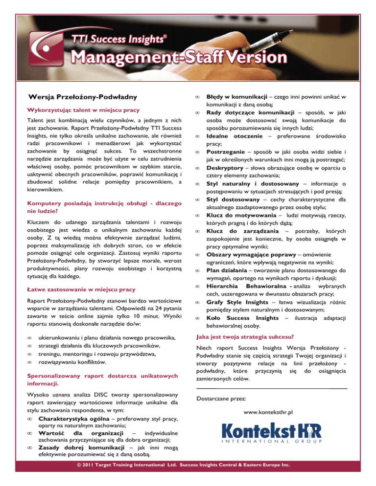 Wersja PrzełoŜony-Podwładny • Wykorzystując talent w miejscu pracy • Talent jest kombinacją wielu czynników, a jednym z nich jest zachowanie. Raport PrzełoŜony-Podwładny TTI Success Insights, nie tylko określa unikalne zachowanie, ale równieŜ radzi pracownikowi i menadŜerowi jak wykorzystać zachowanie by osiągnąć sukces. To wszechstronne narzędzie zarządzania moŜe być uŜyte w celu zatrudnienia właściwej osoby, pomóc pracownikom w szybkim starcie, uaktywnić obecnych pracowników, poprawić komunikację i zbudować solidne relacje pomiędzy pracownikiem, a kierownikiem. Komputery posiadają instrukcję obsługi - dlaczego nie ludzie? Kluczem do udanego zarządzania talentami i rozwoju osobistego jest wiedza o unikalnym zachowaniu kaŜdej osoby. Z tą wiedzą moŜna efektywnie zarządzać ludźmi, poprzez maksymalizację ich dobrych stron, co w efekcie pomoŜe osiągnąć cele organizacji. Zastosuj wyniki raportu PrzełoŜony-Podwładny, by stworzyć lepsze morale, wzrost produktywności, plany rozwoju osobistego i korzystną sytuację dla kaŜdego. Łatwe zastosowanie w miejscu pracy • • • • • • • • • • Błędy w komunikacji – czego inni powinni unikać w komunikacji z daną osobą; Rady dotyczące komunikacji – sposób, w jaki osoba moŜe dostosować swoją komunikacje do sposóbu porozumiewania się innych ludzi; Idealne otoczenie – preferowane środowisko pracy; Postrzeganie – sposób w jaki osoba widzi siebie i jak w określonych warunkach inni mogą ją postrzegać; Deskryptory – słowa obrazujące osobę w oparciu o cztery elementy zachowania; Styl naturalny i dostosowany – informacje o postępowaniu w sytuacjach stresujących i pod presją; Styl dostosowany – cechy charakterystyczne dla aktualnego zaadaptowanego przez osobę stylu; Klucz do motywowania – ludzi motywują rzeczy, których pragną i do których dąŜą; Klucz do zarządzania – potrzeby, których zaspokojenie jest konieczne, by osoba osiągnęła w pracy optymalne wyniki; Obszary wymagające poprawy – omówienie ograniczeń, które wpływają negatywnie na wyniki; Plan działania – tworzenie planu dostosowanego do wymagań, opartego na wynikach raportu i dyskusji; Hierarchia Behawioralna - analiza wybranych cech, uszeregowana w dwunastu obszarach pracy; Grafy Style Insights – łatwa wizualizacja róŜnic pomiędzy stylem naturalnym i dostosowanym; Koło Success Insights – ilustracja adaptacji behawioralnej osoby. Raport PrzełoŜony-Podwładny stanowi bardzo wartościowe wsparcie w zarządzaniu talentami. Odpowiedź na 24 pytania zawarte w teście online zajmie tylko 10 minut. Wyniki raportu stanowią doskonałe narzędzie do/w: • • • • • Jaka jest twoja strategia sukcesu? ukierunkowaniu i planu działania nowego pracownika, strategii działania dla kluczowych pracowników, treningu, mentoringu i rozwoju przywództwa, rozwiązywaniu konfliktów. Spersonalizowany raport dostarcza unikatowych informacji. Wysoko uznana analiza DISC tworzy spersonalizowany raport zawierający wartościowe informacje unikalne dla stylu zachowania respondenta, w tym: • • • • Niech raport Success Insights Wersja PrzełoŜony Podwładny stanie się częścią strategii Twojej organizacji i stworzy pozytywne relacje na linii przełoŜony podwładny, które przyczynią się do osiągnięcia zamierzonych celów. Dostarczane przez: www.konteksthr.pl Charakterystyka ogólna – preferowany styl pracy, oparty na naturalnym zachowaniu; Wartość dla organizacji – indywidualne zachowania przyczyniające się dla dobra organizacji; Zasady dobrej komunikacji – jak inni mogą efektywnie porozumiewać się z daną osobą. © 2011 Target Training International Ltd. Success Insights Central & Eastern Europe Inc.