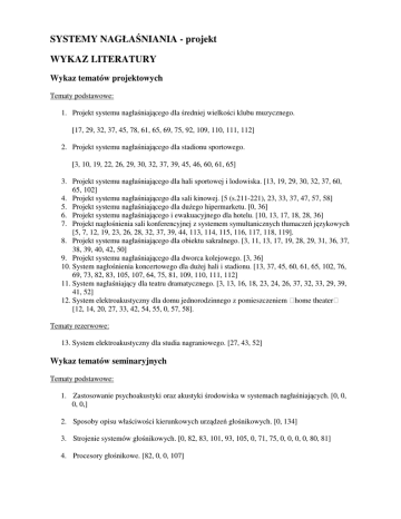SYSTEMY NAGŁA NIANIA - projekt WYKAZ LITERATURY Wykaz tematów projektowych Tematy podstawowe: 1. Projekt systemu nagła niaj cego dla redniej wielko ci klubu muzycznego. [17, 29, 32, 37, 45, 78, 61, 65, 69, 75, 92, 109, 110, 111, 112] 2. Projekt systemu nagła niaj cego dla stadionu sportowego. [3, 10, 19, 22, 26, 29, 30, 32, 37, 39, 45, 46, 60, 61, 65] 3. Projekt systemu nagła niaj cego dla hali sportowej i lodowiska. [13, 19, 29, 30, 32, 37, 60, 65, 102] 4. Projekt systemu nagła niaj cego dla sali kinowej. [5 (s.211-221), 23, 33, 37, 47, 57, 58] 5. Projekt systemu nagła niaj cego dla du ego hipermarketu. [0, 36] 6. Projekt systemu nagła niaj cego i ewakuacyjnego dla hotelu. [10, 13, 17, 18, 28, 36] 7. Projekt nagło nienia sali konferencyjnej z systemem symultanicznych tłumacze j zykowych [5, 7, 12, 19, 23, 26, 28, 32, 37, 39, 44, 113, 114, 115, 116, 117, 118, 119]. 8. Projekt systemu nagła niaj cego dla obiektu sakralnego. [3, 11, 13, 17, 19, 28, 29, 31, 36, 37, 38, 39, 40, 42, 50] 9. Projekt systemu nagła niaj cego dla dworca kolejowego. [3, 36] 10. System nagło nienia koncertowego dla du ej hali i stadionu. [13, 37, 45, 60, 61, 65, 102, 76, 69, 73, 82, 83, 105, 107, 64, 75, 81, 109, 110, 111, 112] 11. System nagła niaj cy dla teatru dramatycznego. [3, 13, 16, 18, 23, 24, 26, 37, 32, 33, 29, 39, 41, 52] 12. System elektroakustyczny dla domu jednorodzinnego z pomieszczeniem home theater [12, 14, 20, 27, 33, 42, 54, 55, 0, 57, 58]. Tematy rezerwowe: 13. System elektroakustyczny dla studia nagraniowego. [27, 43, 52] Wykaz tematów seminaryjnych Tematy podstawowe: 1. Zastosowanie psychoakustyki oraz akustyki rodowiska w systemach nagła niaj cych. [0, 0, 0, 0,] 2. Sposoby opisu wła ciwo ci kierunkowych urz dze gło nikowych. [0, 134] 3. Strojenie systemów gło nikowych. [0, 82, 83, 101, 93, 105, 0, 71, 75, 0, 0, 0, 0, 80, 81] 4. Procesory gło nikowe. [82, 0, 0, 107] 5. Urz dzenia do eliminacji wzbudze w systemach nagła niaj cych. [0, 0, 53, 0, 0, 108, 122, 123] 6. Systemy transmisji bezprzewodowej. [0, 20, 51, 0, 0, 0, 0, 113] 7. Monitorowanie d wi ku na estradzie. [0, 76, 77, 83, 102, 103, 104, 0, 0, 107] 8. Zasady monta u urz dze gło nikowych, opakowania sceniczne, statywy. [0, 0, 133] 9. Rodzaje sygnałów audio i sposoby ich transmisji. Kable i zł cza. [0, 14, 41, 0, 84, 0, 0, 108, 77, 0, 0, 0, 0, 61, 62, 0, 128, 0] 10. Eliminacja zakłóce . Uziemianie, ekranowanie, zasady zasilania systemów nagła niania. [0, 8, 16, 17, 21, 0, 0, 48, 49, 84, 0, 89, 62, 0, 0] 11. Urz dzenia pomocnicze stosowane w torach elektroakustycznych. [0, 0, 108, 123, Bł d! Nie mo na odnale ródła odwołania., 130, 131, 132] 12. Urz dzenia gło nikowe w technologii NXT. [124, 125, 126, 127] Tematy rezerwowe: 13. Miksery automatyczne. [0, 11, 122, 138] 14. Monitorowanie d wi ku w studiu. [78, 79, 0, 135, 136, 137] Literatura: 1. Hojan J., Zasady nagła niania pomieszcze i przestrzeni otwartej, Wydawnictwo Naukowe UAM, Pozna 1988. 2. Davis G., Jones R., Sound Reinforcement Handbook, Yamaha Corporation of America 1990. 3. Miszczak S., Urz dzenia Elektroakustyczne, WKŁ Warszawa 1964. 4. Davis D., C., Sound System Engineering, Focal Press 1997. 5. Ballou G., Handbook for Sound Engineers, Howard W. Sams & Co 1991. 6. Charoy A., Zakłócenia w urz dzeniach elektronicznych, WNT, Warszawa 1999. 7. Sound & Video Contractor, 10/99. 8. Sound & Video Contractor, 7/99. 9. Sound & Video Contractor, 4/99. 10. Sound & Video Contractor, 2/99. 11. Sound & Video Contractor, 1/99. 12. Sound & Video Contractor, 12/98. 13. Sound & Video Contractor, 11/98. 14. Sound & Video Contractor, 9/98. 15. Sound & Video Contractor, 8/98. 16. Sound & Video Contractor, 7/98. 17. Sound & Video Contractor, 4/98. 18. Sound & Video Contractor, 1/98. 19. Sound & Video Contractor, 11/97. 20. Sound & Video Contractor, 9/97. 21. Sound & Video Contractor, 8/97. 22. Sound & Video Contractor, 7/97. 23. Sound & Video Contractor, 2/97. 24. Sound & Video Contractor, 1/97. 25. Sound & Video Contractor, 12/96. 26. Sound & Video Contractor, 11/96. 27. Sound & Video Contractor, 9/96. 28. Sound & Video Contractor, 7/96. 29. Sound & Video Contractor, 3/96. 30. Sound & Video Contractor, 1/96. 31. Sound & Video Contractor, 12/95. 32. Sound & Video Contractor, 11/95. 33. Sound & Video Contractor, 9/95. 34. Sound & Video Contractor, 8/95. 35. Sound & Video Contractor, 7/95. 36. Sound & Video Contractor, 5/95. 37. Sound & Video Contractor, 3/95. 38. Sound & Video Contractor, 1/95. 39. Sound & Video Contractor, 11/94. 40. Sound & Video Contractor, 10/94. 41. Sound & Video Contractor, 9/94. 42. Sound & Video Contractor, 8/94. 43. Sound & Video Contractor, 7/94. 44. Sound & Video Contractor, 5/94. 45. Sound & Video Contractor, 4/94. 46. Sound & Video Contractor, 2/94. 47. Cinema Sound System Manual, www.jblpro.com. 48. Tamowicz-Kozicka W., Eliminacja zakłóce elektromagnetycznych w systemach fonicznych, Przegl d Techniki Radio i Telewizja 3/98. 49. J. Audio Eng. Soc., Vol. 43, No. 6, 1995 June. 50. The Relationship Between the Sound Contractor and Religious Organizations, www.jblpro.com. 51. Ni ewski A., Mikrofony Bezprzewodowe, Przegl d Techniki Radio i Telewizja 3/98 i 4/98. 52. Tamowicz-Kozicka W., Współczesne systemy interkomowe, Przegl d Techniki Radio i Telewizja 4/99. 53. www.SabineUSA.com. 54. Systemy Multiroom, Audio 11/99 i 12/99. 55. Materiały firmy QED. 56. www.linn.co.uk. 57. Szustak R., Wdro enie systemu d wi ku dookólnego w laboratorium dydaktycznym, Praca dyplomowa ITA, Wrocław 1999. 58. www.dolby.com. 59. Kulesza B.W., Ryszkowski W., System elektroakustyczny hali sportowej Wrocławiu, V Sympozjum Nowo ci w Technice Audio, Wrocław 1998. 60. Estrada i Studio, 1/96. 61. Estrada i Studio, 2/96. 62. Estrada i Studio, 3/96. 63. Estrada i Studio, 1/97. 64. Estrada i Studio, 2/97. 65. Estrada i Studio, 3/97. 66. Estrada i Studio, 4/97. 67. Estrada i Studio, 5/97. 68. Estrada i Studio, 6/97. 69. Estrada i Studio, 7/97. 70. Estrada i Studi