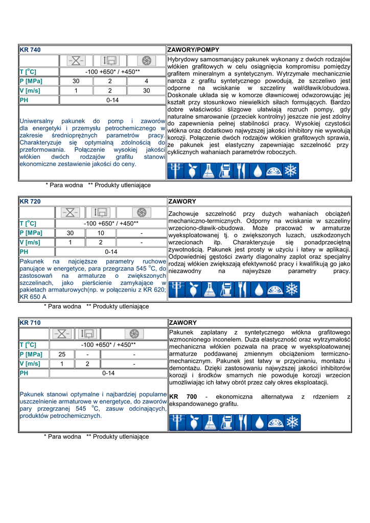 KR 740 ZAWORY/POMPY o T [ C] -100 +650* / +450** P [MPa] 30 2 4 V [m/s] 1 2 30 PH 0-14 Uniwersalny pakunek do pomp i zaworów dla energetyki i przemysłu petrochemicznego w zakresie średnioprężnych parametrów pracy. Charakteryzuje się optymalną zdolnością do przeformowania. Połączenie wysokiej jakości włókien dwóch rodzajów grafitu stanowi ekonomiczne zestawienie jakości do ceny. Hybrydowy samosmarujący pakunek wykonany z dwóch rodzajów włókien grafitowych w celu osiągnięcia kompromisu pomiędzy grafitem mineralnym a syntetycznym. Wytrzymałe mechanicznie naroża z grafitu syntetycznego powodują, że szczeliwo jest odporne na wciskanie w szczeliny wał/dławik/obudowa. Doskonale układa się w komorze dławnicowej odwzorowując jej kształt przy stosunkowo niewielkich siłach formujących. Bardzo dobre właściwości ślizgowe ułatwiają rozruch pompy, gdy naturalne smarowanie (przeciek kontrolny) jeszcze nie jest zdolny do zapewnienia pełnej stabilności pracy. Wysokiej czystości włókna oraz dodatkowo najwyższej jakości inhibitory nie wywołują korozji. Połączenie dwóch rodzajów włókien grafitowych sprawia, że pakunek jest elastyczny zapewniając szczelność przy cyklicznych wahaniach parametrów roboczych. * Para wodna ** Produkty utleniające KR 720 ZAWORY Zachowuje szczelność przy dużych wahaniach obciążeń mechaniczno-termicznych. Odporny na wciskanie w szczeliny T [ C] -100 +650* / +450** wrzeciono-dławik-obudowa. Może pracować w armaturze P [MPa] 30 10 wyeksploatowanej tj. o zwiększonych luzach, uszkodzonych wrzecionach itp. Charakteryzuje się ponadprzeciętną V [m/s] 1 2 żywotnością. Pakunek jest prosty w użyciu i łatwy w aplikacji. PH 0-14 Odpowiedniej gęstości zwarty diagonalny zaplot oraz specjalny Pakunek na najcięższe parametry ruchowe rodzaj włókien zwiększają efektywność pracy i kwalifikują go jako o panujące w energetyce, para przegrzana 545 C, do niezawodny na najwyższe parametry pracy. zastosowań na armaturze o zwiększonych szczelinach, jako pierścienie zamykające w pakietach armaturowych(np. w połączeniu z KR 620; KR 650 A o * Para wodna ** Produkty utleniające KR 710 ZAWORY o T [ C] -100 +650* / +450** P [MPa] 25 - - V [m/s] 1 2 - PH 0-14 Pakunek zaplatany z syntetycznego włókna grafitowego wzmocnionego inconelem. Duża elastyczność oraz wytrzymałość mechaniczna włókien pozwala na pracę w wyeksploatowanej armaturze poddawanej zmiennym obciążeniom termicznomechanicznym. Pakunek jest łatwy w przycinaniu, montażu i demontażu. Dzięki zastosowaniu najwyższej jakości inhibitorów korozji i środków smarnych nie powoduje korozji wrzecion umożliwiając ich łatwy obrót przez cały okres eksploatacji. Pakunek stanowi optymalne i najbardziej popularne KR 700 - ekonomiczna uszczelnienie armaturowe w energetyce, do zaworów ekspandowanego grafitu. o pary przegrzanej 545 C, zasuw odcinających, produktów petrochemicznych. * Para wodna ** Produkty utleniające alternatywa z rdzeniem z KR 600 POMPY Szczeliwo samosmarujące, o bardzo niskim współczynniku tarcia, wykonane z grafitu ekspandowanego. Odpowiednio dobrana o T [ C] -100 +650* / +450** gęstość zaplotu gwarantuje kompromis pomiędzy elastycznością sznura a zdolnością odprowadzania ciepła. Cechy te sprawiają, P [MPa] 15 3 że szczeliwo może być zastosowane w pompach o bardzo V [m/s] 2 30 wysokich prędkościach obrotowych (Vmax=30m/s). Pakunek PH 0-14 pracuje stabilnie nie zmieniając swych właściwości przez długi okres eksploatacji, nie ulega utwardzeniu, nie niszczy tulei. Pakunek pompowy dla energetyki zawodowej z Czystość użytego grafitu oraz inhibitory korozji wydłużają wysokiej czystości grafitu uformowanego w postać żywotność pakunku. plecionego szczeliwa. Pompy wody zasilającej kotły i kondensatu. * Para wodna ** Produkty utleniające KR 620 ZAWORY Pakunek z przędzy grafitowej będącej kompozytem ekspandowanego grafitu prowadzonego na wzmocnieniu z T [ C] -200 +650* / +450** druciku inconelowego zwiększającego wytrzymałość mechaniczną. Specjalne inhibitory korozji chronią wrzeciona P [MPa] 30 2 przed korozją i zapiekaniem. Aby ograniczyć oddziaływanie V [m/s] 2 2 korozyjnych zanieczyszczeń zawartych w wodzie kotłowej, w PH 0-14 szczególności związków chloropochodnych pakunek posiada specjalne dodatki wywołujące powstawanie procesu pasywacji. Szczeliwo pracuje stabilnie, nie twardnieje, przez cały czas możliwy jest łatwy obrót wrzecionem. Zdolność dopasowywania się do kształtu dławnicy (wypełnienie wżerów) poprawia Do zaworów parowych z wysokim ciśnieniem i szczelności. Z uwagi na własności mechaniczne grafitu temperaturą, w przemyśle chemicznym, ekspandowanego zaleca się stosowanie pierścieni zamykających petrochemicznym i rafineryjnym. wykonanych z pakunków typu KR 710 lub KR 720. o * Para wodna ** Produkty utleniające KR 630 ZAWORY Pakunek z kompozytu ekspandowanego grafitu oraz inconelu stanowiącego oplot każdej splotki użytej do wykonania pakunku. o T [ C] -200 +650* / +450** Brak technologicznych dodatków wiążących grafit ze wzmocnieniem sprawia, że pakunek nie traci masy w wysokich P [MPa] 45 temperaturach, wykazując pamięć postaci (sprężystość i powrót V [m/s] 1 elastyczny). Użycie wysokiej czystości włókna oraz specjalnych PH 0-14 inhibitorów korozji eliminuje zjawisko powstawania ognisk korozyjnych oraz poprawia walory eksploatacyjne. Pakunek dla energetyki zawodowej, odporny na Długi bezawaryjny okres pracy nie wpływa ujemnie na duże naciski, przewidziany na ekstremalnie wysokie właściwości uszczelniające. parametry i wymagania niezawodnościowe. Z uwagi na dużą zawartość inconelu zaleca się go stosować w armaturze zaporowej. * Para wodna ** Produkty utleniające