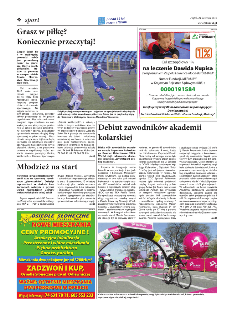 Y sport Grasz w piłkę? Koniecznie przeczytaj! Prymat wywalczyła MSP Szczawno-Zdrój która wyprzedziła wałbrzyskie PSP 21 i PSP 6 (odpowiednio REKLAMA R0417/15 Cel szczegółowy 1% na leczenie Dawida Kupisa z rozpoznaniem Zespołu Laurence-Moon-Bardet-Biedl Numer Fundacji „MERKURY” w Krajowym Rejestrze Sądowym (KRS) : 0000191584 …Czas bez rehabilitacji jest czasem nie do odpracowania. Kosztowne leczenie i długotrwała rehabilitacja to jedyna nadzieja dla naszego syna” Dzięki profesjonalnym treningom i zajęciom ze specjalistami każdy będzie miał szansę zostać zawodowym piłkarzem. Takim jak na przykład grający do niedawna w Wałbrzychu Marcin „Maradona” Morawski. „Górnik Wałbrzych”- a szkołą także z innych obiektów sportowych będących w zarządzie gminy. W przyszłości w budynku Zespołu Szkół Nr 4 planuje się utworzenie internatu dla dzieci i młodzieży uzdolnionej ruchowo, a mieszkającej poza Wałbrzychem. Szczegółowych informacji na temat naboru udzielają pracownicy szkoły (tel. 74 664 88 80) oraz klubu (tel. 74 660 93 40, 74 664 22 23). (red) Młodzież na start Po trzecio i drugoklasistach przyszedł czas na sportową rywalizację „pierwszaków”. Dziesięć reprezentacji w siedmiu konkurencjach walczyło o prymat wśród najmłodszych uczniów wałbrzyskich (i nie tylko) szkół www.30minut.pl REKLAMA Zespół Szkół Nr 4 w Wałbrzychu prowadzi nabór jest prowadzony nabór do pierwszej klasy o profilu piłkarskim. Będzie to pierwsza w naszym mieście Szkoła Mistrzostwa Sportowego tego typu. Od września 2015 roku uczniowie przyjęci do tej klasy będą realizować specjalistyczny program ukierunkowania sportowego. Na zajęcia ruchowe, w tym stricte – piłkarskie, dyrektor szkoły przeznaczy aż 16 godzin tygodniowo. Aby móc realizować program tego szkolenia na najwyższym merytorycznym poziomie w szkole zostanie zatrudniony instruktor sportu, posiadający uprawnienia trenera drugiej klasy sportowej w piłce nożnej. Uczniowie uczący się w tej klasie będą korzystać ze szkolnych obiektów sportowych: hali sportowej, krytej pływalni, siłowni, a na podstawie umowy o współpracy, która zostanie zawarta pomiędzy Gminą Wałbrzych – Klubem Sportowym Piątek, 24 kwietnia 2015 ponad 12 lat razem z Wami drugie i trzecie miejsce). Zawodnicy i zawodniczki (reprezentacja składała się z 12 uczestników, 10 w każdej konkurencji plus dwóch rezerwowych, odpowiednio 6+6 dziewcząt i chłopców) rywalizowali w siedmiu konkurencjach które były powiązane z takimi dyscyplinami jak siatkówka czy koszykówka plus elementy sprawnościowe z domieszką precyzji. (red) R0418/15 %[JǗLVKFNZXT[ZTULJNEBSD[ZǩDPNXTQPNBHBKnjDZN %BXJEB,VQJTB 3PE[JDF%BXJEBJ8BMEFNBS8FJIT1SF[FT'VOEBDKJv.FSLVSZw Debiut zawodników akademii kolarskiej Blisko 600 zawodników stanęło na stracie kryterium kolarskiego Boxmet Dzierżoniów 2015. Wśród nicjh członkowie akademii kolarskiej „sevenRsport cycling academy”. Impreza ta inauguruje sezon kolarski w naszym kraju i jest jednocześnie I Eliminacją Mistrzostw Polski Kryterium. Jak podają organizatorzy w tym roku padł rekord frekwencji – na starcie stanęło łącznie 587 zawodników, wśród nich kolarze z najlepszych polskich ekip – CCC Sprandi Polkowice, KOLSS-BDC czy też TKK Pacific Toruń. Do rywalizacji włączyły się również ekipy zagraniczne, między innymi z Czech, Litwy czy Słowacji. W tak znakomitym towarzystwie akademia kolarska „ sevenRsport cycling academy ” zadebiutowała w wyścigach szosowych. W kategorii młodzików na starcie stanął Marcin Rozmiarek, dla którego był to pierwszy start w karierze. W gronie 45 zawodników miał do pokonania 9 rund, każda po 1,5 kilometra. Zwyciężył Dawid Pluta, który od samego startu dyktował tempo wyścigu. Dzień później kolarze zameldowali się w Sobótce na XXVIII Międzynarodowym Wyścigu Kolarskim „ Ślężański Mnich ”, który jest oficjalnym otwarciem sezonu kolarskiego w Polsce.. Na starcie wśród ekip zawodowych, oprócz CCC Sprandi Polkowice, można było również podziwiać, między innymi znakomitą polską grupę Active Jet Team oraz czeską Whirpool Author. Do rywalizacji w kategorii młodzików zgłoszonych zostało 105 zawodników, wśród których akademię kolarską „ sevenRsport cycling academy ” reprezentował ponownie Marcin Rozmiarek. Trasa długości 34 km (dwie rundy po 17 km) z paroma stromymi podjazdami stanowiła dla sporej części zawodników duże wyzwanie. Pomimo wymagającej trasy i szybkiego tempa wyścigu (35 km/h !) Marcin Rozmiarek, który dopiero rozpoczął przygodę z kolarstwem, spisał się znakomicie. Wynik sportowy w tym przypadku nie był sprawą najważniejszą. Celem startów w imprezach kolarskich wysokiej rangi było zdobycie doświadczeń, które z pewnością zaprocentują w niedalekiej przyszłości. Akademia kolarska „ sevenRsport cycling academy ” stale prowadzi nabór otwarty dziewcząt i chłopców z klas IV – VI szkół podstawowych oraz szkół gimnazjalnych. W odpowiedzi na liczne zapytania Akademia postanowiła uruchomić dodatkowe, specjalne zajęcia dla uczniów szkół podstawowych klas I – III. Szczegółowe informacje i zapisy na stronie www.sevenrsport-cycling. com oraz pod numerami telefonów 74 / 300 04 82 oraz 790 205 777. Wszelkie zapytania można kierować również na adres [email protected]. (red) Celem startów w imprezach kolarskich wysokiej rangi było zdobycie doświadczeń, które z pewnością zaprocentują w niedalekiej przyszłości.