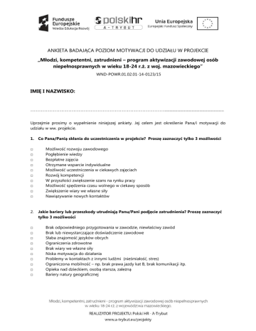 ANKIETA BADAJĄCA POZIOM MOTYWACJI DO UDZIAŁU W PROJEKCIE „Młodzi, kompetentni, zatrudnieni – program aktywizacji zawodowej osób niepełnosprawnych w wieku 18-24 r.ż. z woj. mazowieckiego” WND-POWR.01.02.01-14-0123/15 IMIĘ I NAZWISKO: …………………………………………………………………….............................................. Uprzejmie prosimy o wypełnienie niniejszej ankiety. Jej celem jest określenie Pana/i motywacji do udziału w ww. projekcie. 1. Co Pana/Panią skłania do uczestniczenia w projekcie? Proszę zaznaczyć tylko 3 możliwości □ □ □ □ □ □ □ □ □ □ 2. □ □ □ □ □ □ □ □ □ □ Możliwość rozwoju zawodowego Pogłębienie wiedzy Bezpłatne zajęcia Otrzymane wsparcie indywidualne Możliwość uczestniczenia w ciekawych zajęciach Rozwój kompetencji W przyszłości zwiększenie szans na rynku pracy Możliwość spędzenia czasu wolnego w ciekawy sposób Zwiększenie wiary we własne siły Nawiązywanie nowych kontaktów Jakie bariery lub przeszkody utrudniają Panu/Pani podjęcie zatrudnienia? Proszę zaznaczyć tylko 3 możliwości Brak odpowiedniego przygotowania w zawodzie, niewłaściwy zawód Brak lub niewystarczające doświadczenie zawodowe Słaba znajomość języków obcych Ograniczenia zdrowotne Brak wiary we własne siły Niska motywacja do działania Problemy w kontaktach z innymi ludźmi (nieśmiałość, stres) Ograniczona mobilność – np. brak prawa jazdy kat B, brak komunikacji itp. Opieka nad dzieckiem, osobą starsza, zależną Bariery natury geograficznej 3. Proszę krótko opisać, dlaczego chce Pan/i podjąć uczestnictwo w projekcie? (3-5 zdań) ………………………………………………………………………………………………………………………………………………………………… ………………………………………………………………………………………………………………………………………………………………… ………………………………………………………………………………………………………………………………………………………………… …............................................................................................................................................................................................................. ................................................................................................................................................................................................................. ................................................................................................................................................................................................................. ................................................................................................................................................................................................................. ............................................................................................................................................................................................................... 4. Czego spodziewa się Pan/i po udziale w projekcie? Proszę napisać tylko jedno najważniejsze oczekiwanie…………………………………………………………………………….. ………………………………………………………………………………………………………………………………………………………………… …............................................................................................................................................................................................................. ................................................................................................................................................................................................................. ................................................................................................................................................................................................................ 5. Proszę ustosunkować się do poniższych stwierdzeń i wstawić „X” w kratce z odpowiedzią, z którą Pan/i się zgadza. 1 2 3 Zgłosiłam/em się do projektu, bo chcę znaleźć pracę, która da mi poczucie bezpieczeństwa i stabilności Zgłosiłam/em się do projektu, ponieważ̇ potrzebuję pomocy w wejściu na rynek pracy Szukam pracy w wyuczonym zawodzie 4 Wykorzystuję każdą̨ okazję do zdobycia doświadczenia zawodowego 5 Rozważam rozpoczęcie prowadzenia działalności gospodarczej jako formy na realizacje planu rozwoju zawodowego 6 Uważam, że poprawa sytuacji zawodowej zależy od mojego zaangażowania 7 Uważam że wszelkie formy staży i przyuczenia do zawodu nawet nisko płatne lub bezpłatne stanowią wartościowy element w rozwoju zawodowy Chętnie wezmę udział w szkoleniach zmieniających moje kwalifikacje zawodowe 8 ILOŚĆ UZYSKANYCH PUNKTÓW: …………………………………………. Zdecydowanie nie Raczej nie W średnim stopniu Raczej tak Zdecydowanie tak l.p.
