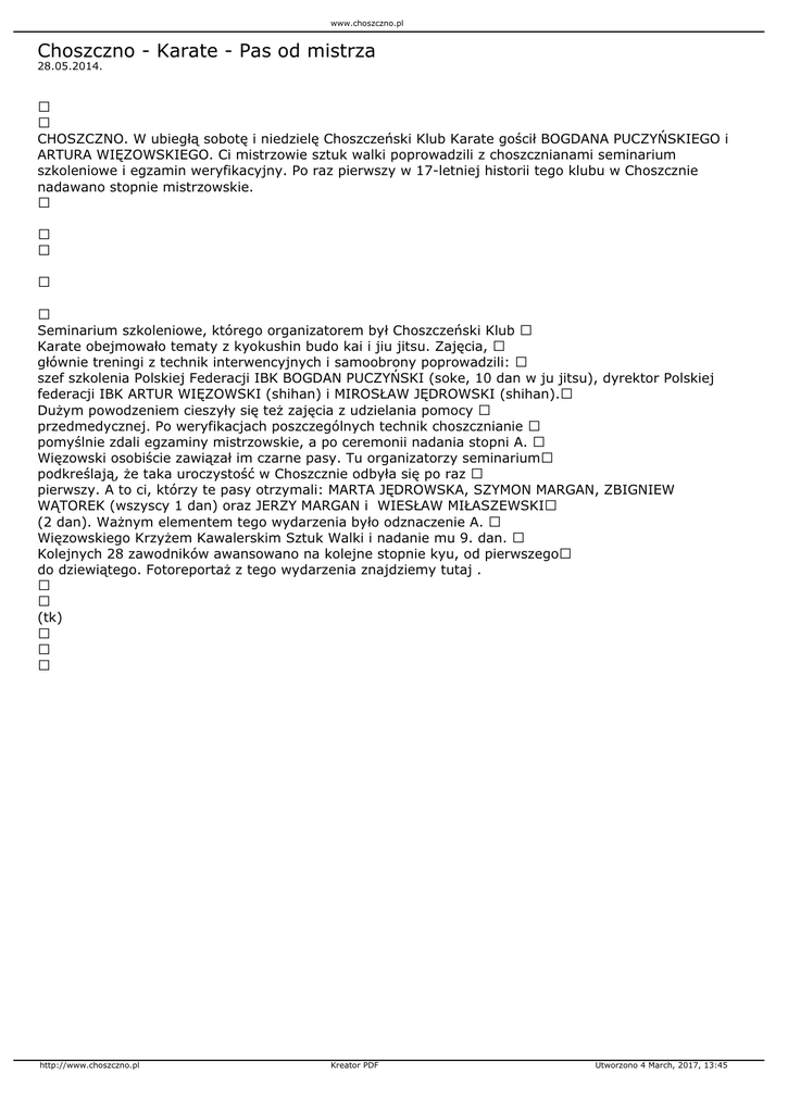 www.choszczno.pl Choszczno - Karate - Pas od mistrza 28.05.2014. CHOSZCZNO. W ubiegłą sobotę i niedzielę Choszczeński Klub Karate gościł BOGDANA PUCZYŃSKIEGO i ARTURA WIĘZOWSKIEGO. Ci mistrzowie sztuk walki poprowadzili z choszcznianami seminarium szkoleniowe i egzamin weryfikacyjny. Po raz pierwszy w 17-letniej historii tego klubu w Choszcznie nadawano stopnie mistrzowskie. Seminarium szkoleniowe, którego organizatorem był Choszczeński Klub Karate obejmowało tematy z kyokushin budo kai i jiu jitsu. Zajęcia, głównie treningi z technik interwencyjnych i samoobrony poprowadzili: szef szkolenia Polskiej Federacji IBK BOGDAN PUCZYŃSKI (soke, 10 dan w ju jitsu), dyrektor Polskiej federacji IBK ARTUR WIĘZOWSKI (shihan) i MIROSŁAW JĘDROWSKI (shihan). Dużym powodzeniem cieszyły się też zajęcia z udzielania pomocy przedmedycznej. Po weryfikacjach poszczególnych technik choszcznianie pomyślnie zdali egzaminy mistrzowskie, a po ceremonii nadania stopni A. Więzowski osobiście zawiązał im czarne pasy. Tu organizatorzy seminarium podkreślają, że taka uroczystość w Choszcznie odbyła się po raz pierwszy. A to ci, którzy te pasy otrzymali: MARTA JĘDROWSKA, SZYMON MARGAN, ZBIGNIEW WĄTOREK (wszyscy 1 dan) oraz JERZY MARGAN i WIESŁAW MIŁASZEWSKI (2 dan). Ważnym elementem tego wydarzenia było odznaczenie A. Więzowskiego Krzyżem Kawalerskim Sztuk Walki i nadanie mu 9. dan. Kolejnych 28 zawodników awansowano na kolejne stopnie kyu, od pierwszego do dziewiątego. Fotoreportaż z tego wydarzenia znajdziemy tutaj . (tk) http://www.choszczno.pl Kreator PDF Utworzono 4 March, 2017, 13:45