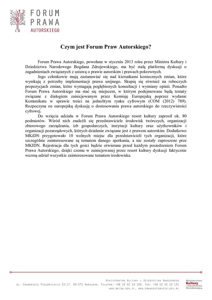 Czym jest Forum Praw Autorskiego? Forum Prawa Autorskiego, powołane w styczniu 2013 roku przez Ministra Kultury i Dziedzictwa Narodowego Bogdana Zdrojewskiego, ma być stałą platformą dyskusji o zagadnieniach związanych z ustawą o prawie autorskim i prawach pokrewnych. Jego członkowie mają zastanawiać się nad kierunkami koniecznych zmian, które wynikają z potrzeby implementacji prawa unijnego. Skupią się również na roboczych propozycjach zmian, które wymagają pogłębionych konsultacji i wymiany opinii. Ponadto Forum Prawa Autorskiego ma stać się miejscem, w którym podejmowane będą tematy związane z dialogiem zainicjowanym przez Komisję Europejską poprzez wydanie Komunikatu w sprawie treści na jednolitym rynku cyfrowym (COM (2012) 789). Rozpoczyna on europejską dyskusję o dostosowaniu prawa autorskiego do rzeczywistości cyfrowej. Do wzięcia udziału w Forum Prawa Autorskiego resort kultury zaprosił ok. 80 podmiotów. Wśród nich znaleźli się przedstawiciele środowisk twórczych, organizacji zbiorowego zarządzania, izb gospodarczych, instytucji kultury oraz użytkowników i organizacji pozarządowych, których działanie związane jest z prawem autorskim. Dodatkowo MKiDN przygotowało 10 wolnych miejsc dla przedstawicieli tych organizacji, które szczególnie zainteresowane są tematem danego spotkania, a nie zostały zaproszone prze MKIDN. Rejestracja dla tych gości będzie otwierana przed każdym posiedzeniem Forum Prawa Autorskiego, dzięki czemu w zainicjowanej przez resort kultury dyskusji faktycznie wezmą udział wszystkie zainteresowane tematem środowiska. Lista podmiotów, które zostały zaproszone do wzięcia udziału w Forum Prawa Autorskiego 1. Biblioteka Narodowa 2. Business Software Alliance 3. Centrum Cyfrowe Projekt Polska 4. Centrum Praw Własności Intelektualnej im. H. Grocjusza w Krakowie 5. Federacja Konsumentów 6. Filmoteka Narodowa 7. Fundacja Electronic Information For Libraries eIFL 8. Fundacja Nowoczesna Polska 9. Fundacja Ochrony Twórczości Audiowizualnej 10. Fundacja PANOPTYKON 11. Fundacja Rozwoju Społeczeństwa Informacyjnego 12. Fundacja Wolnego i Otwartego Oprogramowania 13. Helsińska Fundacja Praw Człowieka 14. Instytut Allerhanda 15. Instytut Prawa Własności Intelektualnej Uniwersytetu Jagiellońskiego 16. Izba Wydawców Prasy 17. Katedra Prawa Własności Intelektualnej i Dóbr Niematerialnych, IPC, WPiA UW 18. Koalicja Otwartej Edukacji 19. Konfederacja Polskich Producentów Artystycznych PRODART 20. Krajowa Izba Gospodarcza KIG 21. Krajowa Izba Gospodarcza Elektroniki i Telekomunikacji KIGEiT 22. Krajowa Izba Producentów Audiowizualnych KIPA 23. Krajowa Rada Radiofonii i Telewizji 24. Narodowy Instytut Audiowizualny 25. Obywatele Kultury 26. Obywatelskie Forum Sztuki Współczesnej 27. Ogólnopolski Związek Zawodowy Artystów Scen Muzycznych 28. Polska Fundacja Wspierania Rozwoju Komunikacji Elektronicznej PIKSEL 29. Polska Konfederacja Pracodawców Prywatnych LEWIATAN 30. Polska Izba Informatyki i Telekomunikacji PIIT 31. Polska Izba Komunikacji Elektronicznej PIKE 32. Polska Izba Książki 33. Polski Instytut Sztuki Filmowej 34. Polskie Stowarzyszenie Jazzowe 35. Polskie Stowarzyszenie Wydawców Muzycznych 36. Polskie Towarzystwo Informatyczne 37. Poznańska Fundacja Bibliotek Naukowych 38. Stowarzyszenie Aktorów Filmowych i Telewizyjnych SAFiT 39. Stowarzyszenie Architektów Polskich SARP 40. Stowarzyszenie Artystów Wykonawców Utworów Muzycznych i SłownoMuzycznych SAWP 41. Stowarzyszenie Autorów ZAiKS 42. Stowarzyszenie Autorów i Wydawców „ Polska Książka” 43. Stowarzyszenie Bibliotekarzy Polskich 44. Stowarzyszenie Dziennikarzy Polskich 45. Stowarzyszenie Dziennikarzy RP 46. Stowarzyszenie Dystrybutorów Filmowych 47. Stowarzyszenie Dystrybutorów Programów Telewizyjnych „SYGNAŁ” 48. Stowarzyszenie Filmowców Polskich, Związek Autorów i Producentów Audiowizualnych 49. Stowarzyszenie Fotoreporterów 50. Stowarzyszenie Internet Society Poland 51. Stowarzyszenie Muzealników Polskich 52. Stowarzyszenie Muzyków Rozrywkowych w Polsce 53. Stowarzyszenie Niezależna Fonografia Polska 54. Stowarzyszenie Polski Rynek Oprogramowania PRO 55. Stowarzyszenie Polskich Artystów Muzyków 56. Stowarzyszenie Twórców Ludowych STL 57. Stowarzyszenie Wydawców REPROPOL 58. Stowarzyszenie ZZ prawami Twórców Dzieł Naukowych i Technicznych KOPIPOL 59. Związek Artystów Scen Polskich ZASP 60. Związek Artystów Wykonawców STOART 61. Związek Importerów i Producentów Sprzętu Elektronicznego ZIPSEE 62. Związek Kompozytorów Polskich 63. Związek Literatów Polskich 64. Związek Polskich Artystów Fotografików ZPAF 65. Związek Polskich Artystów Malarzy i Grafików 66. Związek Polskich Artystów Plastyków ZPAP 67. Związek Polskich Autorów i Kompozytorów 68. Związek Pracodawców Business Center Club 69. Związek Pracodawców Branży Internetowej IAB Polska 70. Związek Pracodawców Mediów Elektronicznych i Telekomunikacji MEDIAKOM 71. Związek Pracodawców Mediów Publicznych 72. Związek Pracodawców Prywatnych Mediów 73. Związek Producentów Audio-Video ZPAV 74. Związek Telewizji Kablowych w Polsce – Izba Gospodarcza 75. Związek Zawodowy Muzyków 76. Związek Zawodowy Polskich Artystów Plastyków 77. Związek Zawodowy Stowarzyszonych Twórców FORUM W związku z tym, że fundacja Legalna Kultura oraz Związek Zawodowy Twórców Kultury wystąpiły z prośbą o możliwość uczestniczenia we wszystkich posiedzeniach Forum Prawa Autorskiego, Minister Kultury i Dziedzictwa Narodowego postanowił rozszerzyć listę stałych członków o te dwa podmioty. Podsumowanie prac Pierwsze Forum Prawa Autorskiego odbyło się 27 marca br. w warszawskim Kinie Iluzjon. Uroczyście otworzył je Minister Kultury i Dziedzictwa Narodowego Bogdan Zdrojewski. Podczas pierwszego spotkania została zapoczątkowana debata na temat wprowadzenia do polskiego prawa zasad korzystania z utworów osieroco