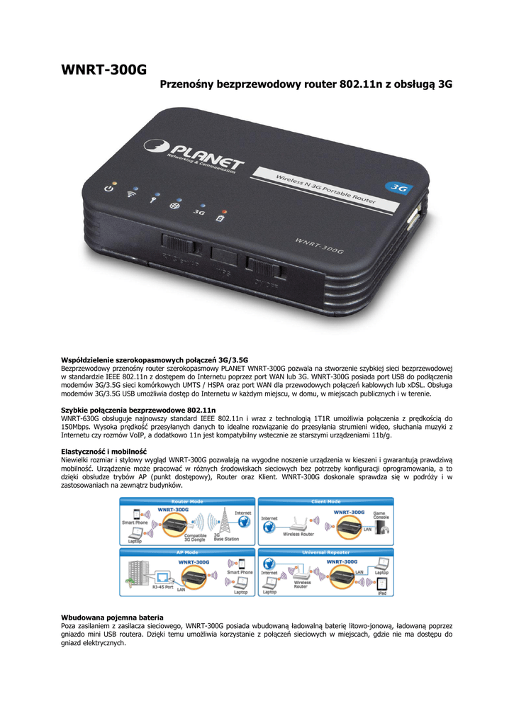 WNRT-300G Przenośny bezprzewodowy router 802.11n z obsługą 3G Współdzielenie szerokopasmowych połączeń 3G/3.5G Bezprzewodowy przenośny router szerokopasmowy PLANET WNRT-300G pozwala na stworzenie szybkiej sieci bezprzewodowej w standardzie IEEE 802.11n z dostępem do Internetu poprzez port WAN lub 3G. WNRT-300G posiada port USB do podłączenia modemów 3G/3.5G sieci komórkowych UMTS / HSPA oraz port WAN dla przewodowych połączeń kablowych lub xDSL. Obsługa modemów 3G/3.5G USB umożliwia dostęp do Internetu w każdym miejscu, w domu, w miejscach publicznych i w terenie. Szybkie połączenia bezprzewodowe 802.11n WNRT-630G obsługuje najnowszy standard IEEE 802.11n i wraz z technologią 1T1R umożliwia połączenia z prędkością do 150Mbps. Wysoka prędkość przesyłanych danych to idealne rozwiązanie do przesyłania strumieni wideo, słuchania muzyki z Internetu czy rozmów VoIP, a dodatkowo 11n jest kompatybilny wstecznie ze starszymi urządzeniami 11b/g. Elastyczność i mobilność Niewielki rozmiar i stylowy wygląd WNRT-300G pozwalają na wygodne noszenie urządzenia w kieszeni i gwarantują prawdziwą mobilność. Urządzenie może pracować w różnych środowiskach sieciowych bez potrzeby konfiguracji oprogramowania, a to dzięki obsłudze trybów AP (punkt dostępowy), Router oraz Klient. WNRT-300G doskonale sprawdza się w podróży i w zastosowaniach na zewnątrz budynków. Wbudowana pojemna bateria Poza zasilaniem z zasilacza sieciowego, WNRT-300G posiada wbudowaną ładowalną baterię litowo-jonową, ładowaną poprzez gniazdo mini USB routera. Dzięki temu umożliwia korzystanie z połączeń sieciowych w miejscach, gdzie nie ma dostępu do gniazd elektrycznych. Szybka i prosta konfiguracja zabezpieczeń W celu ułatwienia konfiguracji WNRT-300G obsługuje technologię WPS. Wystarczy wcisnąć przycisk lub wprowadzić kod PIN aby router automatycznie nawiązał połączenie z urządzeniami bezprzewodowymi. Jest to najszybsza metoda bezpiecznego połączenia urządzeń bezprzewodowych. Zaawansowane bezpieczeństwo W celu dobrego zabezpieczenia sieci bezprzewodowej WNRT-300G obsługuje zaawansowane klucze WPA/WPA-2-PSK TKIP/AES. Dodatkowo aby zwiększyć bezpieczeństwo i możliwości zarzadzania urządzenie obsługuje wielokrotne SSID oraz IEEE 802.1Q VLAN. filtrowanie adresów MAC oraz ukrywanie nazwy SSID. Dzięki temu osoby nieuprawnione nie mają dostępu do sieci. Można utworzyć do 5 wirtualnych punktów dostępowych z różnymi identyfikatorami, oraz różnie skonfigurowanymi zabezpieczeniami. Zaawansowany Firewall Aby chronić sieć przed atakami od strony Internetu WNRT-300G posiada firewall oparty na mechanizmach NAT. NAT umożliwia połączenia z Internetem dla wielu użytkowników wykorzystując jeden adres IP. Dodatkowo chroni komputery przed nieautoryzowanym dostępem oraz atakami typu DoS. Dodatkowo urządzenie posiada funkcje filtrowania IP/ MAC/ Port/ URL. Łatwa konfiguracja Dołączony do urządzenia kreator konfiguracji pozwala na szybką konfigurację urządzenia krok po kroku. Dzięki temu bezprzewodowe środowisko sieciowe można zbudować w ciągu kilku minut Podstawowe cechy Zgodność ze standardami Zgodne z bezprzewodowym standardem IEEE 802.11n o przepustowości do 150Mbps Wsteczna zgodność ze standardami 802.11b/g Port LAN/WAN (10/100Mbps), obsługa Auto MDI/MDI-X Obsługa połączeń mobilnych 3G / 3.75G Dwa interfejsy: port WAN dla połączeń przewodowych oraz złącze modemu 3G Kompatybilny z sieciami UMTS / HSPA Rozszerzenia łączności bezprzewodowej Wiele trybów pracy: AP, WDS, repeter, klient Obsługa WMM (Wi-Fi Multimedia), bezprzewodowy QoS Obsługa IAPP (Inter Access Point Protocol) Łączność z Internetem i routowanie Typy połączeń: Dynamiczny IP/ Statyczny IP / PPPoE / L2TP / PPTP Statyczne i dynamiczne routowanie (RIP1 oraz 2), WDS, UPnP, Dynamiczny DNS Kontrola pasma w oparciu o IP/MAC Obsługa 802.1d STP & IGMP Proxy Zabezpieczenia Zaawansowane szyfrowanie: 64/128-bit WEP, WPA-Enterprise/ WPA2-Enterprise oraz WPA-PSK/WPA2-PSK z TKIP/AES, autoryzacja 802.1x Obsługa firewalla NAT z zabezpieczeniem przed atakami DoS, filtrowanie Port/ IP/ MAC/ URL Obsługa 802.1Q VLAN Zaawansowane funkcje sieciowe Obsługa IPSec, L2TP, PPTP, oraz IPv6 VPN pass-through Forwardowanie portów, DMZ, DDNS oraz UPnP Serwer DHCP Łatwa instalacja i zarządzanie Sieciowy interfejs użytkownika ułatwiający konfigurację Monitorowanie statusu systemu oraz System Log Elastyczność i liczne zastosowania Kompaktowy, kieszonkowy rozmiar Sprzętowe tryby pracy: Router / AP / klient Obsługa Wi-Fi Protected Setup (WPS) Wbudowana ładowalna bateria Li-Io Zastosowanie Szerokopasmowa zabezpieczona sieć WLAN z mobilnym dostępem do Internetu Po podłączeniu modemu USB 3G, WNRT-300G pozwala na natychmiastowy dostęp do Internetu w każdym miejscu. WNRT300G wyposażono w technologię 802.11n oferującą wyższą przepustowość i zasięg w porównaniu z 802.11g. Co więcej, zaawansowane zabezpieczenia i firewall chronią sieć przed nieautoryzowanym dostępem i atakami z zewnątrz. Dane techniczne Model WNRT-300G Sprzętowe Interfejs LAN/WAN: 1 x 10/100Mbps Auto MDI/MDI-X RJ45 USB: 1 x USB 2.0 dla modemów UMTS / HSPA 3G Antena 1 x dookólna antena 2dBi SMA Przyciski Przód: -Tryb pracy (Router / Client / AP) -WPS -Wyłącznik Tył: -Reset Diody LED Zasilanie, WLAN Active, WPS Active, WAN/LAN Link, 3G Active, Ładowanie Obudowa Plastikowa Wymiary 88 x 62 x 18 mm Waga 80g/58g bez baterii Bateria Wbudowana, ładowalna Li-ion (3.7V, 1050mAh) Zasilanie DC 5V , 1A max., podłączane przez łącze mini-USB Zasilacz AC: 100~240V AC (50/60Hz) DC: 5V max. 1A Akcesoria Zasilacz x 1, kabel USB x 1, kabel Ethernet x 1, bateria Li-ion x 1, CD-ROM x 1, Instrukcja x 1 Interfejs bezprzewodowy Standard IEEE 802.11b/g/n Pasmo 2.4~2.4835GHz Modulacja DBPSK, DQPSK, QPSK, CCK oraz OFDM (BPSK / QPSK / 16-QAM / 64-QAM) Przepustowość 11n: do 150Mbps (Dynami