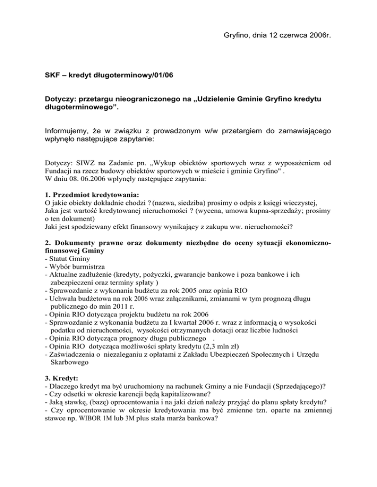 Gryfino, dnia 12 czerwca 2006r. SKF – kredyt długoterminowy/01/06 Dotyczy: przetargu nieograniczonego na „Udzielenie Gminie Gryfino kredytu długoterminowego”. Informujemy, że w związku z prowadzonym w/w przetargiem do zamawiającego wpłynęło następujące zapytanie: Dotyczy: SIWZ na Zadanie pn. „Wykup obiektów sportowych wraz z wyposażeniem od Fundacji na rzecz budowy obiektów sportowych w mieście i gminie Gryfino" . W dniu 08. 06.2006 wpłynęły następujące zapytania: 1. Przedmiot kredytowania: O jakie obiekty dokładnie chodzi ? (nazwa, siedziba) prosimy o odpis z księgi wieczystej, Jaka jest wartość kredytowanej nieruchomości ? (wycena, umowa kupna-sprzedaży; prosimy o ten dokument) Jaki jest spodziewany efekt finansowy wynikający z zakupu ww. nieruchomości? 2. Dokumenty prawne oraz dokumenty niezbędne do oceny sytuacji ekonomicznofinansowej Gminy - Statut Gminy - Wybór burmistrza - Aktualne zadłużenie (kredyty, pożyczki, gwarancje bankowe i poza bankowe i ich zabezpieczeni oraz terminy spłaty ) - Sprawozdanie z wykonania budżetu za rok 2005 oraz opinia RIO - Uchwała budżetowa na rok 2006 wraz załącznikami, zmianami w tym prognozą długu publicznego do min 2011 r. - Opinia RIO dotycząca projektu budżetu na rok 2006 - Sprawozdanie z wykonania budżetu za I kwartał 2006 r. wraz z informacją o wysokości podatku od nieruchomości, wysokości otrzymanych dotacji oraz liczbie ludności - Opinia RIO dotycząca prognozy długu publicznego . - Opinia RIO dotycząca możliwości spłaty kredytu (2,3 mln zł) - Zaświadczenia o niezaleganiu z opłatami z Zakładu Ubezpieczeń Społecznych i Urzędu Skarbowego 3. Kredyt: - Dlaczego kredyt ma być uruchomiony na rachunek Gminy a nie Fundacji (Sprzedającego)? - Czy odsetki w okresie karencji będą kapitalizowane? - Jaką stawkę, (bazę) oprocentowania i na jaki dzień należy przyjąć do planu spłaty kredytu? - Czy oprocentowanie w okresie kredytowania ma być zmienne tzn. oparte na zmiennej stawce np. WIBOR 1M lub 3M plus stała marża bankowa? Jednocześnie, z uwagi na krótki okres do przygotowania oferty prosimy o wydłużenie terminu składania ofert do dnia 26 czerwca br. Poniżej podajemy naszą odpowiedź: 1. Przypominamy, że przedmiotem zamówienia jest „Udzielenie gminie Gryfino kredytu długoterminowego... „, a nie jak to określił w swym piśmie pytający „Wykup obiektów sportowych ...”. 2. Pytania zawarte w punkcie 1 pisma. Odpowiedzi na te pytania nie mają związku z przedmiotem zamówienia. Pytania pozostawiamy więc bez odpowiedzi. 3. Pytania zawarte w punkcie 2 pisma. Statut Gminy oraz uchwała o wyborze Burmistrza są do pobrania z naszej strony internetowej www.gryfino.pl , z biuletynu informacji publicznej BIP. Oczekiwane przez wykonawcę dokumenty (odnośnik 3 do 8 w piśmie) załączone zostaną do niniejszej odpowiedzi. Odnośnie ZUS i Urzędu Skarbowego oświadczam, że Gmina nie zalega z żadnymi opłatami i podatkami na rzecz tych instytucji. 4. Pytania zwarte w punkcie 3 pisma. - Kredyt ma wpłynąć na rachunek Gminy, bo taka jest wola zamawiającego Odsetki w okresie karencji nie będą kapitalizowane Odnośnie stawki bazowej oprocentowania jak i stałości bądź zmienności oprocentowania kredytu ta decyzja pozostaje w gestii kredytodawcy. Zamawiający oczekuje w ofercie podania całkowitego i niezmiennego (stałego) kosztu kredytu, obliczonego dla całego okresu spłaty, natomiast sposób jego oszacowania (stawki oprocentowania, długoterminowa analiza trendów ekonomicznych – np. zmienność stóp w czasie itp.) jest domeną kredytodawcy. Jednocześnie, przychylając się do wniosku pytającego, zamawiający wydłuża termin składania ofert do dnia 20.06.2006 r. godz. 10.00 Zgodnie z art. 38 ust. 6 ustawy z dnia 29 stycznia 2004r. Prawo zamówień publicznych z późniejszymi zmianami Zamawiający przedłuża termin składania ofert i wyznacza się nowy termin na dzień 20.06 2006r. W związku z wydłużeniem terminu składania ofert wprowadzamy następujące zmiany do SIWZ, które stają się jej integralną częścią: VII. OPIS SPOSOBU PRZYGOTOWANIA OFERTY 7. Oferta powinna znajdować się w dwóch zamkniętych (zapieczętowanych) kopertach – zewnętrznej i wewnętrznej. Koperta zewnętrzna winna być jedynie opatrzona napisem: Gmina Gryfino Przetarg nieograniczony „Kredyt długoterminowy” Nie otwierać przed dniem 20.06.2006 r. godz. 10.30 i nie zawierać żadnych oznaczeń identyfikujących wykonawcę. VIII. SPOSÓB OBLICZENIA CENY OFERTY Cena oferty, tj. koszt udzielonego kredytu, winna być sumą wszelkich składników, będących całkowitym wynagrodzeniem wykonawcy tj. marż, prowizji , odsetek itp. Zamawiający oczekuje w ofercie podania całkowitego i niezmiennego (stałego) kosztu kredytu, obliczonego dla całego okresu spłaty, natomiast sposób jego oszacowania (stawki oprocentowania, długoterminowa analiza trendów ekonomicznych – np. zmienność stóp w czasie itp.) jest domeną kredytodawcy. Tak rozumianą cenę oferty wykonawca poda w formularzu „Oferty cenowej”. Winna ona być też uwidoczniona w planie spłaty kredytu, który ma być dołączony do „Oferty cenowej”. IX. MIEJSCE I TERMIN SKŁADANIA OFERT 2.Termin składania ofert upływa dnia 20.06.2006 roku o godz. 10.00. X. WADIUM Wadium musi obejmować okres związania ofertą, tj. 30 dni od ostatecznego terminu składania ofert. Termin wniesienia wadium upływa dnia 16.06.2006 roku. XII. OTWARCIE OFERT 1. Otwarcie ofert nastąpi w siedzibie Zamawiającego: Urząd Miasta i Gminy Gryfino, ul. 1 Maja 16, pokój Nr 30, dnia 20.06.2006 roku o godz. 10.30 . Burmistrz Miasta i Gminy Gryfino inż. Henryk Piłat Załączniki do pisma: 1. Aktualne zadłużenie (kredyty, pożyczki, gwarancje bankowe i poza bankowe i ich zabezpieczeni oraz terminy spłaty ) 2. Sprawozdanie z wykonania budżetu za rok 2005 oraz opinia RIO 3. Uchwała budżetowa na rok 2006 wraz załącznikam