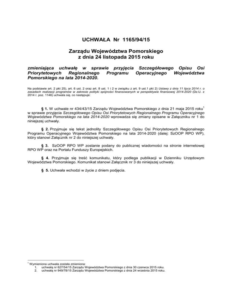 UCHWAŁA Nr 1165/94/15 Zarządu Województwa Pomorskiego z dnia 24 listopada 2015 roku zmieniająca uchwałę w sprawie przyjęcia Szczegółowego Opisu Osi Priorytetowych Regionalnego Programu Operacyjnego Województwa Pomorskiego na lata 2014-2020. Na podstawie art. 2 pkt 25), art. 6 ust. 2 oraz art. 8 ust. 1 i 2 w związku z art. 9 ust.1 pkt 2) Ustawy z dnia 11 lipca 2014 r. o zasadach realizacji programów w zakresie polityki spójności finansowanych w perspektywie finansowej 2014-2020 (Dz.U. z 2014 r. poz. 1146) uchwala się, co następuje: 1 § 1. W uchwale nr 434/43/15 Zarządu Województwa Pomorskiego z dnia 21 maja 2015 roku w sprawie przyjęcia Szczegółowego Opisu Osi Priorytetowych Regionalnego Programu Operacyjnego Województwa Pomorskiego na lata 2014-2020 wprowadza się zmiany opisane w Załączniku nr 1 do niniejszej uchwały. § 2. Przyjmuje się tekst jednolity Szczegółowego Opisu Osi Priorytetowych Regionalnego Programu Operacyjnego Województwa Pomorskiego na lata 2014-2020 (dalej: SzOOP RPO WP), który stanowi Załącznik nr 2 do niniejszej uchwały. § 3. SzOOP RPO WP zostanie podany do publicznej wiadomości na stronie internetowej RPO WP oraz na Portalu Funduszy Europejskich. § 4. Przyjmuje się treść komunikatu, który podlega publikacji w Dzienniku Urzędowym Województwa Pomorskiego. Komunikat stanowi Załącznik nr 3 do niniejszej uchwały. § 5. Uchwała wchodzi w życie z dniem podjęcia. 1 Wymieniona uchwała została zmieniona: 1. uchwałą nr 627/54/15 Zarządu Województwa Pomorskiego z dnia 30 czerwca 2015 roku. 2. uchwałą nr 949/78/15 Zarządu Województwa Pomorskiego z dnia 24 września 2015 roku. UZASADNIENIE Zarząd Województwa Pomorskiego, jako Instytucja Zarządzająca (dalej: IZ) Regionalnym Programem Operacyjnym Województwa Pomorskiego na lata 2014-2020 (dalej: RPO WP) jest odpowiedzialny za nabór, ocenę i wybór wniosków ubiegających się o dofinansowanie w ramach RPO WP. Z uwagi na ogólny charakter zapisów RPO WP konieczne jest przygotowanie dodatkowych dokumentów przedstawiających szczegółowe informacje służące realizacji Programu. Zgodnie z art. 6 ust. 2 ustawy z dnia 11 lipca 2014 r. o zasadach realizacji programów w zakresie polityki spójności finansowanych w perspektywie finansowej 2014-2020 (dalej: Ustawy) podstawę systemu realizacji programu operacyjnego stanowi między innymi szczegółowy opis osi priorytetowych programu operacyjnego. Szczegółowy Opis Osi Priorytetowych RPO WP (dalej: SzOOP RPO WP), z uwagi na poziom szczegółowości zawartych w nim informacji stanowi kompendium wiedzy, a jego podstawowym celem jest doprecyzowanie zapisów Programu oraz przekazanie potencjalnym wnioskodawcom informacji w szczególności na temat zakresu działań lub poddziałań realizowanych w ramach poszczególnych Osi Priorytetowych RPO WP. Dnia 21 maja 2015 roku Zarząd Województwa Pomorskiego uchwałą nr 434/43/15 przyjął pierwszą wersję SzOOP RPO WP. Wprowadza się zmiany w zapisach SzOOP RPO WP dotyczących Osi Priorytetowej 1 Komercjalizacja wiedzy (dalej: OP 1) i Osi Priorytetowej 2 Przedsiębiorstwa (dalej: OP 2) oraz Osi Priorytetowej 5 Zatrudnienie (dalej: OP 5), Działanie 5.1. Aktywizacja zawodowa osób bezrobotnych – projekty Powiatowych Urzędów Pracy RPO WP 2014-2020. Zmiany dotyczące OP 1 i OP 2 wynikają w szczególności z konieczności doprecyzowania i uszczegółowienia typów projektów oraz rozszerzenia zakresu limitów i ograniczeń w realizacji projektów, powołania przez IZ RPO WP Instytucji Pośredniczącej RPO WP, zatwierdzenia przez Ministra Infrastruktury i Rozwoju nowych wytycznych horyzontalnych oraz przyjęcia rozporządzeń w zakresie pomocy publicznej. Zmiany w zakresie Działania 5.1. wynikają z potrzeby zapewnienia maksymalnego wykorzystania w roku 2015 środków przewidzianych na realizację projektów pozakonkursowych powiatowych urzędów pracy w ramach RPO WP 2014-2020 prefinansowanych ze środków Funduszu Pracy (dalej: FP). Zmiana ta jest niezbędna z uwagi na trwający proces opiniowania Strategii Zintegrowanych Inwestycji Terytorialnych dla obszaru Gdańsk-Gdynia-Sopot do 2020 r. (dalej: Strategia ZIT) opracowanej w ramach Związku Zintegrowanych Inwestycji Terytorialnych. Stopień zaawansowania tego procesu wskazuje na możliwość nieuzyskania w bieżącym roku wymaganej, zgodnie z art. 30 ust. 5 pkt 2 ustawy z dnia 11 lipca 2014 r. o zasadach realizacji programów operacyjnych polityki spójności finansowanych w perspektywie finansowej 2014-2020 (Dz. U. z 2014 r., poz. 1146, ze zm.), pozytywnej opinii dotyczącej Strategii ZIT ze strony ministra właściwego do spraw rozwoju regionalnego. Przyjęcie tego dokumentu w trybie przewidzianym ustawą wdrożeniową warunkuje natomiast możliwość realizacji przedsięwzięć objętych mechanizmem ZIT, w tym także projektów powiatowych urzędów pracy prefinansowanych ze środków FP w ramach Poddziałania 5.1.1. RPO WP 2014-2020. W tym stanie rzeczy zasadne jest umożliwienie dofinansowania projektów objętych Poddziałaniem 5.1.1. RPO WP 2014-2020, których realizacja rozpoczyna się w roku 2015, poza mechanizmem ZIT, co pozwoli na realizację tych projektów niezależnie od trwającego procesu przyjmowania Strategii ZIT. Z uwagi na powyższe, istnieje konieczność modyfikacji zapisów SzOOP RPO WP w tym zakresie. Wprowadzone zmiany opisane zostały w formie rejestru stanowiącego Załącznik nr 1 do niniejszej uchwały. Tekst jednolity SzOOP RPO WP stanowi Załącznik nr 2 do niniejszej uchwały. SzOOP RPO WP zostanie podany do publicznej wiadomości na stronie internetowej RPO WP (http://rpo.pomorskie.eu) oraz na Portalu Funduszy Europejskich (http://www.funduszeeuropejskie.gov.pl). Komunikat o adresie strony internetowej oraz portalu, na których umieszczony został SzOOP RPO WP, a także o terminie, od którego niniejszy dokument obowiązuje, zostanie ogłoszony w Dzienniku Urzędowym Województwa Pomorskie