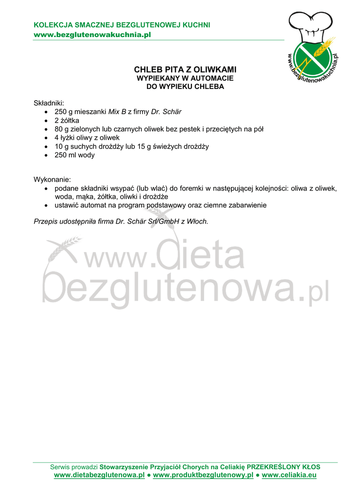 KOLEKCJA SMACZNEJ BEZGLUTENOWEJ KUCHNI www.bezglutenowakuchnia.pl CHLEB PITA Z OLIWKAMI WYPIEKANY W AUTOMACIE DO WYPIEKU CHLEBA Składniki: 250 g mieszanki Mix B z firmy Dr. Schär 2 żółtka 80 g zielonych lub czarnych oliwek bez pestek i przeciętych na pół 4 łyżki oliwy z oliwek 10 g suchych drożdży lub 15 g świeżych drożdży 250 ml wody Wykonanie: podane składniki wsypać (lub wlać) do foremki w następującej kolejności: oliwa z oliwek, woda, mąka, żółtka, oliwki i drożdże ustawić automat na program podstawowy oraz ciemne zabarwienie Przepis udostępniła firma Dr. Schär Srl/GmbH z Włoch. Serwis prowadzi Stowarzyszenie Przyjaciół Chorych na Celiakię PRZEKREŚLONY KŁOS www.dietabezglutenowa.pl ● www.produktbezglutenowy.pl ● www.celiakia.eu