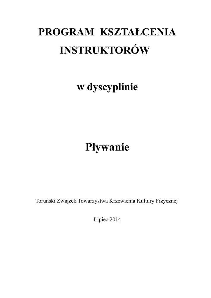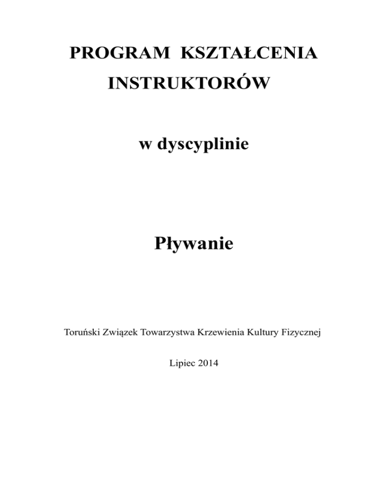 PROGRAM KSZTAŁCENIA INSTRUKTORÓW w dyscyplinie Pływanie Toruński Związek Towarzystwa Krzewienia Kultury Fizycznej Lipiec 2014 l. Cele i zadania; - zapoznanie uczestników z teoretycznymi, metodycznymi i organizacyjnymi zasadami procesu szkoleniowego, - praktyczne przygotowanie uczestników do samodzielnej pracy wychowawczo szkoleniowej, - podniesienie sprawności specjalnej uczestników, l. l .Kryteria przyjęcia kandydatów na kurs instruktorski; - zaliczenie sprawdzianu praktycznego, (poprawna demonstracja podstawowych elementów techniki indywidualnej), - przedstawienie aktualnych badań lekarskich zezwalających na udział w kursie, 1.2.Ilość godzin programowych; Wykłady: 100 godz. Ćwiczenia: 80 godz. ____________________ RAZEM - 180 godz. Wymagania egzaminacyjne: -obecność na zajęciach oraz aktywny udział w ćwiczeniach, -znajomość systematyki i metodyki nauczania techniki pływania, -znajomość metodyki kształtowania cech motorycznych, -umiejętność poprawnego demonstrowania podstawowych elementów techniki pływania, -zaliczenie pracy kontrolnej z zakresu przerobionego materiału, -zaliczenie praktyk instruktorskich - egzamin końcowy z całości materiału ( do egzaminu dopuszczeni są ci słuchacze, którzy uzyskali zaliczenie z wyżej wymienionych zagadnień ) W Rodzaj zajęć Ć 7h 3h PRZEDMIOTY PODSTAWOWE Anatomia funkcjonalna, podstawy medycyny sportu i higieny żywienia sportowców 1 Podstawy budowy ciała człowieka 2 Czynnościowe znaczenie poszczególnych układów w wysiłku fizycznym. 3 Normy żywienia i wyżywienia dla wybranych dyscyplin sportu. Odżywki w sporcie 4 Specyfika żywienia sportowców w okresie treningów, zawodów i odnowy. 5 Zespół zmęczenia, przewlekłego zmęczenia i przetrenowania sportowców. Zastosowanie odnowy biologicznej 6 Najczęstsze urazy sportowe z uwzględnienie specyfiki dyscypliny pływanie 7 Podstawy udzielania pierwszej pomocy Podstawy biochemii i fizjologii sportu 1 2 3 7h 3h Źródła energetyczne organizmu wpływające na możliwości wysiłkowe sportowca Podstawowe mechanizmy przemian dostarczających energię podczas wysiłku fizycznego- cykl Krebsa, łańcuch oddechowy Klasyfikacja wysiłków długotrwałych-podział, czynniki warunkujące maksymalny pobór tlenu Wybrane zagadnienia z biomechaniki i antropologii sportu 5h 5h 1 Podstawowe pojęcia biomechaniki –siła, moment siły, rzut pionowy, poziomy, środek ciężkości, masy ciała 2 Technika sportowa w pływaniu w ujęciu biomechanicznym 3 Metody pomiarowe za pomocą urządzeń biomechanicznych 4 Dobór osobników do uprawiania wybranej dyscypliny sportu z uwzględnieniem typu budowy ciała Psychologia i pedagogika w sporcie, socjologicznowychowawcze aspekty uprawiania sportu 1 2 3 4 5 1h Podstawowe pojęcia w psychologii i psychologii sportu-stres, emocje, motywacja, destrukcja, obserwacja, empatia, antycypacja, asertywność Sposoby indywidualnego postępowania z zawodnikiem- rozwiązywanie problemu stresu przedstartowego i startowego Autosugestia i trening mentalny w sporcie pływackim Cele i funkcje sportu, wychowanie przez sport Związki sportu ze środowiskiem społecznym. Współpraca trenera z rodziną i szkołą Prawo w sporcie, kształcenie i doszkalanie szkoleniowców 1 5h 5h 2 Ustawa o sporcie Struktura organizacyjna sportu w Polsce. Struktury państwowe, wojewódzkie, samorządowe. Działalność polskich podmiotów prowadzących działalność sportową w Polsce. 3 Marketingu w sporcie. Rynek usług sportowych Rodzaj zajęć PRZEDMIOTY KIERUNKOWE Teoretyczne podstawy teorii sportu i sportu dzieci i młodzieży 1 2 3 4. W Ć 10h 2h Miejsce i rola sportu dzieci i młodzieży w sporcie powszechnym i wyczynowym oraz w we współzawodnictwie sportowym Składowe szkolenia sportowego- pojęcie treningu, czynniki warunkujące trening. Rola trenera w procesie szkolenia sportowego. Etapowość szkolenia sportowego. Elementy warunkujące osiągnięcie mistrzostwa sportowego i właściwy przebieg kariery „talentu sportowego”. Uwarunkowania i zasady szkolenia sportowego w przebiegu ontogenezy. Okresy krytyczne w rozwoju osobniczym. Plan życiowy zawodnika. 5. Trening sportowy w pływaniu w zależności od rodzaju płci- psychologiczno- biologiczne uwarunkowania. 6. Organizacja i realizacja zawodów pływackich i zgrupowań dla dzieci. Podstawy teorii treningu sportowego 1 2 3 4 5 6 7 8 4h Dobór i selekcja do sportu wyczynowego-rodzaje, kryteria. Charakterystyka treningu sportowego w pływaniu. Struktura i zadania treningu w przygotowaniu młodego sportowca. Metodyka kształtowania podstawowych cech motorycznych-siły, szybkości, wytrzymałości, koordynacji ruchowej, gibkości Znaczenie treningu ogólnorozwojowego w kształtowaniu młodego zawodnika na poszczególnych etapach szkolenia ( trening ogólnorozwojowy w pływaniu z podziałem na różne akcenty motoryczne) Planowanie szkolenia. Plan perspektywiczny: diagnoza, prognoza, program. Cykle treningowe wieloletnie, roczne, mezocykle i mikrocykle, jednostka treningowa. Bezpośrednie Przygotowanie Sportowe- BPS, zasady i warunki stosowania w procesie szkolenia młodych sportowców. Metody treningowe i metody nauczania ruchu, kształtowania sprawności fizycznej, formy i środki szkolenia sportowego. Kontrola efektów treningu sportowego- ocena techniki, testy sprawności ogólnej i specjalnej wybranej dyscyplinie sportowej Fizjologia wysiłku fizycznego, metody oceny wydolności fizycznej 1 2 3 4 8h 3h Energetyka wysiłku- steady-state, wysiłki krótkotrwałe Kwas mlekowy i progi metaboliczne. Proste metody oceny wydolności fizycznej-wyznaczanie HRmax, próby czynnościowe Metody pomiaru maksymalnego pułapu tlenowego-bezpośrednie i pośrednie 3h Rodzaj zajęć WYKŁADY I ĆWICZENIA SPECJALISTYCZNE 1 2 3 4 5 Trening zdolności kondycyjnych i koordynacyjnych w pływaniu Nauczanie i doskonalenie technik poszczególnych stylów Szkolenie dzieci i młodzieży. Specyfika w doborze metod i form 