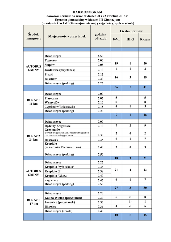 HARMONOGRAM dowozów uczniów do szkół w dniach 21 i 22 kwietnia 2015 r. Egzamin gimnazjalny w klasach III Gimnazjum (uczniowie klas I -II Gimnazjum nie mają zajęć lekcyjnych w szkole) Środek transportu AUTOBUS GMINY BUS Nr 1 11 km Liczba uczniów godzina odjazdu 0-VI III G Razem Dziaduszyce Toporów Słupów 6.50 7.00 7.05 19 1 20 Jazdowice (przystanek) Płużki Buszków Dziaduszyce (parking) 7.10 7.15 7.20 7.25 1 1 2 16 3 19 36 5 41 5 8 4 1 5 8 5 17 1 18 7 2 9 2 0 2 Miejscowość - przystanek Dziaduszyce Piaseczna Wymysłów Cyprianów/Boleszówka Dziaduszyce (parking) Dziaduszyce Rędziny Zbigalskie Grzymałów BUS Nr 2 24 km AUTOBUS GMINY BUS Nr 1 17 km (powrót drogą okrężną ok. budynku byłej szkoły - od przystanku drogą w lewo) 7.00 7.05 7.10 7.15 7.20 7.00 7.10 7.30 Raszówek Kropidło (w kierunku Racławic 1 km) 7.35 6 1 7 7.40 3 0 3 Dziaduszyce (parking) 7.50 18 3 21 21 2 23 6 1 7 27 3 30 6 4 2¹ 1¹ 2¹ 8 1 6 10 5 15 Dziaduszyce Kropidło /była szkoła/ Kropidło (2) Kropidło /Gluzy/ Zagorzany Dziaduszyce (parking) Dziaduszyce Kalina Wielka (przystanek) Janowice (przystanek) Ilkowice Dziaduszyce (szkoła) 7.25 7.35 7.38 7.40 7.45 7.50 7.20 7.30 7.33 7.36 7.40 HARMONOGRAM dowozów uczniów do szkół w dniach 21 i 22 kwietnia 2015 r. Egzamin gimnazjalny w klasach III Gimnazjum (uczniowie klas I -II Gimnazjum nie mają zajęć lekcyjnych w szkole) 0+SP Gimnazjum Razem kl. III Jan. Dziaduszyce 7.50 16 16 Ilkowice (przystanek) 7.55 Janowice (przystanek) 8.00 5 1 6 Rędziny Borek 8.05 AUTOBUS 15 15 Kalina Wielka 8.10 GMINY 18 18 Śladów 8.15 Janowice (szkoła) 8.20 Ilkowice (przystanek) 8.25 Dziaduszyce (parking) 8.30 54 1 55 BUS NR 1 21 km Dziaduszyce 7.40 Rzemiędzice Kresy Święcice (remiza) Święcice (ok. posesji sołtysa) Janowice (szkoła) Maciejów Janowice (szkoła) Ilkowice Dziaduszyce (parking) 7.45 7.50 7.55 8.00 8.05 8.10 8.15 8.20 8.25 1 1 2 1 1 2 10 3 13 5 17 179 SP Janowice kl. 0 – VI 71 uczniów SP Dziaduszyce kl. 0 – VI 108 uczniów Gimnazjum w Dziaduszycach kl. III - 23 uczniów ¹ uczniowie mogą jechać także jednym z późniejszych kursów. 5 5 23 22 202