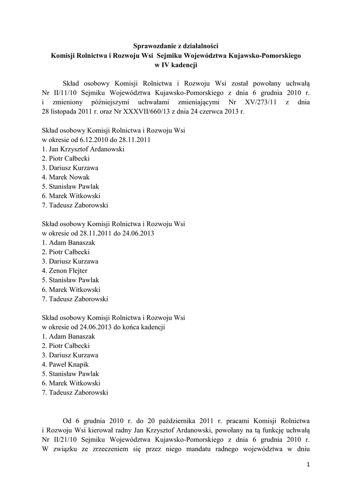 Sprawozdanie z działalności Komisji Rolnictwa i Rozwoju Wsi Sejmiku Województwa Kujawsko-Pomorskiego w IV kadencji Skład osobowy Komisji Rolnictwa i Rozwoju Wsi został powołany uchwałą Nr II/11/10 Sejmiku Województwa Kujawsko-Pomorskiego z dnia 6 grudnia 2010 r. i zmieniony późniejszymi uchwałami zmieniającymi Nr XV/273/11 z dnia 28 listopada 2011 r. oraz Nr XXXVII/660/13 z dnia 24 czerwca 2013 r. Skład osobowy Komisji Rolnictwa i Rozwoju Wsi w okresie od 6.12.2010 do 28.11.2011 1. Jan Krzysztof Ardanowski 2. Piotr Całbecki 3. Dariusz Kurzawa 4. Marek Nowak 5. Stanisław Pawlak 6. Marek Witkowski 7. Tadeusz Zaborowski Skład osobowy Komisji Rolnictwa i Rozwoju Wsi w okresie od 28.11.2011 do 24.06.2013 1. Adam Banaszak 2. Piotr Całbecki 3. Dariusz Kurzawa 4. Zenon Flejter 5. Stanisław Pawlak 6. Marek Witkowski 7. Tadeusz Zaborowski Skład osobowy Komisji Rolnictwa i Rozwoju Wsi w okresie od 24.06.2013 do końca kadencji 1. Adam Banaszak 2. Piotr Całbecki 3. Dariusz Kurzawa 4. Paweł Knapik 5. Stanisław Pawlak 6. Marek Witkowski 7. Tadeusz Zaborowski Od 6 grudnia 2010 r. do 20 października 2011 r. pracami Komisji Rolnictwa i Rozwoju Wsi kierował radny Jan Krzysztof Ardanowski, powołany na tą funkcję uchwałą Nr II/21/10 Sejmiku Województwa Kujawsko-Pomorskiego z dnia 6 grudnia 2010 r. W związku ze zrzeczeniem się przez niego mandatu radnego województwa w dniu 1 20 października 2011 r. zaszła konieczność wyboru i powołania nowego przewodniczącego Komisji. Na wniosek Komisji na nowego przewodniczącego Komisji Rolnictwa i Rozwoju Wsi powołano uchwałą Nr XV/286/11 z dnia 28 listopada 2011 r. radnego Zenona Flejtera, który pełnił tą funkcję do momentu wygaśnięcia mandatu radnego województwa w dniu 20 maja 2013 r. Na wniosek Komisji na funkcję nowego przewodniczącego został powołany radny Paweł Knapik (uchwała Nr XXXVII/663/13 z dnia 24 czerwca 2013 r.). Od samego początku istnienia Komisji funkcję wiceprzewodniczącego pełni radny Tadeusz Zaborowski. Członkowie Komisji Rolnictwa i Rozwoju Wsi spotkali się w okresie od grudnia 2010 r. do października 2014 r. na 58 posiedzeniach. Na 7 posiedzeniach Komisja nie miała quorum (21.04.2011, 19.08.2011, 19.03.2013, 17.09.2013, 12.11.2013, 11.06.2014, 20.10.2014) i nie była władna, żeby podejmować decyzje wymagające głosowania. Jednak z uwagi na długotrwałe przygotowania posiedzenia (były to głównie posiedzenia wyjazdowe) i ze względu na zaproszonych gości – założone tematy były na tych posiedzeniach omawiane, a wnioski, do których doszli obecni na posiedzeniu członkowie Komisji były przedstawiane i głosowane na następnym posiedzeniu Komisji, na którym było quorum. Łącznie Komisja Rolnictwa i Rozwoju Wsi zorganizowała w IV kadencji 8 posiedzeń wyjazdowych, które odbyły się w: w Pałacu w Kobylnikach-Kruszwicy (10.02.2011), w gospodarstwie agroturystycznym Daglezjowy Dwór w Sąsiecznie, Gmina Osiek (21.04.2011), w siedzibie Zespołu Gospodarki Rybacko-Wędkarskiej Okręgu PZW Toruń w Grzmięcy (19.08.2011), w Biurze Terenowym Kujawsko-Pomorskiego Zarządu Melioracji i Urządzeń Wodnych w Świeciu (19.03.2013), w siedzibie Lokalnej Grupy Działania „Gminy Powiatu Świeckiego” w Świeciu (17.09.2013), w gospodarstwie agroturystycznym państwa Horodeckich w Olszewce k. Nakła nad Notecią (18.03.2014), w siedzibie Kujawsko-Pomorskiego Zarządu Melioracji i Urządzeń Wodnych we Włocławku (11.06.2014 – pierwsza część posiedzenia), w Ośrodku Hodowli Zarodowej Sp. z o.o. w Osięcinach (11.06.2014 – druga część posiedzenia), w Otwartej Strefie Twórczej w Grucznie podczas IX edycji Festiwalu Smaku (23.08.2014) Komisja Rolnictwa i Rozwoju Wsi współpracowała z innymi komisjami Sejmiku Województwa Kujawsko-Pomorskiego organizując wspólne posiedzenia na tematy dotyczące pracy obu Komisji. Wspólne posiedzenia odbyły się: 21.09.2011 z Komisją Polityki Regionalnej, Rozwoju Województwa i Infrastruktury. Omawiane tematy to: 1. Założenia i harmonogram aktualizacji strategii rozwoju województwa ze szczególnym uwzględnieniem wsi i obszarów wiejskich. 2 2. Potencjał surowcowy i przetwórczy rolnictwa województwa kujawskopomorskiego. 3. Obszary wiejskie w projekcie koncepcji zagospodarowania przestrzennego województwa kujawsko-pomorskiego. 4. Dotychczasowe doświadczenia PROW w rozwoju obszarów wiejskich województwa kujawsko-pomorskiego – wnioski na przyszłość. 5. Zagadnienia związane z aktualizacją strategii rozwoju województwa kujawskopomorskiego. 5.04.2012 z Komisją Ochrony Środowiska, Gospodarki Wodnej i Poszanowania Energii na temat projektu rozporządzenia dyrektorów RZGW dotyczącego OSN. Szczególną uwagę w IV kadencji Komisja Rolnictwa i Rozwoju Wsi skupiła na sprawach związanych z gospodarką wodną na terenach wiejskich. Przez całą kadencję powracał temat melioracji oraz zabezpieczenia przeciwpowodziowego. Debatę nad funkcjonowaniem systemów melioracji podstawowych i szczegółowych na terenie województwa kujawsko-pomorskiego rozpoczęło wyjazdowe posiedzenie Komisji Rolnictwa i Rozwoju Wsi w dniu 10 lutego 2011 r. poprzedzone wizytacją terenów zalanych przez Kanał Parachański, stacji pomp w Słońsku oraz Kanału Bachorza Mała i Duża. Podczas wizytacji Komisji towarzyszyli wójtowie gminy Dąbrowa Biskupia (Roman Wieczorek) i Inowrocław (Tadeusz Kacprzak), przedstawiciele Kujawsko-Pomorskiego Zarządu Melioracji i Urządzeń Wodnych we Włocławku, przedstawiciele spółek wodnych oraz rolnicy – właściciele zalanych gruntów. Chociaż bezpośrednią przyczyną podtopień i zalewisk (o wielkości nawet do kilkunastu hektarów) były warunki pogodowe panujące zimą 2010/2011, to nikt nie miał wątpliwości, że prawdziwym powodem sytuacji były wieloletnie zaniedbania w zakresie konserwacji głównych cieków wodnych. Należy podkreślić, że Komisja Rolnictwa i Rozwoju Wsi przez cztery lata swoj