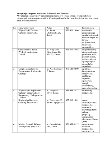 Instytucje związane z ochrona środowiska w Toruniu Aby chronić cenne walory przyrodnicze miasta w Toruniu istnieje wiele instytucji związanych z ochroną środowiska. W razie problemów lub wątpliwości można skorzystać z ich rady lub pomocy. Lp. Nazwa instytucji 1. Wojewódzki Fundusz Ochrony Środowiska Adres ul. Szosa Chełmińska 28, Toruń Tel 056 621 23 00 2. Gmina Miasta Toruń Wydział środowiska i Zieleni ul. Wały Gen. Sikorskiego 12, 87-100, Toruń 056 611 86 93 3. Urząd Marszałkowski Departament Środowiska i Geologii ul. Plac Teatralny 2, Toruń 056 621 84 00 4. Wojewódzki Inspektorat Ochrony Środowiska w Bydgoszczy, Delegatura w Toruniu Regionalna Dyrekcja Ochrony Środowiska ul. Targowa 13/15, Toruń 056 655 37 27 Miejski Ośrodek Edukacji Ekologicznej przy MPO ul. Grudziądzka 159, Toruń 5. 6. ul. Dworcowa 63, 052 518 18 01 85-950 Bydgoszcz 056 639 81 19 Kompetencje wspieranie przedsięwzięć proekologicznych realizowanych na terenie województwa kujawskopomorskiego miejskie tereny zieleni, ochrona powietrza, wód, poziom hałasu, rejestr zwierząt egzotycznych, gospodarka odpadami opłaty za korzystanie ze środowiska, problemy odpadów, opakowań, energii odnawialnej, prawo łowieckie monitoring środowiska ocena oddziaływań na środowisko, tworzenie i likwidacja form ochrony przyrody, zarządzanie obszarami Natura 2000 promowanie wiedzy o środowisku, zwłaszcza w 7. Ogród Zoobotaniczny ul. Bydgoska 7, Toruń 8. Miejskie Schronisko dla Zwierząt ul. 056 622-48-87 Przybyszewskiego 3, Toruń 9. Powiatowa Stacja Sanitarno- ul. Sz. Bydgoska Epidemiologiczna w 1, Toruń Toruniu 10. Komenda Miejska Państwowej Straży Pożarnej w Toruniu ul. Legionów 70/76, 87-100 Toruń 056 622 42 10 056 622 50 29 056 611 92 00, 056 659 71 13 alarmowy: 998 11. Straż Miejska w Toruniu ul. Grudziądzka 157, 87-100 Toruń 056 622 58 77, 056 621 00 44, 056 621 06 91 alarmowy: 986 12. Pracownia Zrównoważonego Rozwoju ul. Podgórna 50/3, Toruń 056 649 42 60 13. Polski Klub Ekologiczny Okręg Pomorsko - Kujawski ul. Pl. Św. Katarzyny 3 Toruń 056 652 23 22 dziedzinie utrzymania czystości na ulicach, wywozu odpadów, unieszkodliwiania ich hodowla zwierząt egzotycznych, opieka nad zwierzętami opieka nad zwierzętami, pomoc bezdomnym zwierzętom nadzór nad higieną środowiska, zapobieganie chorobom, działalność oświatowo zdrowotna walka z pożarami, klęskami żywiołowymi, lokalnymi zagrożeniami porządek w miejscach publicznych, kontrola ruchu drogowego, informowanie społeczności lokalnej o zagrożeniach wdrażanie w życie idei zrównoważonego rozwoju realizacja idei ekorozwoju; kształtowanie poprzez powszechną edukacje ekologiczną 14. Państwowa Straż Rybacka ul. Plac Teatralny 2, Toruń Ogólnopolskie Towarzystwo ul. Szpitalna 8, Ochrony Zwierząt Animals Toruń 056 6218424 16. Toruńskie Towarzystwo Ochrony Praw Zwierząt ul. Mickiewicza 49, Toruń 661 826 056 17. Fundacja Kot – Koty otoczone troską ul. Kusocińskiego 16 B / 27, Toruń 698 175 160 18. Empatia 19. Liga Ochrony Przyrody Zarząd Okręgu w Toruniu Polskie Towarzystwo Leśne Oddział w Toruniu 15. 20. 056 6549607 696 641 906 ul. Mickiewicza 9 ul. Mickiewicza 9 056 658 43 45 kontrola nad połowami ryb działania związane z ochroną zwierząt, interwencje w przypadkach okrucieństwa wobec zwierząt walka z okrucieństwem wobec zwierząt, edukacja najmłodszych, sterylizacja, chipowanie psów i kotów opieka nad kotami, adopcje kotów kampanie i interwencje w obronie praw zwierząt edukacja ekologiczna popularyzacja wiedzy o lasach, badania naukowe