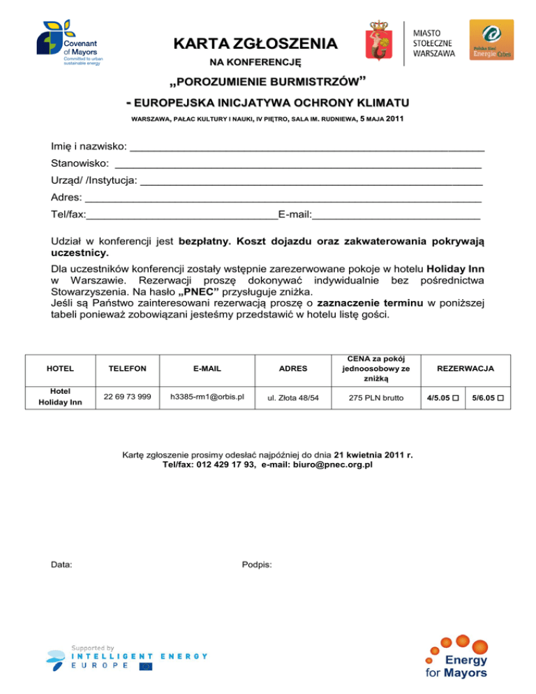 KARTA ZGŁOSZENIA NA KONFERENCJĘ „POROZUMIENIE BURMISTRZÓW” - EUROPEJSKA INICJATYWA OCHRONY KLIMATU WARSZAWA, PAŁAC KULTURY I NAUKI, IV PIĘTRO, SALA IM. RUDNIEWA, 5 MAJA 2011 Imię i nazwisko: ___________________________________________________________ Stanowisko: _____________________________________________________________ Urząd/ /Instytucja: _________________________________________________________ Adres: __________________________________________________________________ Tel/fax:________________________________E-mail:____________________________ Udział w konferencji jest bezpłatny. Koszt dojazdu oraz zakwaterowania pokrywają uczestnicy. Dla uczestników konferencji zostały wstępnie zarezerwowane pokoje w hotelu Holiday Inn w Warszawie. Rezerwacji proszę dokonywać indywidualnie bez pośrednictwa Stowarzyszenia. Na hasło „PNEC” przysługuje zniżka. Jeśli są Państwo zainteresowani rezerwacją proszę o zaznaczenie terminu w poniższej tabeli ponieważ zobowiązani jesteśmy przedstawić w hotelu listę gości. HOTEL TELEFON E-MAIL ADRES CENA za pokój jednoosobowy ze zniżką Hotel Holiday Inn 22 69 73 999 [email protected] ul. Złota 48/54 275 PLN brutto Kartę zgłoszenie prosimy odesłać najpóźniej do dnia 21 kwietnia 2011 r. Tel/fax: 012 429 17 93, e-mail: [email protected] Data: Podpis: REZERWACJA 4/5.05 5/6.05