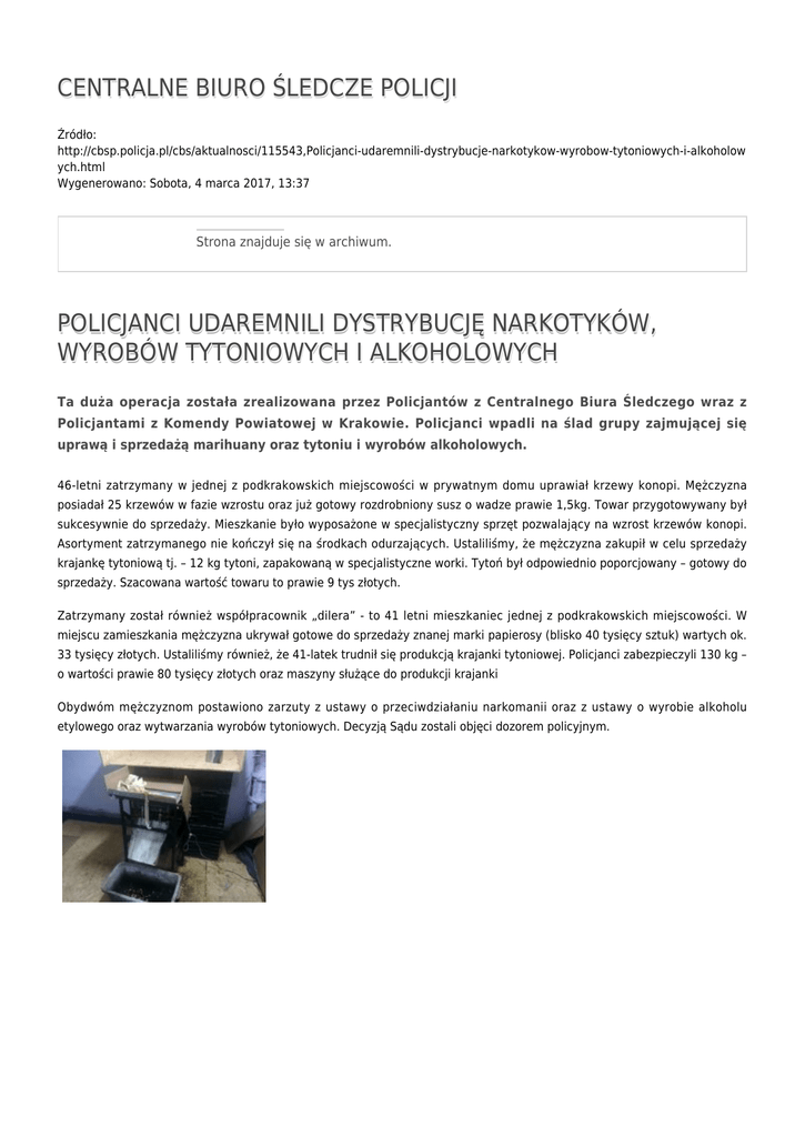 CENTRALNE BIURO ŚLEDCZE POLICJI Źródło: http://cbsp.policja.pl/cbs/aktualnosci/115543,Policjanci-udaremnili-dystrybucje-narkotykow-wyrobow-tytoniowych-i-alkoholow ych.html Wygenerowano: Sobota, 4 marca 2017, 13:37 Strona znajduje się w archiwum. POLICJANCI UDAREMNILI DYSTRYBUCJĘ NARKOTYKÓW, WYROBÓW TYTONIOWYCH I ALKOHOLOWYCH Ta duża operacja została zrealizowana przez Policjantów z Centralnego Biura Śledczego wraz z Policjantami z Komendy Powiatowej w Krakowie. Policjanci wpadli na ślad grupy zajmującej się uprawą i sprzedażą marihuany oraz tytoniu i wyrobów alkoholowych. 46-letni zatrzymany w jednej z podkrakowskich miejscowości w prywatnym domu uprawiał krzewy konopi. Mężczyzna posiadał 25 krzewów w fazie wzrostu oraz już gotowy rozdrobniony susz o wadze prawie 1,5kg. Towar przygotowywany był sukcesywnie do sprzedaży. Mieszkanie było wyposażone w specjalistyczny sprzęt pozwalający na wzrost krzewów konopi. Asortyment zatrzymanego nie kończył się na środkach odurzających. Ustaliliśmy, że mężczyzna zakupił w celu sprzedaży krajankę tytoniową tj. – 12 kg tytoni, zapakowaną w specjalistyczne worki. Tytoń był odpowiednio poporcjowany – gotowy do sprzedaży. Szacowana wartość towaru to prawie 9 tys złotych. Zatrzymany został również współpracownik „dilera” - to 41 letni mieszkaniec jednej z podkrakowskich miejscowości. W miejscu zamieszkania mężczyzna ukrywał gotowe do sprzedaży znanej marki papierosy (blisko 40 tysięcy sztuk) wartych ok. 33 tysięcy złotych. Ustaliliśmy również, że 41-latek trudnił się produkcją krajanki tytoniowej. Policjanci zabezpieczyli 130 kg – o wartości prawie 80 tysięcy złotych oraz maszyny służące do produkcji krajanki Obydwóm mężczyznom postawiono zarzuty z ustawy o przeciwdziałaniu narkomanii oraz z ustawy o wyrobie alkoholu etylowego oraz wytwarzania wyrobów tytoniowych. Decyzją Sądu zostali objęci dozorem policyjnym. Zainstaluj wtyczkę Flash, aby zobaczyć odtwarzacz. pobierz film - 8.92 MB Ocena: 1.2/5 (9) Tweetnij
