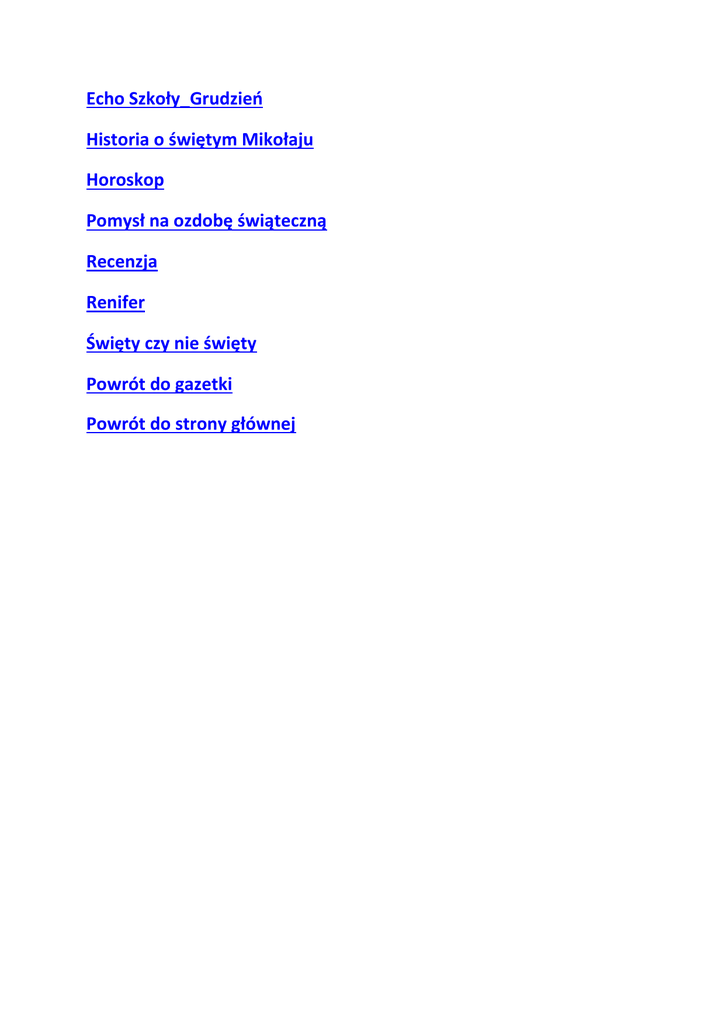 Echo Szkoły_Grudzień Historia o świętym Mikołaju Horoskop Pomysł na ozdobę świąteczną Recenzja Renifer Święty czy nie święty Powrót do gazetki Powrót do strony głównej