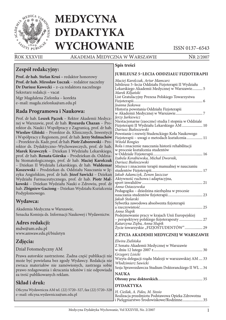 MEDYCYNA DYDAKTYKA WYCHOWANIE ROK XXXVIII AKADEMIA MEDYCZNA W WARSZAWIE NR 2/2007 Spis treści Zespół redakcyjny: Prof. dr hab. Stefan Kruś – redaktor honorowy Prof. dr hab. Mirosław Łuczak – redaktor naczelny Dr Dariusz Kawecki – z–ca redaktora naczelnego Sekretarz redakcji – vacat Mgr Magdalena Zielonka – korekta e–mail: [email protected] Rada Programowa i Naukowa: Prof. dr hab. Leszek Pączek – Rektor Akademii Medycznej w Warszawie, prof. dr hab. Ryszarda Chazan – Prorektor ds. Nauki i Współpracy z Zagranicą, prof. dr hab. Wiesław Gliński – Prorektor ds. Klinicznych, Inwestycji i Współpracy z Regionem, prof. dr hab. Jerzy Stelmachów – Prorektor ds. Kadr, prof. dr hab. Piotr Zaborowski – Prorektor ds. Dydaktyczno–Wychowawczych, prof. dr hab. Marek Krawczyk – Dziekan I Wydziału Lekarskiego, prof. dr hab. Renata Górska – Prodziekan ds. Oddziału Stomatologicznego, prof. dr hab. Maciej Karolczak – Dziekan II Wydziału Lekarskiego, dr hab. Waldemar Koszewski – Prodziekan ds. Oddziału Nauczania w Języku Angielskim, prof. dr hab. Józef Sawicki – Dziekan Wydziału Farmaceutycznego, prof. dr hab. Piotr Małkowski – Dziekan Wydziału Nauki o Zdrowiu, prof. dr hab. Zbigniew Gaciong – Dziekan Wydziału Kształcenia Podyplomowego. Wydawca: Akademia Medyczna w Warszawie, Senacka Komisja ds. Informacji Naukowej i Wydawnictw. Adres redakcji: [email protected] www.amwaw.edu.pl/biuletyn ISSN 0137–6543 Jubileusz 5–lecia oddziału fizjoterapii Maciej Karolczak, Artur Mamcarz Jubileusz 5–lecia Oddziału Fizjoterapii II Wydziału Lekarskiego Akademii Medycznej w Warszawie............ 5 Marek Kiljański List Gratulacyjny Prezesa Polskiego Towarzystwa Fizjoterapii........................................................................... 6 Joanna Juskowa Historia powstania Oddziału Fizjoterapii w Akademii Medycznej w Warszawie.............................. 7 Jerzy Jurkiewicz Niestacjonarne (zaoczne) studia I stopnia w Oddziale Fizjoterapii II Wydziału Lekarskiego AM....................... 10 Dariusz Białoszewski Powstanie i rozwój Studenckiego Koła Naukowego Fizjoterapii – uwagi o metodach kształcenia.................. 11 Witold Rongies Rola i znaczenie nauczania historii rehabilitacji w procesie kształcenia studentów w Oddziale Fizjoterapii...................................................... 16 Izabela Korabiewska, Michał Dwornik, Dariusz Białoszewski Miejsce i znaczenie terapii manualnej w nauczaniu studentów Fizjoterapii....................................................... 17 Jakub Adamczyk, Zenon Jaszczur Aktywność ruchowa i adaptacyjna, sport inwalidów.................................................................. 21 Anna Ostaszewska Pedagogika – dziedzina niezbędna w procesie nauczania studentów fizjoterapii...................................... 23 Jakub Stolarski Sylwetka zawodowa absolwenta fizjoterapii a rzeczywistość.................................................................... 25 Anna Słupik Podejmowanie pracy w krajach Unii Europejskiej – perspektywy polskiego fizjoterapeuty.......................... 27 Katarzyna Zięba, Anna Słupik Życie towarzyskie „fizjostudentów”.................... 29 Z ŻYCIA AKADEMII MEDYCZNEJ W WARSZAWIE Elwira Zielińska Zdjęcia: Z Senatu Akademii Medycznej w Warszawie Dział Fotomedyczny AM w dniu 12 lutego 2007 r...................................................... 30 Prawa autorskie zastrzeżone. Żadna część publikacji nie Grzegorz Lisicki może być powielana bez zgody Wydawcy. Redakcja nie Wizyta delegacji rządu Malezji w warszawskiej AM..... 33 Włodzimierz Sawicki zwraca materiałów nie zamówionych, zastrzega sobie Sesja Sprawozdawcza Studium Doktoranckiego II WL.... 34 prawo redagowania i skracania tekstów i nie odpowiada Nauka za treść publikowanych reklam. Obrony prac doktorskich................................................ 35 Skład i druk: Dydaktyka Oficyna Wydawnicza AM tel. (22) 5720–327, fax (22) 5720–328 H. Cieślak, A. Fidos, M. Stosio e–mail: [email protected] Realizacja przedmiotu Podstawowa Opieka Zdrowotna i Pielęgniarstwo Środowiskowe/Rodzinne......................35 Medycyna Dydaktyka Wychowanie, Vol XXXVIII, No. 2/2007 1 Zeszyt Jubileuszowy „Medycyny Dydaktyki Wychowania” z okazji 5–lecia Oddziału Fizjoterapii ukazuje się pod Patronatem Dziekana II Wydziału Lekarskiego prof. dr hab. n. med. Macieja Karolczaka Redaktorzy prowadzący: Dr n. med. Dariusz Białoszewski Dr hab. n. med. Artur Mamcarz Mgr Joanna Gotlib 2 Medycyna Dydaktyka Wychowanie, Vol XXXVIII, No. 2/2007 Jubileusz 5 – lecia Oddziału Fizjoterapii Medycyna Dydaktyka Wychowanie, Vol XXXVIII, No. 2/2007 3 Władze Oddziału Fizjoterapii II Wydziału Lekarskiego Akademii Medycznej w Warszawie w latach 2001 – 2005 Prof. dr hab. med. Jerzy Stelmachów Dziekan II Wydziału Lekarskiego Dr hab. med. Joanna Juskowa, prof. nadzw. Prodziekan ds. Oddziału Fizjoterapii w latach 2005–2009 Prof. dr hab. med. Maciej Karolczak Dziekan II Wydziału Lekarskiego Dr hab. med. Artur Mamcarz prof. nadzw. Prodziekan ds. Oddziału Fizjoterapii Pełnomocnik Rektora ds. Studiów Zaocznych w Oddziale Fizjoterapii w latach 2004 – 2009 Dr hab. med. Jerzy Jurkiewicz, prof. nadzw. Medycyna Dydaktyka Wychowanie, Vol XXXVIII, No. 2/2007 Jubileusz 5 – lecia Oddziału Fizjoterapii JUBILEUSZ 5–LECIA ODDZIAŁU FIZJOTERAPII II WYDZIAŁU LEKARSKIEGO AKADEMII MEDYCZNEJ W WARSZAWIE Prof. nadzw. dr hab. med. Artur Mamcarz działu. Powstało wiele bardzo wartościowych opracowań z niezwykle szerokiego zakresu. Niektórzy Prodziekan ds. Oddziału Fizjoterapii zajęli się fizjoterapią w ortopedii, neurologii, neurochirurgii, inni w pediatrii, kardiologii dziecięcej Prof. dr hab. med. Maciej Karolczak i kardiologii dorosłych. Były prace dotyczące hipoDziekan II WL AM w Warszawie terapii i muzykoterapii. Wiele osób – nauczycieli akademickich – uczestniczyło w Komisjach