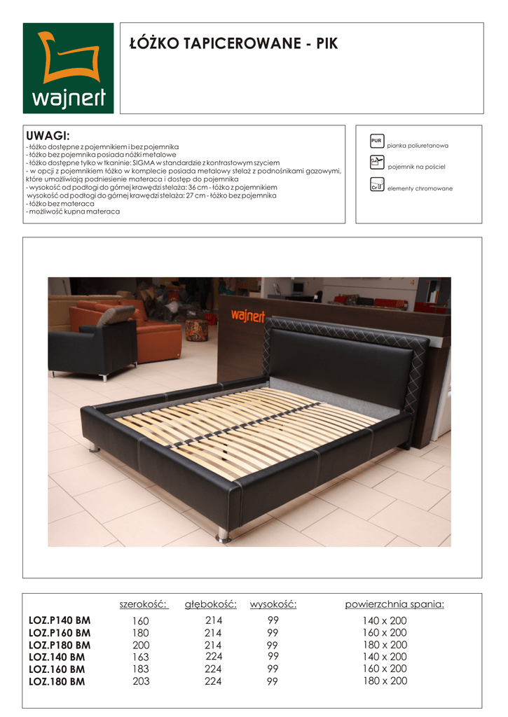 ŁÓŻKO TAPICEROWANE - PIK UWAGI: PUR - łóżko dostępne z pojemnikiem i bez pojemnika - łóżko bez pojemnika posiada nóżki metalowe - łóżko dostępne tylko w tkaninie: SIGMA w standardzie z kontrastowym szyciem - w opcji z pojemnikiem łóżko w komplecie posiada metalowy stelaż z podnośnikami gazowymi, które umożliwiają podniesienie materaca i dostęp do pojemnika - wysokość od podłogi do górnej krawędzi stelaża: 36 cm - łóżko z pojemnikiem wysokość od podłogi do górnej krawędzi stelaża: 27 cm - łóżko bez pojemnika - łóżko bez materaca - możliwość kupna materaca LOZ.P140 BM LOZ.P160 BM LOZ.P180 BM LOZ.140 BM LOZ.160 BM LOZ.180 BM szerokość: głębokość: wysokość: 160 180 200 163 183 203 214 214 214 224 224 224 99 99 99 99 99 99 pianka poliuretanowa pojemnik na pościel Cr elementy chromowane powierzchnia spania: 140 x 200 160 x 200 180 x 200 140 x 200 160 x 200 180 x 200