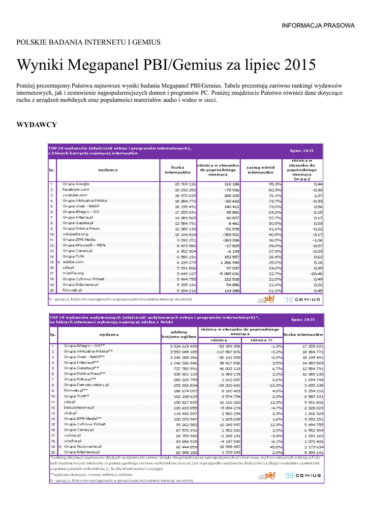 INFORMACJA PRASOWA POLSKIE BADANIA INTERNETU I GEMIUS Wyniki Megapanel PBI/Gemius za lipiec 2015 Poniżej prezentujemy Państwu najnowsze wyniki badania Megapanel PBI/Gemius. Tabele prezentują zarówno rankingi wydawców internetowych, jak i zestawienie najpopularniejszych domen i programów PC. Poniżej znajdziecie Państwo również dane dotyczące ruchu z urządzeń mobilnych oraz popularności materiałów audio i wideo w sieci. WYDAWCY INFORMACJA PRASOWA DOMENY INFORMACJA PRASOWA PROGRAMY PC INFORMACJA PRASOWA MOBILE INFORMACJA PRASOWA AUDIO I WIDEO INFORMACJA PRASOWA Dane należy cytować powołując się na następujący zapis: źródło: Megapanel PBI/Gemius, lipiec 2015 (od kwietnia 2013 r. wyniki uwzględniają nowe zasady grupowania witryn i aplikacji; więcej na: http://www.audience.gemius.pl) O badaniu Megapanel PBI/Gemius to ogólnopolskie badanie Internetu realizowane przez firmę Gemius na zlecenie spółki Polskie Badania Internetu. Na jego podstawie publikowane są dane statystyczne, które prezentują oglądalność stron www i aplikacji, korzystanie z materiałów audio i wideo w Polsce oraz związane z nimi profile społeczno-demograficzne internautów. Badanie jest pierwszym i jedynym obowiązującym standardem pomiaru oglądalności internetu w Polsce. Pierwsze dane opublikowano w październiku 2004 roku. Wyniki są publikowane co miesiąc. Dane z badania Megapanel PBI/Gemius służą reklamodawcom, agencjom reklamowym i domom mediowym do szacowania potencjału reklamowego stron www i planowania kampanii online. Korzystają z nich również wydawcy, którzy na ich podstawie szacują udział własny w rynku internetowym i wyceniają powierzchnie reklamowe, którymi dysponują. Metodologia badania opiera się na pomiarze user-centric (dane gromadzone metodą panelową na grupie internautów, którzy zgodzili się na udział w badaniu) oraz audycie site-centric (dane o oglądalności witryn gromadzone na podstawie kodów zliczających umieszczonych w kodach źródłowych stron www). Badanie jest realizowane zgodnie z wytycznymi i standardami badawczymi międzynarodowego kodeksu ICC/ESOMAR, obejmuje kilka tysięcy polskich i zagranicznych stron www, w tym aplikacje. Więcej o badaniu: www.audience.gemius.pl. Liczebność próby: N=6 227. Grupa objęta badaniem 7+. Do badania wykorzystano dane o strukturze demograficznej pochodzące z badania NetTrack Millward Brown SMG/KRC prowadzonego na próbie dobieranej i ważonej przez PBC. Przydatne linki: Opis metodologii: http://www.gemius.pl/pl/badania_audience_informacje Wersja demonstracyjna wyników badania: http://www.gemius.pl/pl/badania_audience_demo (plik demo prezentuje wyniki badania za styczeń 2005 r. i umożliwia zapoznanie się ze wszystkimi funkcjami aplikacji gemiusExplorer) Polskie Badania Internetu Sp. z o.o. (PBI) Firma tworzona przez czołowych wydawców w Polsce, właścicieli największych krajowych witryn internetowych: Agora S.A., Onet.pl S.A., Interia.pl sp. z o.o., Wirtualna Polska S.A., GG Network S. A., Murator S.A., Polskapresse Sp. z o.o., Ringier Axel Springer Polska Sp. z o.o. oraz Redefine Sp. z o.o. - w celu stworzenia standardu badań internetu w Polsce. PBI promuje wiarygodne i rzetelne badania polskiego internetu, jako nieodzowne narzędzia dla podmiotów korzystających z reklamy on-line. Misją PBI jest przyczynienie się do rozwoju polskiego internetu, jako medium zbadanego i tym samym wiarygodnego dla reklamodawców, agencji reklamowych inwestorów oraz firm, których działalność jest związana z internetem. Gemius Gemius to polska firma, która doradza przedsiębiorcom, jak wykorzystywa internet w biznesie. Od 15 lat bada internautów pod kątem korzystania z mediów cyfrowych, tworząc w ten sposób unikalny socjodemograficzny profil ekonsumentów. Mierzy oglądalność stron www i aplikacji, a także materiałów audio i wideo z poszczególnych źródeł ruchu, tj. komputerów, tabletów i smartfonów. Gemius działa w 37 krajach w Europie, Afryce Północnej i na Bliskim Wschodzie (region EMEA), a w 17 z nich posiada oddziały. Jego klientami są reklamodawcy, wydawcy, domy mediowe, agencje reklamowe i firmy z sektora e-commerce. Prowadzone przez firmę badania realizowane są zgodnie z zasadami międzynarodowego kodeksu ICC/ESOMAR. Więcej: www.gemius.pl. Kontakt dla prasy: PBI: Anna Miotk kom.: 606 611 500 e-mail: [email protected] Gemius: Natalia Osica kom. +48 691 145 300 e-mail: [email protected]