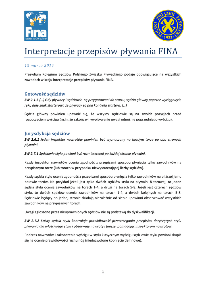 Interpretacje przepisów pływania FINA 13 marca 2014 Prezydium Kolegium Sędziów Polskiego Związku Pływackiego podaje obowiązujące na wszystkich zawodach w kraju interpretacje przepisów pływania FINA. Gotowość sędziów SW 2.1.5 (…) Gdy pływacy i sędziowie są przygotowani do startu, sędzia główny poprzez wyciągnięcie ręki, daje znak starterowi, że pływacy są pod kontrolą startera. (…) Sędzia główny powinien upewnić się, że wszyscy sędziowie są na swoich pozycjach przed rozpoczęciem wyścigu (m.in. że zakończyli wypisywanie uwagi odnośnie poprzedniego wyścigu). Jurysdykcja sędziów SW 2.6.1 Jeden inspektor nawrotów powinien być wyznaczony na każdym torze po obu stronach pływalni. SW 2.7.1 Sędziowie stylu powinni być rozmieszczeni po każdej stronie pływalni. Każdy inspektor nawrotów ocenia zgodność z przepisami sposobu płynięcia tylko zawodników na przypisanym torze (lub torach w przypadku niewystarczającej liczby sędziów). Każdy sędzia stylu ocenia zgodność z przepisami sposobu płynięcia tylko zawodników na bliższej jemu połowie torów. Na przykład jeżeli jest tylko dwóch sędziów stylu na pływalni 8 torowej, to jeden sędzia stylu ocenia zawodników na torach 1-4, a drugi na torach 5-8. Jeżeli jest czterech sędziów stylu, to dwóch sędziów ocenia zawodników na torach 1-4, a dwóch kolejnych na torach 5-8. Sędziowie będący po jednej stronie działają niezależnie od siebie i powinni obserwować wszystkich zawodników na przypisanych torach. Uwagi zgłoszone przez nieuprawnionych sędziów nie są podstawą do dyskwalifikacji. SW 2.7.2 Każdy sędzia stylu kontroluje prawidłowość przestrzegania przepisów dotyczących stylu pływania dla właściwego stylu i obserwuje nawroty i finisze, pomagając inspektorom nawrotów. Podczas nawrotów i zakończenia wyścigu w stylu klasycznym wyścigu sędziowie stylu powinni skupić się na ocenie prawidłowości ruchu nóg (niedozwolone kopnięcie delfinowe). 1 Tablice w wyścigach 800 i 1500 m dowolnym SW 2.6.3 W indywidualnych wyścigach na 800 i 1500 m, każdy inspektor nawrotów na nawrotowym końcu pływalni, powinien notować ilość odcinków pokonanych przez pływaka na jego torze i informować pływaka, odnośnie pozostającej ilości odcinków do zakończenia poprzez pokazywanie tablic z ich liczbą. Może zostać użyte urządzenie półautomatyczne, włącznie z podwodnym wyświetlaczem. Zawodnik jest odpowiedzialny za liczenie długości - błąd sędziego w liczeniu: nieprawidłowa liczba na tablicy lub gwizdki w nieodpowiednim momencie nie jest podstawą do powtórzenia wyścigu czy wniesienia protestu. Skok ze słupka SW 4.1 Start w wyścigach w stylu dowolnym, klasycznym, motylkowym i zmiennym rozpoczyna się skokiem ze słupka. (…) Skok ze słupka musi być "na głowę", skok "na nogi" jest nieprawidłowy. Pozycja startowa SW 4.1 (…) Na komendę startera „na miejsca”, bezzwłocznie zajmują pozycję startową, z przynajmniej jedną stopą na krawędzi słupka startowego. Położenie rąk nie ma znaczenia. (…) SW 6.1 Pływacy ustawiają się w wodzie twarzą do krawędzi startowej pływalni trzymając obydwiema dłońmi uchwyty startowe. Umieszczanie stóp na rynnach przelewowych lub stanie na nich jest zabronione. Starter jest odpowiedzialny za zapewnienie, aby zawodnicy zajęli prawidłowe pozycje startowe, a w przypadku zajęcia nieprawidłowej pozycji powinien przerwać procedurę startową. Nawrót w stylu grzbietowym SW 6.4 (…) W trakcie wykonywania nawrotu plecy pływaka mogą być obrócone poza płaszczyznę pionową, do pozycji na piersiach, po czym może nastąpić natychmiastowe ciągłe pojedyncze pociągnięcie ramieniem lub natychmiastowe ciągłe równoczesne pociągnięcie obydwoma ramionami dla zapoczątkowania nawrotu. (…) Jedynym wyznacznikiem ciągłości akcji nawrotu jest ruch ramion po obróceniu się na piersi (praca nogami jest nieistotna przy ocenie). Przebywanie w położeniu na piersiach jest dozwolone jedynie w trakcie ruchu ramieniem (lub oboma ramionami równocześnie), co oznacza, że od razu po obróceniu się na piersi pływak musi rozpocząć ruch ramieniem i od razu po jego zakończeniu wykonać nawrót (w tym czasie może pracować nogami). Nieprawidłowe jest z kolei, przebywanie w położeniu na piersiach bez wykonywania pociągnięcia ramieniem (ramionami). Jeżeli pływak po obróceniu się na piersi płynie nie wykonując pociągnięcia ramionami, albo natychmiast po zakończeniu pociągnięcia nie wykonuje nawrotu, jest to powodem do dyskwalifikacji. 2 Rozłączone dłonie SW 7.6 Przy każdym nawrocie i przy zakończeniu wyścigu dotknięcie ściany musi być równoczesne obydwiema rozłączonymi dłońmi, na poziomie wody, powyżej lub poniżej lustra wody. SW 8.4 Przy każdym nawrocie i przy zakończeniu wyścigu dotknięcie ściany musi być równoczesne obydwiema rozłączonymi dłońmi, na, powyżej lub poniżej lustra wody. "Rozłączone" oznacza, że dłonie nie mogą być ułożone jedna na drugiej. Nie jest konieczne, aby była widoczna przestrzeń pomiędzy dłońmi. Stykanie i nakładanie się palców przeciwnych dłoni nie jest błędem. Ważne jest, żeby sędziowie nie byli zbyt skrupulatni czy pedantyczni i zachowywali zdrowy rozsądek. Dozwolone: Nieprawidłowo: jedna dłoń na drugiej Przenoszenie ramion w stylu motylkowym SW 8.2 Oba ramiona muszą być przenoszone równocześnie, nad powierzchnią wody do przodu, a następnie równocześnie, pod powierzchnią wody do tyłu przez cały wyścig, z uwzględnieniem SW 8.5. Przy ocenie przenoszenia ramion "nad powierzchnią wody do przodu" w stylu motylkowym - należy mieć przed oczami porównanie sposobu pływania statku i łodzi podwodnej. Statek pomimo, że jest częściowo zanurzony, nadal jest nad powierzchnią wody. Tak samo podczas przenoszenia ramion do przodu, nawet jeżeli są one częściowo zanurzone, jest to prawid