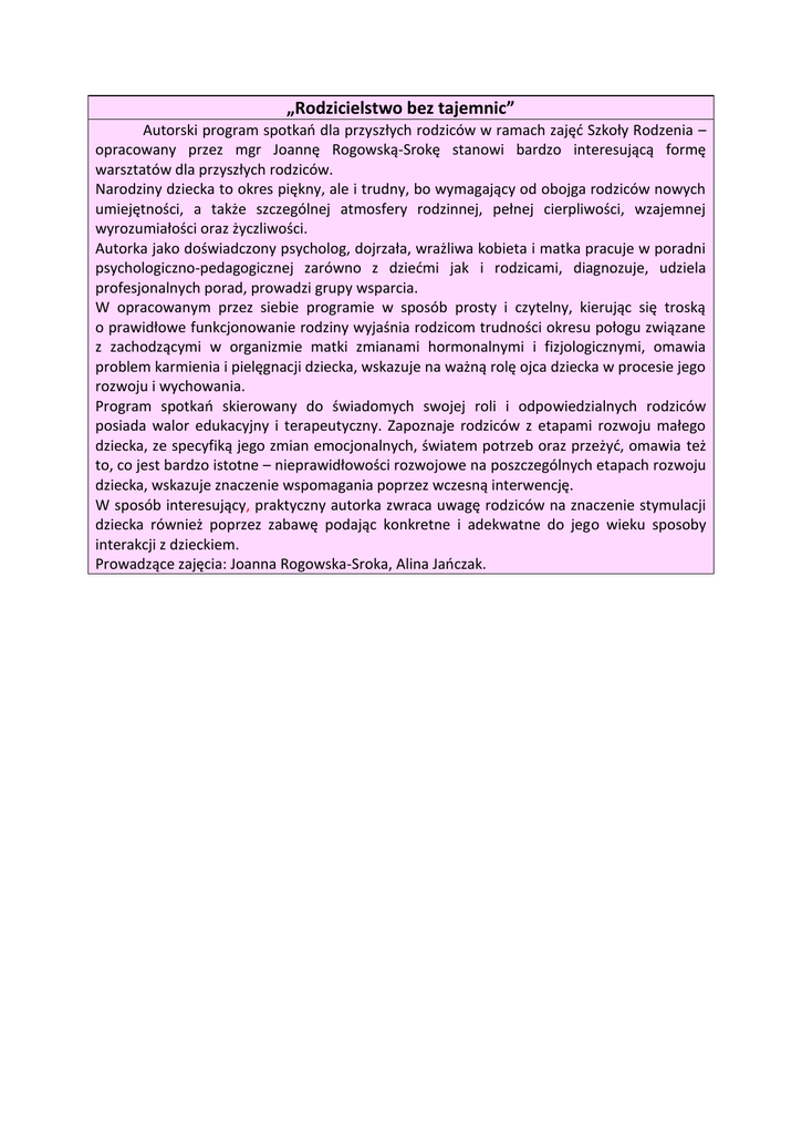„Rodzicielstwo bez tajemnic” Autorski program spotkań dla przyszłych rodziców w ramach zajęć Szkoły Rodzenia – opracowany przez mgr Joannę Rogowską-Srokę stanowi bardzo interesującą formę warsztatów dla przyszłych rodziców. Narodziny dziecka to okres piękny, ale i trudny, bo wymagający od obojga rodziców nowych umiejętności, a także szczególnej atmosfery rodzinnej, pełnej cierpliwości, wzajemnej wyrozumiałości oraz życzliwości. Autorka jako doświadczony psycholog, dojrzała, wrażliwa kobieta i matka pracuje w poradni psychologiczno-pedagogicznej zarówno z dziećmi jak i rodzicami, diagnozuje, udziela profesjonalnych porad, prowadzi grupy wsparcia. W opracowanym przez siebie programie w sposób prosty i czytelny, kierując się troską o prawidłowe funkcjonowanie rodziny wyjaśnia rodzicom trudności okresu połogu związane z zachodzącymi w organizmie matki zmianami hormonalnymi i fizjologicznymi, omawia problem karmienia i pielęgnacji dziecka, wskazuje na ważną rolę ojca dziecka w procesie jego rozwoju i wychowania. Program spotkań skierowany do świadomych swojej roli i odpowiedzialnych rodziców posiada walor edukacyjny i terapeutyczny. Zapoznaje rodziców z etapami rozwoju małego dziecka, ze specyfiką jego zmian emocjonalnych, światem potrzeb oraz przeżyć, omawia też to, co jest bardzo istotne – nieprawidłowości rozwojowe na poszczególnych etapach rozwoju dziecka, wskazuje znaczenie wspomagania poprzez wczesną interwencję. W sposób interesujący, praktyczny autorka zwraca uwagę rodziców na znaczenie stymulacji dziecka również poprzez zabawę podając konkretne i adekwatne do jego wieku sposoby interakcji z dzieckiem. Prowadzące zajęcia: Joanna Rogowska-Sroka, Alina Jańczak.