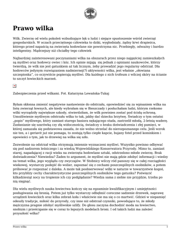 Prawo wilka Wilk. Zwierzę od wielu pokoleń wzbudzające lęk u ludzi i siejące spustoszenie wśród zwierząt gospodarskich. W oczach przeciętnego człowieka to dziki, wygłodniały, żądny krwi drapieżca, którego przed napaścią na zwierzęta hodowlane nie powstrzyma nic. Przebiegły, odważny i bardzo inteligentny. Mądrzejszy niż chciałby tego człowiek Najbardziej zainteresowani poczynaniami wilka na obszarach przez niego najgęściej zamieszkałych są myśliwi oraz hodowcy owiec i kóz. Ich opinie mijają się jednak z opiniami naukowców, którzy twierdzą, że wilk nie jest gatunkiem aż tak licznym, żeby prowadzić jego regularny odstrzał. Dla hodowców jedynym rozwiązaniem nadmiernej(?) aktywności wilka, jest właśnie „ołowiana szczepionka”, co oczywiście popierają myśliwi. Dla każdego z nich trofeum z wilczej skóry na ścianie to szczyt łowieckich marzeń. Zabezpieczenia przed wilkami. Fot. Katarzyna Lewańska-Tukaj Byłam skłonna zmienić negatywne nastawienie do odstrzału, opowiedzieć się za wpisaniem wilka na listę zwierząt łownych, ale kiedy wybrałam się w Bieszczady i posłuchałam ludzi, którym rzekomo wilki wyrządziły największe szkody, stwierdziłam, że wilk powinien zostać pod ścisłą ochroną. Umożliwienie myśliwym odstrzału wilka to tak, jakby dać dziecku brzytwę. Świadczy o tym ostatni „popis” myśliwego, który zamiast starego basiora nękającego stada, zastrzelił młodą, 2-letnią waderę. Zasłanianie się szarówką czy złą widocznością, świadczy o braku doświadczenia i złej pamięci, w której zamazała się podstawowa zasada, że nie wolno strzelać do nierozpoznanego celu. Jeśli wzrok nie ten, a i geriavit już nie pomaga, to zostają tylko ciepłe kapcie, bujany fotel przed kominkiem i opowieści o tym, jak to drzewiej na wilka się szło. Zezwolenie na odstrzał wilka otrzymują imiennie wyznaczeni myśliwi. Wszystko powinno odbywać się pod nadzorem leśniczego i za wiedzą Wojewódzkiego Konserwatora Przyrody. Mimo to, zamiast starej, napadającej z racji wieku na zwierzęta hodowlane sztuki, odstrzelono młode zwierzę. Brak doświadczenia? Niewiedza? Żaden to argument, że myśliwi nie mają gdzie zdobyć informacji i wiedzy na temat wilka, jego wyglądu czy zwyczajów. W Stobnicy wilczy ród panoszy się w całej rozciągłości wiekowej, wystarczy podejść do wolier, zapoznać się z cechami poszczególnych osobników, a potem próbować je rozpoznać z daleka. A może tak poobserwować wilki w naturze w towarzystwie kogoś, kto przybliży cechy charakterystyczne poszczególnych osobników tego gatunku? Poświęcić kilkadziesiąt nocy na tropienie ich czy podglądanie? Wiedza sama z siebie nie przyjdzie, trzeba po nią sięgnąć. Dla wielu myśliwych nauka łowiectwa kończy się na egzaminie kwalifikacyjnym i umiejętności posługiwania się bronią. Potem już tylko wystarczy odbębnić coroczne sadzenie drzewek, naprawę urządzeń łowieckich oraz kilka zebrań koła i właściwie nie ma się o co martwić. Gdzieś w niepamięć odeszły tradycje, miłość do przyrody, czy inne niż odstrzał czynniki, powodujące to, że młody mężczyzna pragnie zdobyć myśliwskie szlify. Do głosu zaczyna dochodzić moda na łowiectwo, snobizm i prześciganie się w coraz to lepszych modelach broni. I od takich ludzi ma zależeć przyszłość wilka? Prawo wilka 1 Podczas rozmów z bieszczadzkimi myśliwymi przekonałam się, jak niewielką mają oni wiedzę o tych drapieżnikach: „Pani, bo one wszystkie dziki zeżarły te wilki, a jemu (tu wskazanie na towarzysza) to sześć psów zeżarły”. Mój argument, że dzik stanowi zaledwie 4-6% masy odchodów wilka, zostało przyjęte z niedowierzaniem: „To, pani, gdzie te dziki?”. Według mnie, nie służy im klimat, bo jak inaczej to wytłumaczyć. Pan myśliwy lepiej od naukowców wie, co zjada wilk: badanie jego odchodów przeprowadza patykiem i rozgarniając starannie na boki, na oko stwierdza w nich sierść dzika i resztki jego kości. Czyli o stół rozbić wszelkie naukowe dochodzenia, typu suszenie, płukanie, zamrażanie, preparowanie i obserwacje pod mikroskopem, jeśli do przesądzenia o losie wilka wystarczy zwykły patyk! Fakt, że wilk woli polować na zwierzynę płową i zmniejszenie jej odstrzału mogłoby odciągnąć uwagę od zwierząt gospodarczych, jakoś do myśliwych nie przemawia. Twierdzą, że wilk nie poluje na jelenia, bo jeleni jest za dużo i muszą do nich strzelać, gdyż niszczą uprawy leśne. „Bo, pani, on (jeleń) i tak zeżre i tak zeżre”. Argument nie do pobicia. Najlepiej strzelać do wilka i jelenia, żeby broń Boże wilk się nie najadł, ale też nie chodził głodny, trudno zresztą być głodnym, gdy się nie żyje. Hodowcy z okolic objętych wyjątkową aktywnością wilka skarżą się, że zwierz ten dziesiątkuje im stada i pożera psy. Część z nich podchodzi jednak do tego problemu jak do atrakcji turystycznej, licząc, że mrożącymi krew w żyłach opowieściami ściągną na kwatery turystów żądnych wrażeń. Każda wypowiedź dotycząca działalności wilka kończy się zachwalaniem warunków pobytu w gospodarstwie rozmówcy, u jego sąsiadów lub rodziny. Czegóż jeszcze trzeba: atrakcje, przygody, piękne widoki – tylko jechać w Bieszczady! Niewielu hodowców posiada zabezpieczenia i psy pasterskie, które jak żadne inne nadają się do tego, żeby strzec owiec i kóz. Z kim rozmawiać o wilku? Doświadczenie naukowców nie znajduje uznania u myśliwych i mieszkańców Bieszczad. Z kolei wiedza przeciętnego człowieka i myśliwych jest zbyt mała, aby przesądzać o losie tego drapieżnika. Czy istnieje „złoty środek”, dzięki któremu można będzie pogodzić los wilka i los człowieka? Istnieje. Nazywa się rozsądek. Wydaje się, że o wilkach napisano już wszystko; wiemy, co jedzą, jak jedzą, znamy hierarchię w stadzie, dysponujemy nagraniami ich 