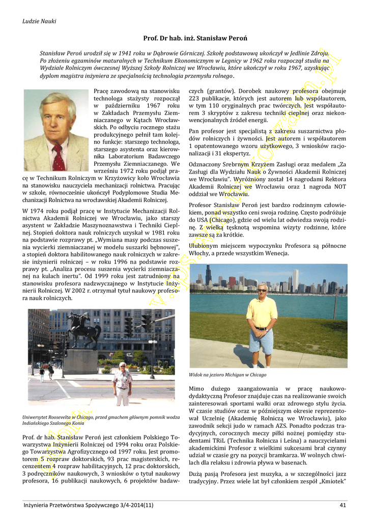 Ludzie Nauki Prof. Dr hab. inż. Stanisław Peroń czych (grantów). Dorobek naukowy profesora obejmuje 223 publikacje, których jest autorem lub współautorem, w tym 110 oryginalnych prac twórczych. Jest współautorem 3 skryptów z zakresu techniki cieplnej oraz niekonwencjonalnych źródeł energii. .w m. tu. ko sza Pracę zawodową na stanowisku technologa stażysty rozpoczął w październiku 1967 roku w Zakładach Przemysłu Ziemniaczanego w Kątach Wrocławskich. Po odbyciu rocznego stażu produkcyjnego pełnił tam kolejno funkcje: starszego technologa, starszego asystenta oraz kierownika Laboratorium Badawczego Przemysłu Ziemniaczanego. We wrześniu 1972 roku podjął pracę w Technikum Rolniczym w Krzyżowicy koło Wrocławia na stanowisku nauczyciela mechanizacji rolnictwa. Pracując w szkole, równocześnie ukończył Podyplomowe Studia Mechanizacji Rolnictwa na wrocławskiej Akademii Rolniczej. lin .pl Stanisław Peroń urodził się w 1941 roku w Dąbrowie Górniczej. Szkołę podstawową ukończył w Jedlinie Zdroju. Po złożeniu egzaminów maturalnych w Technikum Ekonomicznym w Legnicy w 1962 roku rozpoczął studia na Wydziale Rolniczym ówczesnej Wyższej Szkoły Rolniczej we Wrocławiu, które ukończył w roku 1967, uzyskując dyplom magistra inżyniera ze specjalnością technologia przemysłu rolnego . Odznaczony Srebrnym Krzyżem Zasługi oraz medalem „Za Zasługi dla Wydziału Nauk o Żywności Akademii Rolniczej we Wrocławiu”. Wyróżniony został 14 nagrodami Rektora Akademii Rolniczej we Wrocławiu oraz 1 nagroda NOT oddział we Wrocławiu. Profesor Stanisław Peroń jest bardzo rodzinnym człowiekiem, ponad wszystko ceni swoja rodzinę. Często podróżuje do USA (Chicago), gdzie od wielu lat odwiedza swoją rodzinę. Z wielką tęsknotą wspomina wizyty rodzinne, które zawsze są za krótkie. Ulubionym miejscem wypoczynku Profesora są północne Włochy, a przede wszystkim Wenecja. bra no z ww w. ips W 1974 roku podjął pracę w Instytucie Mechanizacji Rolnictwa Akademii Rolniczej we Wrocławiu, jako starszy asystent w Zakładzie Maszynoznawstwa i Techniki Cieplnej. Stopień doktora nauk rolniczych uzyskał w 1981 roku na podstawie rozprawy pt. „Wymiana masy podczas suszenia wycierki ziemniaczanej w modelu suszarki bębnowej”, a stopień doktora habilitowanego nauk rolniczych w zakresie inżynierii rolniczej – w roku 1996 na podstawie rozprawy pt. „Analiza procesu suszenia wycierki ziemniaczanej na kulach inertu”. Od 1999 roku jest zatrudniony na stanowisku profesora nadzwyczajnego w Instytucie Inżynierii Rolniczej. W 2002 r. otrzymał tytuł naukowy profesora nauk rolniczych. Pan profesor jest specjalistą z zakresu suszarnictwa płodów rolniczych i żywności. Jest autorem i współautorem 1 opatentowanego wzoru użytkowego, 3 wniosków racjonalizacji i 31 ekspertyz. Uniwersytet Roosevelta w Chicago, przed gmachem głównym pomnik wodza Indiańskiego Szalonego Konia po Prof. dr hab. Stanisław Peroń jest członkiem Polskiego Towarzystwa Inżynierii Rolniczej od 1994 roku oraz Polskiego Towarzystwa Agrofizycznego od 1997 roku. Jest promotorem 5 rozpraw doktorskich, 93 prac magisterskich, recenzentem 4 rozpraw habilitacyjnych, 12 prac doktorskich, 3 podręczników naukowych, 3 wniosków o tytuł naukowy profesora, 16 publikacji naukowych, 6 projektów badaw- Inżynieria Przetwórstwa Spożywczego 3/4-2014(11) Widok na jezioro Michigan w Chicago Mimo dużego zaangażowania w pracę naukowodydaktyczną Profesor znajduje czas na realizowanie swoich zainteresowań sportami walki oraz zdrowego stylu życia. W czasie studiów oraz w późniejszym okresie reprezentował Uczelnię (Akademię Rolniczą we Wrocławiu), jako zawodnik sekcji judo w ramach AZS. Ponadto podczas tradycyjnych, corocznych meczy piłki nożnej pomiędzy studentami TRiL (Technika Rolnicza i Leśna) a nauczycielami akademickimi Profesor z wielkimi sukcesami brał czynny udział w czasie gry na pozycji bramkarza. W wolnych chwilach dla relaksu i zdrowia pływa w basenach. Dużą pasją Profesora jest muzyka, a w szczególności jazz tradycyjny. Przez wiele lat był członkiem zespół „Kmiotek” 41 Ludzie Nauki Dziękujemy Profesorowi, że jest aktywny w pracach naukowo – dydaktycznych w naszym Zakładzie Techniki Cieplnej i Inżynierii Procesowej i nadal znajduje chęci, aby zajmować się zagadnieniami dotyczącymi rozwoju techniki w przemyśle spożywczym. .pl Życzliwość i otwarty umysł Profesora sprawia, że chętnie dzieli się swoją wiedzą i doświadczeniem naukowym. Zarówno studenci jak i koledzy z pracy zawsze mogą liczyć na rozmowę i pomoc z Jego strony. Jest osobą bardzo skromną i z dużym poczuciem humoru. lin w klubie „Ul” mającym swoją siedzibę w Domu Studenckim Labirynt we Wrocławiu. Grał na kontrabasie, a jak była potrzeba również na akordeonie. Zespół był częstym gościem na scenie podczas wydarzeń okolicznościowych związanych z życiem akademickim. .w m. tu. ko sza mgr Agnieszka Kordus Sekretariat Instytutu Inżynierii Rolniczej NOMINACJE DO TYTUŁU NAUKOWEGO PROFESORA, Z RĄK PREZYDENTA RZECZYPOSPOLITEJ POLSKIEJ: dr hab. inż. Jadwiga ANDRZEJEWSKA Katedra Agrotechnologii Uniwersytet Technologiczno-Przyrodniczy im. Jana i Jędrzeja Śniadeckich w Bydgoszczy dr hab. inż. Henryk BUJAK Katedra Technologii Rolnej i Przechowalnictwa Uniwersytet Przyrodniczy we Wrocławiu dr hab. Piotr KACHLICKI Zakład Genetyki Patogenów i Odporności Roślin Instytut Genetyki Roślin Polskiej Akademii Nauk w Poznaniu dr hab. inż. Janusz WOJDALSKI Katedra Organizacji i Inżynierii Produkcji Szkoła Główna Gospodarstwa Wiejskiego w Warszawie dr hab. inż. Edward KUNICKI Katedra Roślin Warzywnych i Zielarskich Uniwersytet Rolniczy im. Hugona Kołłątaja w Krakowie dr hab. inż. Bożena KORDAN Katedra Fitopatologii i Entomologii Uniwersytet Warmińsko-Mazurski w Olsztynie dr hab. inż. Stefan SATORA Katedra Melioracji i Budownictwa Rolni