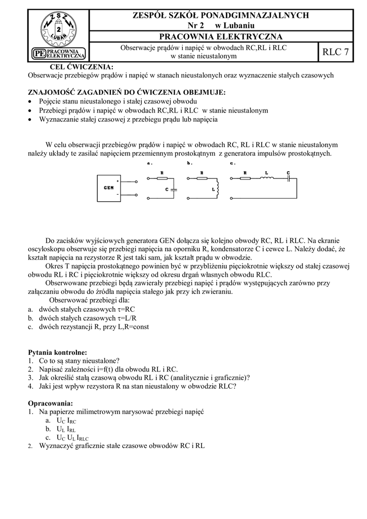 ZESPÓŁ SZKÓŁ PONADGIMNAZJALNYCH Nr 2 w Lubaniu PRACOWNIA ELEKTRYCZNA Obserwacje prądów i napięć w obwodach RC,RL i RLC w stanie nieustalonym RLC 7 CEL ĆWICZENIA: Obserwacje przebiegów prądów i napięć w stanach nieustalonych oraz wyznaczenie stałych czasowych ZNAJOMOŚĆ ZAGADNIEŃ DO ĆWICZENIA OBEJMUJE: Pojęcie stanu nieustalonego i stałej czasowej obwodu Przebiegi prądów i napięć w obwodach RC,RL i RLC w stanie nieustalonym Wyznaczanie stałej czasowej z przebiegu prądu lub napięcia W celu obserwacji przebiegów prądów i napięć w obwodach RC, RL i RLC w stanie nieustalonym należy układy te zasilać napięciem przemiennym prostokątnym z generatora impulsów prostokątnych. Do zacisków wyjściowych generatora GEN dołącza się kolejno obwody RC, RL i RLC. Na ekranie oscyloskopu obserwuje się przebiegi napięcia na oporniku R, kondensatorze C i cewce L. Należy dodać, że kształt napięcia na rezystorze R jest taki sam, jak kształt prądu w obwodzie. Okres T napięcia prostokątnego powinien być w przybliżeniu pięciokrotnie większy od stałej czasowej obwodu RL i RC i pięciokrotnie większy od okresu drgań własnych obwodu RLC. Obserwowane przebiegi będą zawierały przebiegi napięć i prądów występujących zarówno przy załączaniu obwodu do źródła napięcia stałego jak przy ich zwieraniu. Obserwować przebiegi dla: a. dwóch stałych czasowych =RC b. dwóch stałych czasowych =L/R c. dwóch rezystancji R, przy L,R=const Pytania kontrolne: 1. Co to są stany nieustalone? 2. Napisać zależności i=f(t) dla obwodu RL i RC. 3. Jak określić stałą czasową obwodu RL i RC (analitycznie i graficznie)? 4. Jaki jest wpływ rezystora R na stan nieustalony w obwodzie RLC? Opracowania: 1. Na papierze milimetrowym narysować przebiegi napięć a. UC IRC b. UL IRL c. UC UL IRLC 2. Wyznaczyć graficznie stałe czasowe obwodów RC i RL