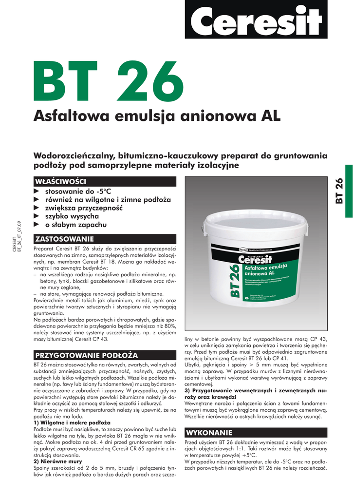 BT 26 Asfaltowa emulsja anionowa AL CERESIT BT_26_KT_07.09 Wodorozcieńczalny, bitumiczno-kauczukowy preparat do gruntowania podłoży pod samoprzylepne materiały izolacyjne BT 26 WŁAŚCIWOŚCI stosowanie do -5°C również na wilgotne i zimne podłoża zwiększa przyczepność szybko wysycha o słabym zapachu ZASTOSOWANIE Preparat Ceresit BT 26 służy do zwiększania przyczepności stosowanych na zimno, samoprzylepnych materiałów izolacyjnych, np. membran Ceresit BT 18. Można go nakładać wewnątrz i na zewnątrz budynków: – na wszelkiego rodzaju nasiąkliwe podłoża mineralne, np. betony, tynki, bloczki gazobetonowe i silikatowe oraz równe mury ceglane, – na stare, wymagające renowacji podłoża bitumiczne. Powierzchnie metali takich jak aluminium, miedź, cynk oraz powierzchnie tworzyw sztucznych i styropianu nie wymagają gruntowania. Na podłożach bardzo porowatych i chropowatych, gdzie spodziewana powierzchnia przylegania będzie mniejsza niż 80%, należy stosować inne systemy uszczelniające, np. z użyciem masy bitumicznej Ceresit CP 43. PRZYGOTOWANIE PODŁOŻA BT 26 można stosować tylko na równych, zwartych, wolnych od substancji zmniejszających przyczepność, nośnych, czystych, suchych lub lekko wilgotnych podłożach. Wszelkie podłoża mineralne (np. ławy lub ściany fundamentowe) muszą być starannie oczyszczone z zabrudzeń i zaprawy. W przypadku, gdy na powierzchni występują stare powłoki bitumiczne należy je dokładnie oczyścić za pomocą stalowej szczotki i odkurzyć. Przy pracy w niskich temperaturach należy się upewnić, że na podłożu nie ma lodu. 1) Wilgotne i mokre podłoża Podłoże musi być nasiąkliwe, to znaczy powinno być suche lub lekko wilgotne na tyle, by powłoka BT 26 mogła w nie wniknąć. Mokre podłoża na ok. 4 dni przed gruntowaniem należy pokryć zaprawą wodoszczelną Ceresit CR 65 zgodnie z instrukcją stosowania. 2) Nierówne mury Spoiny szerokości od 2 do 5 mm, bruzdy i połączenia tynków jak również podłoża o bardzo dużych porach oraz szcze- liny w betonie powinny być wyszpachlowane masą CP 43, w celu uniknięcia zamykania powietrza i tworzenia się pęcherzy. Przed tym podłoże musi być odpowiednio zagruntowane emulsją bitumiczną Ceresit BT 26 lub CP 41. Ubytki, pęknięcia i spoiny > 5 mm muszą być wypełnione mocną zaprawą. W przypadku murów z licznymi nierównościami i ubytkami wykonać warstwę wyrównującą z zaprawy cementowej. 3) Przygotowanie wewnętrznych i zewnętrznych naroży oraz krawędzi Wewnętrzne naroża i połączenia ścian z ławami fundamentowymi muszą być wyokrąglone mocną zaprawą cementową. Wszelkie nierówności o ostrych krawędziach należy usunąć. WYKONANIE Przed użyciem BT 26 dokładnie wymieszać z wodą w proporcjach objętościowych 1:1. Taki roztwór może być stosowany w temperaturze powyżej +5°C. W przypadku niższych temperatur, ale do -5°C oraz na podłożach porowatych i nasiąkliwych BT 26 nie należy rozcieńczać. Preparat równomiernie i obficie nakładać pędzlem lub poprzez natryskiwanie. Przy niskich temperaturach należy się upewnić, że podłoże nie jest pokryte lodem. Przed naklejaniem membrany BT 18, powłoka gruntująca musi być całkowicie wyschnięta i mieć odpowiednią przyczepność do podłoża. Czas potrzebny do całkowitego wyschnięcia zależy od takich czynników jak zawilgocenie podłoża, wilgotność względna i temperatura powietrza. Typowe przypadki opisane są w danych technicznych. BT 26 stosować tylko w suchych warunkach, w temperaturze od -5°C do +30°C i przy względnej wilgotności powietrza poniżej 80%. Przechowywać i przewozić w temp. nie niższej niż 5°C. Świeże zabrudzenia BT 26 zmywać wodą. Stwardniały materiał można usunąć za pomocą rozpuszczalnika, np. benzyny ekstrakcyjnej. W czasie pracy stosować ubrania, rękawice i okulary ochronne. Chronić przed dziećmi. W przypadku kontaktu z oczami płukać je obficie wodą i zasięgnąć porady lekarskiej. Wszelkie dane odnoszą się do temperatury +20°C i względnej wilgotności powietrza 60%. W innych warunkach należy uwzględnić krótszy lub dłuższy czas wysychania preparatu. Baza: wodna emulsja bitumiczno-kauczukowa z wypełniaczami mineralnymi Gęstość: 1,13 kg/dm3 Odporność na temperaturę (stwardniałej powłoki): od -25°C do +120°C Odporność na mróz: do -5°C Rozcieńczalnik: woda Proporcje rozcieńczania: BT 26 : woda jak 1:1, lub bez rozcieńczania (patrz WYKONANIE) Temperatura stosowania: od -5°C do +30°C Czas potrzebny do całkowitego wyschnięcia: wymienione poniżej czasy wysychania są wartościami typowymi, zależnymi od zawilgocenia podłoża i warunków temperaturowo-wilgotnościowych ZALECENIA Niniejsza karta techniczna określa zakres stosowania materiału i zalecany sposób prowadzenia robót, ale nie może zastąpić zawodowego przygotowania wykonawcy. Oprócz podanych zaleceń prace należy wykonać zgodnie ze sztuką budowlaną i zasadami BHP. Producent gwarantuje jakość wyrobu, natomiast nie ma wpływu na warunki i sposób jego użycia. W przypadku wątpliwości należy wykonać własne próby stosowania. Wraz z ukazaniem się tej karty technicznej tracą ważność karty wcześniejsze. Do 12 miesięcy od daty produkcji przy składowaniu w chłodnych i suchych warunkach. Chronić przed mrozem! Pojemniki plastikowe 5 kg. temperatura/wilgotność powietrza czasy schnięcia ok. +20°C/80% +5°C/80% +5°C/95% -5°C/80% +20°C/80% +5°C/80% +5°C/95% -5°C/80% +20°C/80% +5°C/80% -5°C/95% 1 godz. 3 godz. 6 godz. 6 godz. 2 godz. 6 godz. 1 dzień 1 dzień 6 godz. 1÷2 dni ok. 7 dni suche wilgotne (50% nasycenia) wilgotne (70% nasycenia) SKŁADOWANIE OPAKOWANIA podłoża Odporność na deszcz: po ok. 1÷3 godz. Orientacyjne zużycie: od 0,15 do 0,30 kg/m2 w zależności od sposobu stosowania Wyrób posiada atest Państwowego Zakładu Higieny HK/B/2141/02/99 oraz certyfikat zgodności KCZ/65/0