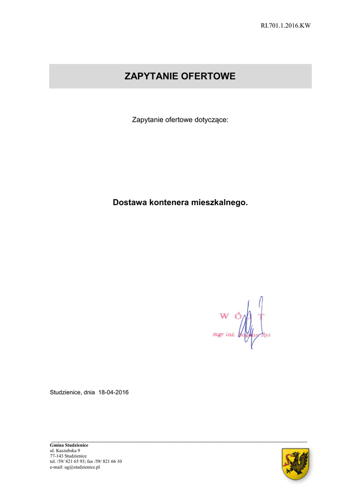 RI.701.1.2016.KW ZAPYTANIE OFERTOWE Zapytanie ofertowe dotyczące: Dostawa kontenera mieszkalnego. Studzienice, dnia 18-04-2016 ________________________________________________________________________ Gmina Studzienice ul. Kaszubska 9 77-143 Studzienice tel. /59/ 821 65 93; fax /59/ 821 66 10 e-mail: [email protected] RI.701.1.2016.KW PRZEDMIOT ZAMÓWIENIA I. Przedmiotem zamówienia jest dostawa jednego kontenera mieszkalnego. II. Specyfikacja techniczna kontenerowego zestawu mieszkalnego. Dane techniczne kontenera(wymiary zewnętrzne/ wewnętrzne): - długość max 6,2 m. - szerokość max 3,2 m. - wysokość zewnętrzna max 2,9 m. - wysokość wewnętrzna min 2,5 m. - rozkład pomieszczeń: pokój z aneksem kuchennym, łazienka, wiatrołap. Konstrukcja: - Rama nośna wykonana z profili zimnogiętych #3 i #4. Słupki mają być wykonane z kątownika równoramienny #4 (trzygięty 150x150x40x4). Podłużnice górne: ceownik Równorwamienny #4 (czterogięty 220x40x15x4). Podłużnice dolne: ceownik równoramienny #4 (140x60x4). Poprzeczki: ceownik równoramienny #4 (120x40x4). Dach kontenera wykonany z papy termozgrzewalnej płyta OSB # 22 ruszt wsporczy, wełna mineralna # 130 (80+50). Sufit wykonany z płyty laminowanej gładkiej #18. Ściany: powłoka zewnętrzna: blacha trapezowa T18 ocynkowana, powlekana, konstrukcja drewniana docieplanie z wełny mineralnej #80 powłoka wewnętrzna: płyta laminowana gładka #18 wykończona profilami PCV. Podłoga: Poszycie dolne wykonane z blachy ocynkowanej #0,5, poprzeczki z profili stalowych, zimnogiętych, wełna mineralna #120, płyta podłogowa # 22. Wykładzina podłogowa typu Rekord 42, klejona, w pomieszczeniach sanitarnych podwinięta na ściany min. 100 mm, listwa przypodłogowa PCV. Stolarka drzwiowa: - drzwi zewnętrzne 900x2000 stalowe, izolowane z wkładką patentową, klamką z szyldem, 3 egz. Kluczy oraz okapnikiem zewnętrznym, - drzwi wewnętrzne 800x2000 płytowe, pełne z szyldem i klamką, - drzwi łazienkowe 800x2000, bez przeszklenia z otworami wentylacyjnymi. Stolarka okienna: Okna PCV rozwierano-uchylne, uchylne w łazience. Instalacja elektryczna (przewody elektryczne prowadzone w ścianach): gniazda natynkowe podwójne, hermetyczne w pomieszczeniu sanitarnym i kuchni. Oświetlenie ________________________________________________________________________ Gmina Studzienice ul. Kaszubska 9 77-143 Studzienice tel. /59/ 821 65 93; fax /59/ 821 66 10 e-mail: [email protected] RI.701.1.2016.KW lamy 2x36W – w pomieszczeniach mieszkalnych, w pomieszczeniu socjalnym lampy hermetyczne 60W. Przyłącze elektryczne – przeprowadzony przewód przez przepust w podłodze, bezpośrednio do rozdzielni. Rozdzielnia główna z zabezpieczeniami (włącznik różnicowo-prądowy, wyłączniki nadprądowe typu S oraz licznik elektryczny. Instalacja wodno-kanalizacyjna: cała instalacja z rozprowadzeniem wewnętrznym po ścianach (PCV) odpływ Ø 110, zasilanie wody Ø 32. Przyłącze wody – wyposażone w wodomierz. Instalacja grzewcza: grzejniki elektryczne, naścienne F17, na zabezpieczeniach, min. Moc 1,5 kW, w pokoju, 0,5 kW w łazience i kuchni. osobnych Wyposażenie: WCX kompakt – komplet (miska ustępowa, zbiornik ceramiczny, deska), umywalka z baterią, kabina prysznicowa 800x800 z brodzikiem i baterią. Wiszący elektryczny podgrzewacz wody SG80 o poj. 80 L. Kuchenka elektryczna 2 palnikowa zlew z ociekaczem zamocowany na szafce. Wentylacja wymuszona: wentylator wyciągowy, sufitowy o wydajności 100 m³/h w pomieszczeniu kuchni i łazienki. Rynny i rury spustowe wykonane z PCV. Kolorystyka: Rama szara lub niebieska. Ściany zewnętrzne – szare lub niebieskie, rynny i rury spustowe - szare lub niebieskie. Ściany wewnętrzne - jasne pastelowe lub białe, sufit - biały, stolarka drzwiowa zewnętrzna - szara lub niebieska, stolarka drzwiowa wewnętrzna – biała, stolarka okienna – biała. III. IV. V. Zamawiający dopuszcza możliwość dostawy używanego kontenera mieszkalnego. Jednak wówczas wykonawca jest zobowiązany wykazać Zamawiającemu, iż stan kontenera nosi znikome ślady użytkowania i nie jest uszkodzony oraz że nadaję się bezpośrednio do eksploatacji. Wykonawca jest zobowiązany dostarczyć kontener mieszkalny na miejsce montażu tj. do miejscowości Osława Dąbrowa, dz. nr 9, gmina Studzienice. Do oferty Wykonawca zobowiązany jest dołączyć zdjęcia kontenera sanitarnego (zewnętrzne z czerech stron, wewnętrzne każdego z pomieszczeń). TERMIN WYKONANIA ZAMÓWIENIA I. Ostateczny termin wykonania zamówienia ustala się na dzień 20 maja 2016 r., protokolarnym przekazaniem przedmiotu zamówienia Zamawiającemu. INFORMACJA O OŚWIADCZENIACH I DOKUMENTACH, JAKIE MAJĄ DOSTARCZYĆ WYKONAWCY Ofertę należy sporządzić na formularzu ofertowym, którego wzór stanowi Załącznik nr 1 do Zapytania Ofertowego. OSOBY UPRAWNIONE DO KONTAKTU Z WYKONAWCAMI ________________________________________________________________________ Gmina Studzienice ul. Kaszubska 9 77-143 Studzienice tel. /59/ 821 65 93; fax /59/ 821 66 10 e-mail: [email protected] RI.701.1.2016.KW Osoby do kontaktu: Imię i nazwisko: Kazimierz Wejman tel./fax: 59 82 166 08/ 59 82 166 10 e-mail: [email protected] OPIS SPOSOBU PRZYGOTOWANIA OFERTY Oferta musi mieć formę pisemną i być sporządzona w języku polskim. Oferta powinna zawierać: imię, nazwisko, firmę, nazwę i dokładny adres Wykonawcy, datę sporządzenia oferty oraz imię i nazwisko osoby uprawnionej do reprezentowania Wykonawcy; własnoręczny podpis wykonawcy bądź osób mających prawo zaciągać zobowiązania w jego imieniu; W przypadku przesyłek koperta powinna być oznaczona następująco: Oferta na dostawę kontenera mieszkalnego. MIEJSCE ORAZ TERMIN SKŁADANIA OFERT Oferty można składać: Pocztą lub osobiście na adres: Gmina Studzienice, ul. Kaszubska 9, 77–143 Studzienice przesłać skan oferty e-mailem na adres: [email protected] przesłać faksem podpisany formul