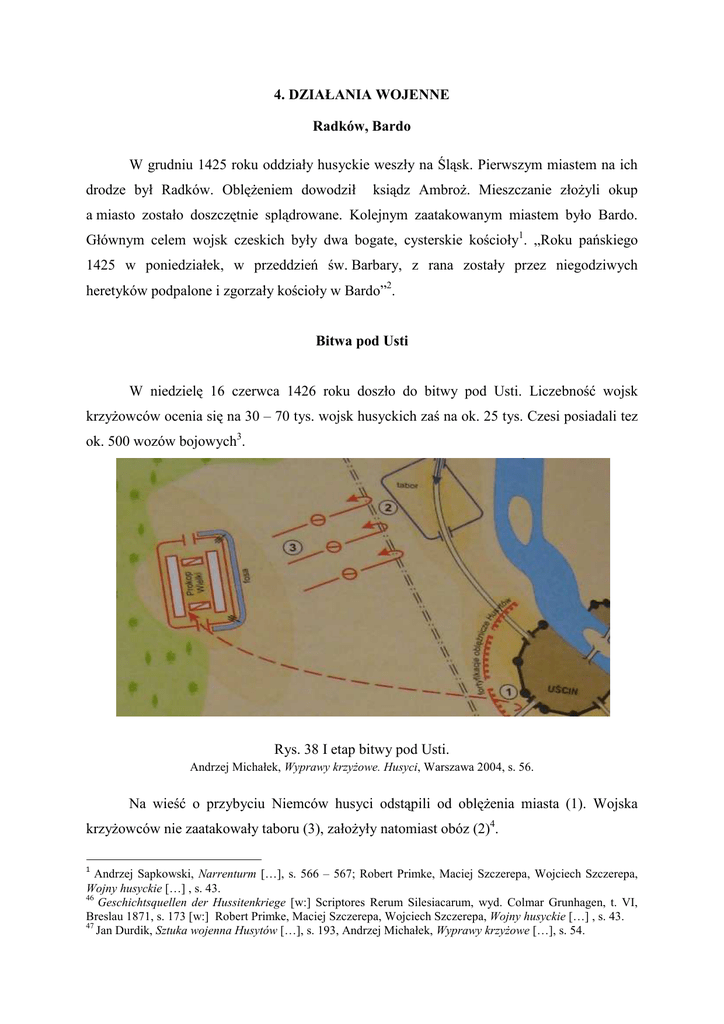 4. DZIAŁANIA WOJENNE Radków, Bardo W grudniu 1425 roku oddziały husyckie weszły na Śląsk. Pierwszym miastem na ich drodze był Radków. OblęŜeniem dowodził ksiądz AmbroŜ. Mieszczanie złoŜyli okup a miasto zostało doszczętnie splądrowane. Kolejnym zaatakowanym miastem było Bardo. Głównym celem wojsk czeskich były dwa bogate, cysterskie kościoły1. „Roku pańskiego 1425 w poniedziałek, w przeddzień św. Barbary, z rana zostały przez niegodziwych heretyków podpalone i zgorzały kościoły w Bardo”2. Bitwa pod Usti W niedzielę 16 czerwca 1426 roku doszło do bitwy pod Usti. Liczebność wojsk krzyŜowców ocenia się na 30 – 70 tys. wojsk husyckich zaś na ok. 25 tys. Czesi posiadali tez ok. 500 wozów bojowych3. Rys. 38 I etap bitwy pod Usti. Andrzej Michałek, Wyprawy krzyŜowe. Husyci, Warszawa 2004, s. 56. Na wieść o przybyciu Niemców husyci odstąpili od oblęŜenia miasta (1). Wojska krzyŜowców nie zaatakowały taboru (3), załoŜyły natomiast obóz (2)4. 1 Andrzej Sapkowski, Narrenturm […], s. 566 – 567; Robert Primke, Maciej Szczerepa, Wojciech Szczerepa, Wojny husyckie […] , s. 43. 46 Geschichtsquellen der Hussitenkriege [w:] Scriptores Rerum Silesiacarum, wyd. Colmar Grunhagen, t. VI, Breslau 1871, s. 173 [w:] Robert Primke, Maciej Szczerepa, Wojciech Szczerepa, Wojny husyckie […] , s. 43. 47 Jan Durdik, Sztuka wojenna Husytów […], s. 193, Andrzej Michałek, Wyprawy krzyŜowe […], s. 54. Rys. 39 II etap bitwy pod Usti Andrzej Michałek, Wyprawy krzyŜowe. Husyci, Warszawa 2004, s. 56. Następnie Niemcy przeprowadzali falowe ataki piechoty (4) artyleria zaś pilnowała skrzydeł piechurów przed atakiem husyckiej jazdy (5). Po pierwszych atakach pierwsza linia husytów została powaŜnie nadwątlona. Czesi wycofali z niej większość dział (6)5. Rys. 40 III etap bitwy pod Usti Andrzej Michałek, Wyprawy krzyŜowe. Husyci, Warszawa 2004, s. 56. 4 5 Andrzej Michałek, Wyprawy krzyŜowe […], s. 56. Ibidem. Ostatni, trzeci etap bitwy został opisany w pierwszym tomie Trylogii. Niemiecka piechota przełamała pierwszą linię husytów (7). Wraz z piechotą zaatakowała, nie część jak planowano a cała kawaleria (8). W stronę atakującego, zbitego tłumu Czesi wystrzelili dwie salwy z broni palnej i artylerii. Pod ostrzałem atak wyraźnie załamał się. Do wewnętrznego czworoboku wozów dotarli nieliczni. Wówczas nastąpiło przeciwnatarcie piechoty i kawalerii czeskiej (9, 10), które ostatecznie przechyliło szalę zwycięstwa na korzyść Czechów. Niemcy chcąc uniknąć okrąŜenia wycofali się (11). Liczbę ofiar w bitwie pod Usti źródła szacują na ok. 10 tys. Choć są to dane przesadzone to jednak pozwalają ocenić skalę bitwy i zwycięstwa Czechów6. Bitwa pod Nysą 18 marca 1428 roku doszło do kolejnej duŜej bitwy, która znalazła swój opis na kartach Trylogii. Próby powstrzymania marszu armii husyckiej, która plądrowała miasta śląskie podjął biskup Konrad. Do starcia doszło pod Nysą. Liczba wojsk husyckich miała sięgać nawet 25 tys.. Podstawę wojsk biskupich stanowili chłopi. Według opisu Sapkowskiego chłopska piechota uciekła z pola bitwy juŜ po pierwszej salwie husytów. I rzeczywiście oddziały chłopskie praktycznie nie podjęły walki. Bitwa skończyła się druzgocącą klęską wojsk biskupich. Liczba poległych sięgnęła według przekazów od 1 do 5 tys. Samo miasto pozostało nietknięte, husyci splądrowali jedynie okolice7. Kłodzko, Otmuchów, Ząbkowice Śląskie, Złotoryja, Chojnów W tym samym miesiącu husyci podjęli próbę zdobycia Kłodzka. Miasto było jednak dobrze przygotowane do obrony. W tomie drugim, pt: „BoŜy bojownicy” pojawia się opis jak to mieszczanie kłodzcy rozbierają potęŜny kamienny budynek zakonu franciszkanów. Obawiano się bowiem iŜ budynek będzie mógł posłuŜyć husytom podczas oblęŜenia. Prawdą jest jakoby starosta kłodzki wydal taki rozkaz lecz uczynił to w roku 1427. Tak więc kiedy husyci oblegali Kłodzko ów klasztor juŜ nie istniał. OblęŜenie nie przyniosło rezultatów. Kłodzka nie udało się Czechom zdobyć. 28 marca husyci splądrowali i spalili naleŜący do biskupa Konrada Otmuchów, łącznie z kolegiatą, w kwietniu zaś Ząbkowice Śląskie (Frankenstein). Pod koniec kwietnia napadli Chojnów. Sapkowski pisze, zgodnie z rzeczywistością, Ŝe ksiąŜę lubiński Ruprecht jeszcze przed atakiem zbiegł z miasta wraz z 6 Andrzej Sapkowski, BoŜy bojownicy […], s. 20 – 22; Andrzej Michałek, Wyprawy krzyŜowe […], s. 56; Jan Durdik, Sztuka wojenna Husytów […], s. 193 – 195. 7 Robert Primke, Maciej Szczerepa, Wojciech Szczerepa, Wojny husyckie […] , s. 61 – 62; Andrzej Sapkowski, BoŜy bojownicy […], s. 410 – 411; Piotr Marczak, Wojny husyckie […], s. 99. rycerstwem. Czesi bez duŜych problemów dostali się za mury miejskie. Jeden dowodzących, Kralovec wydał rozkaz wymordowania wszystkich mieszkańców i spalenia miasta. Jak podaje źródło z mieszczan ocalało 15 osób. W dalszej części ksiąŜki pojawiają się wspomnienia dotyczące zniszczenia Złotoryi. W połowie maja husyci wdarli się do miasta. Część mieszczan, w tym dowodzący obroną Georg von Unruh uciekła na samą wieść o nadciągającym wrogu. Ucieczka nie powiodła się gdyŜ mieszkańcy wpadli na oddział husytów. W efekcie część mieszczan stratowała się nawzajem a pozostałych przy Ŝyciu wymordowali Czesi. Splądrowane zostały wszystkie domy oraz kościół franciszkanów8. Bitwa pod Starym Wielisławiem Do kolejnej duŜej bitwy doszło 27 grudnia 1428 roku. Wojska husyckie obozowały w Kotlinie Kłodzkiej. Obóz był dobrze zabezpieczony. Husyci przebywali w tym miejscu kilkanaście dni, pustosząc okoliczne wsie. Czas ten wykorzystał ksiąŜę Jan Ziębicki, który zrywając zawarty z Czechami układ zgromadził wojsko. W skład jego armii wchodziły oddziały ziębickie, świdnickie, wrocławskie 
