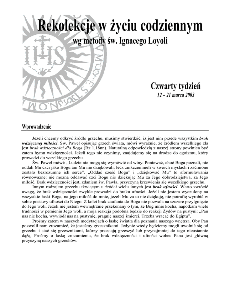 Rekolekcje w życiu codziennym wg metody św. Ignacego Loyoli Czwarty tydzień 12 – 21 marca 2003 Wprowadzenie Jeżeli chcemy odkryć źródło grzechu, musimy stwierdzić, iż jest nim przede wszystkim brak wdzięcznej miłości. Św. Paweł opisując grzech świata, mówi wyraźnie, że źródłem wszelkiego zła jest brak wdzięczności dla Boga (Rz 1,18nn). Naturalną odpowiedzią z naszej strony powinien być zatem hymn wdzięczności. Jeżeli tego nie czynimy, znajdujemy się na drodze do egoizmu, który prowadzi do wszelkiego grzechu. Św. Paweł mówi: „Ludzie nie mogą się wymówić od winy. Ponieważ, choć Boga poznali, nie oddali Mu czci jako Bogu ani Mu nie dziękowali, lecz znikczemnieli w swoich myślach i zaćmione zostało bezrozumne ich serce”. „Oddać cześć Bogu” i „dziękować Mu” to sformułowania równoważne: nie można oddawać czci Bogu nie dziękując Mu za Jego dobrodziejstwa, za Jego miłość. Brak wdzięczności jest, zdaniem św. Pawła, przyczyną krzewienia się wszelkiego grzechu. Innym rodzajem grzechu tkwiącym u źródeł wielu innych jest brak ufności. Warto zwrócić uwagę, że brak wdzięczności zwykle prowadzi do braku ufności. Jeżeli nie jestem wyczulony na wszystkie łaski Boga, na jego miłość do mnie, jeżeli Mu za to nie dziękuję, nie potrafię wyrobić w sobie postawy ufności do Niego. Z kolei brak zaufania do Boga nie pozwala na szczere przylgnięcie do Jego woli. Jeżeli nie jestem wewnętrznie przekonany o tym, że Bóg mnie kocha, napotkam wiele trudności w pełnieniu Jego woli, a moja reakcja podobna będzie do reakcji Żydów na pustyni: „Pan nas nie kocha, wywiódł nas na pustynię, pragnie naszej śmierci. Trzeba wracać do Egiptu”. Prośmy zatem w naszych medytacjach o łaskę światła dla poznania naszego wnętrza. Oby Pan pozwolił nam zrozumieć, że jesteśmy grzesznikami. Jedynie wtedy będziemy mogli uwolnić się od grzechu i stać się grzesznikami, którzy przestają grzeszyć lub przynajmniej do tego nieustannie dążą. Prośmy o łaskę zrozumienia, że brak wdzięczności i ufności wobec Pana jest główną przyczyną naszych grzechów. Grzech jako brak owoców miłości (Łk 13,1-9) Obraz dla obecnej modlitwy: Wyobraźmy sobie wypaloną ziemię, na której już nic nie może się urodzić, nikt też nie może na niej zamieszkać. Popatrzmy na ponury krajobraz, martwe konary drzew. Nie ma tu zapachów kwitnących kwiatów, nie słychać śpiewu ptaków. Jak odnajduję się na takiej pustyni? Co czuję? Prośba o owoc modlitwy: Poprośmy o dar wdzięczności za to, że do tej pory Bóg podtrzymuje nasze życie i czyni starania, aby wydało owoc godny powołania. 1. Wszyscy tak samo zginiecie Kategoryczna wypowiedź Pana Jezusa nie zostawia żadnego pola do dyskusji na temat jakichkolwiek wyjątków. Wszyscy tak samo... Podobnie wypowie się o świętym mieście Jerozolimie, przepowiadając jej zniszczenie. Raz dane życie ma nadany mu cel i powinno wydać zamierzony owoc, inaczej podlega nieodwracalnej zagładzie. Myślenie o tym sprawia trudności, ale nie może być pominięte. Owocem życia jest miłość, bez niej życie jest jałowe jak spalona ziemia. Bez doświadczenia miłości wszelkie dokonania są tylko złudnym przekonaniem o doniosłej samorealizacji. Jezus ukazuje to na przykładzie drzewa figowego. Chodzi o drzewo od lat nie dające żadnego owocu. Wprawdzie drzewo to pięknie zakwita z wiosną, pysznie zieleni się latem, wspaniale okrywa barwami na jesieni, ale mimo budzenia wszelkich zachwytów estetycznych pamiętamy, że drzewo to pozostaje jałowe. Nadaje się wyłącznie do wycięcia. Jedyny owoc jaki zrodziło - to rozczarowanie... Każdy człowiek pielęgnuje - choćby nieświadomie - jakąś wizję swojego życia. Na swój sposób pragnie, by było ono piękne. Stwórca wpisał w nasze istnienie nieustające pragnienie poszukiwania Prawdy, Dobra, Piękna... Jednak tylko zakorzenieni w Tym, Który jest Drogą, Prawdą i Życiem, możemy czynić to owocne. 2. Czy myślicie? Czy myślicie? To znaczy, czy dostrzegacie, że wasze absolutyzowanie bieżących wydarzeń zasłania wam perspektywę prawdziwego zagrożenia? Każdego dnia środki przekazu donoszą o ważnych i tragicznych wydarzeniach, dokonujących się na całym świecie. Miliony ludzi ogląda te same zdjęcia z obszarów wojen, parad politycznej próżności, nieustającego festiwalu kulturowego banału. Wszystko wydaje się tak niesłychanie ważne i - jakoby - znacząco wpływające na losy świata. Ponadto dosięgają nas czasami także i osobiste tragedie: cierpienia i choroby, rozmaite trudności. Stają się one częstym tematem rozmów codziennych. I tak, w powodzi niebywale istotnych wiadomości, giną te najważniejsze. Czy nie tak ginie - zarazem - umiejętność głębszego spojrzenia na tajemnicę życia, jego cel i zawarty w nim sens? W powodzi informacji brakuje czasu na refleksję. Człowiekowi brakuje dystansu – gubi on zdolność zachowania stosownej oceny przemijających zdarzeń. O tym, jak bardzo niebezpieczne jest takie zagubienie, opowiada rozważana Ewangelia. Popatrzmy na emocje ludzi, którzy donieśli Jezusowi o Galilejczykach. Zdaje się, że oczekują, iż będzie On podzielał ich ocenę tragedii. Pan Jezus nie podziela jednak przekonania, jakie żywią ludzie zaskoczeni wiadomością o przelewie krwi, raz jeszcze dokonanym w imię walki o władzę. Owszem, w tej rozmowie podkreśla, że zewnętrzny obraz śmierci nie ma żadnego znaczenia. Dla samego Jezusa wydarzenia te - czy osadzone w porządku zaburzeń politycznych, społecznych czy też będące wynikiem kataklizmu - nie mają aż takiej rangi, by zasłoniły problem nieporównanie ważniejszy. Dwukrotnie pada pytanie: czyż myślicie, że rozumiecie dobrze, o czym chcą wam powiedzieć te zdarzenia? Czy obawa o bezpieczeństwo ziemskiej, przemijającej egzystencji nie zasłania wam prawdziwie koniecznej troski o rat