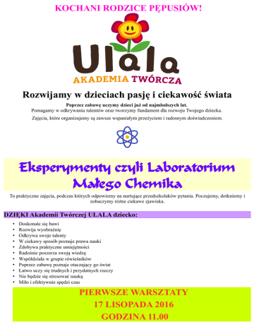 KOCHANI RODZICE PĘPUSIÓW! Rozwijamy w dzieciach pasję i ciekawość świata Poprzez zabawę uczymy dzieci już od najmłodszych lat. Pomagamy w odkrywaniu talentów oraz tworzymy fundament dla rozwoju Twojego dziecka. Zajęcia, które organizujemy są zawsze wspaniałym przeżyciem i radosnym doświadczeniem. Eksperymenty czyli Laboratorium Małego Chemika To praktyczne zajęcia, podczas których odpowiemy na nurtujące przedszkolaków pytania. Poczujemy, dotkniemy i zobaczymy różne ciekawe zjawiska. DZIĘKI Akademii Twórczej ULALA dziecko: • • • • • • • • • • • Doskonale się bawi Rozwija wyobraźnię Odkrywa swoje talenty W ciekawy sposób poznaje prawa nauki Zdobywa praktyczne umiejętności Radośnie poszerza swoją wiedzę Współdziała w grupie rówieśników Poprzez zabawę poznaje otaczający go świat Łatwo uczy się trudnych i przydatnych rzeczy Nie będzie się stresować nauką Miło i efektywnie spędzi czas PIERWSZE WARSZTATY 17 LISOPADA 2016 GODZINA 11.00 Zainspirowani przez dzieci, chcemy podążać wraz z nimi. Naszą misją jest wspieranie rozwoju dzieci przez zabawę. ZAJĘCIA ODBYWAĆ SIĘ BĘDĄ CYKLICZNIE CAŁY ROK SZKOLNY DLA GRUPY DO 30 OSÓB W WYZNACZONYCH TERMINACH NA TERENIE PRZEDSZKOLA „PĘPUŚ ŚWIATA” DLA PRZEDSZKOLA „PĘPUŚ ŚWIATA” UL. SCHWEITZERA ZAWSZE O GODZINIE 9.30 DLA PRZEDSZKOLA „PĘPUŚ ŚWIATA” UL. ŁUŻYCKA 28 ZAWSZE O GODZINIE 11.00 Spotkania tematyczne odbywają się cyklicznie co miesiąc, podczas których dzieci odkrywają kolejne zagadnienie. Po zajęciach każde dziecko otrzymuje dyplom uczestnictwa. REGULARNE TERMINY SPOTKAŃ NA ROK SZKOLNY 2016/2017 17.11.2016 CZWARTEK 7.12.2016 ŚRODA 11.01.2017 ŚRODA 8.02.2017 ŚRODA 15.03.2017 ŚRODA 12.04.2017 ŚRODA 17.05.2017 ŚRODA 14.06.2017 ŚRODA