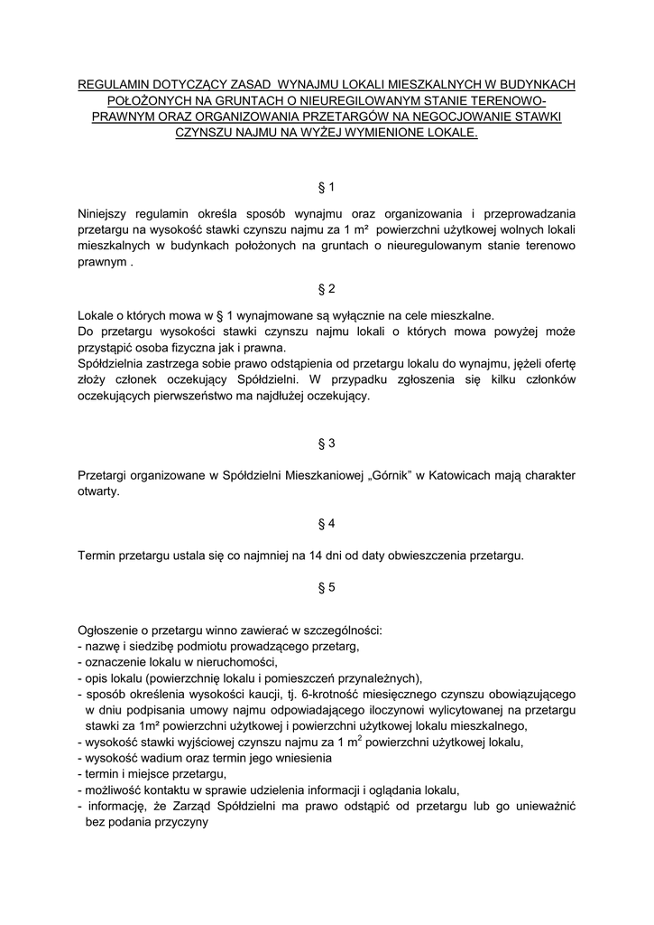 REGULAMIN DOTYCZĄCY ZASAD WYNAJMU LOKALI MIESZKALNYCH W BUDYNKACH POŁOŻONYCH NA GRUNTACH O NIEUREGILOWANYM STANIE TERENOWOPRAWNYM ORAZ ORGANIZOWANIA PRZETARGÓW NA NEGOCJOWANIE STAWKI CZYNSZU NAJMU NA WYŻEJ WYMIENIONE LOKALE. §1 Niniejszy regulamin określa sposób wynajmu oraz organizowania i przeprowadzania przetargu na wysokość stawki czynszu najmu za 1 m² powierzchni użytkowej wolnych lokali mieszkalnych w budynkach położonych na gruntach o nieuregulowanym stanie terenowo prawnym . §2 Lokale o których mowa w § 1 wynajmowane są wyłącznie na cele mieszkalne. Do przetargu wysokości stawki czynszu najmu lokali o których mowa powyżej może przystąpić osoba fizyczna jak i prawna. Spółdzielnia zastrzega sobie prawo odstąpienia od przetargu lokalu do wynajmu, jężeli ofertę złoży członek oczekujący Spółdzielni. W przypadku zgłoszenia się kilku członków oczekujących pierwszeństwo ma najdłużej oczekujący. §3 Przetargi organizowane w Spółdzielni Mieszkaniowej „Górnik” w Katowicach mają charakter otwarty. §4 Termin przetargu ustala się co najmniej na 14 dni od daty obwieszczenia przetargu. §5 Ogłoszenie o przetargu winno zawierać w szczególności: - nazwę i siedzibę podmiotu prowadzącego przetarg, - oznaczenie lokalu w nieruchomości, - opis lokalu (powierzchnię lokalu i pomieszczeń przynależnych), - sposób określenia wysokości kaucji, tj. 6-krotność miesięcznego czynszu obowiązującego w dniu podpisania umowy najmu odpowiadającego iloczynowi wylicytowanej na przetargu stawki za 1m² powierzchni użytkowej i powierzchni użytkowej lokalu mieszkalnego, - wysokość stawki wyjściowej czynszu najmu za 1 m2 powierzchni użytkowej lokalu, - wysokość wadium oraz termin jego wniesienia - termin i miejsce przetargu, - możliwość kontaktu w sprawie udzielenia informacji i oglądania lokalu, - informację, że Zarząd Spółdzielni ma prawo odstąpić od przetargu lub go unieważnić bez podania przyczyny §6 Komisję przetargową powołuje każdorazowo Prezes Zarządu w co najmniej trzy osobowym składzie tj. przedstawiciel Zarządu Spółdzielni i dwóch pracowników Działu Członkowsko – Mieszkaniowego i Organizacyjno Samorządowego Spółdzielni. §7 Komisja wyłania ze swego grona Przewodniczącego, osobę prowadzącą przetarg oraz sporządzającą protokół. §8 Przetarg odbywa się publicznie ustnie a z jego przebiegu winien być sporządzony protokół który po zakończeniu przetargu podpisuje cała komisja. §9 Przystępujący do przetargu składają pisemne oświadczenia o zapoznaniu się z warunkami przetargu i niniejszymi zasadami wynajmu oraz winni uczestniczyć w przetargu osobiście. § 10 Przystępujący do przetargu zobowiązani są wnieść wadium w wysokości 1000,- zł. Wpłata wadium winna być dokonana najpóźniej na godzinę przed rozpoczęciem przetargu w kasie Spółdzielni. § 11 Przed rozpoczęciem przetargu prowadzący podaje do wiadomości: - adres lokalu mieszkalnego do wynajmu, - opis lokalu (powierzchnię lokalu i pomieszczeń przynależnych), - wyjściową wysokość stawki czynszu najmu za 1 m² powierzchni wynajmowanego lokalu użytkowej § 12 Wysokość postąpień ustalona zostaje na kwotę 50% wyjściowej stawki czynszu najmu za 1 m² powierzchni użytkowej wynajmowanego lokalu. § 13 Prowadzący przetarg nie może rozpocząć przetargu na wysokość stawki czynszu najmu następnego lokalu do wynajmu o ile nie zostanie zakończony przetarg na wysokość stawki czynszu najmu poprzedniego lokalu do wynajmu. § 14 Zaoferowana stawka czynszu najmu za 1 m² powierzchni użytkowej lokalu mieszkalnego przestaje wiązać gdy inny uczestnik zaoferuje wyższą stawkę. § 15 Po ustaniu postąpień prowadzący przetarg uprzedza obecnych, że po trzecim powtórzeniu ostatnio zaoferowanej stawki czynszu najmu za 1 m² powierzchni użytkowej lokalu mieszkalnego, dalsze postąpienia nie będą przyjmowane. § 16 Wygrywający przetarg wynajmuje lokal w stanie technicznym w jakim znajduje się w dniu przetargu a koszty remontu obciążają wygrywającego przetarg (najemcę). § 17 Wygrywający przetarg (najemca) pokrywa koszty: - naprawy spękań podłoża pod posadzkami i podłogami, konserwacji, naprawy lub wymiany podłóg, posadzek i wykładzin, - naprawy ubytku tynków na ścianach i sufitach, - konserwacji, naprawy i wymiany okien, drzwi wewnętrznych i zewnętrznych w lokalu oraz mebli wbudowanych, uzupełnienia wybitych i pękniętych szyb, - konserwacji, naprawy i wymiany trzonów kuchennych, podgrzewaczy wody, pieców c.o. i ciepłej wody oraz urządzeń techniczno-sanitarnych (wanien, zlewozmywaków, umywalek, brodzików, muszli ustępowych, sedesów, urządzeń spłukujących z kompletnym wyposażeniem) wraz z syfonami, bateriami, zaworami czerpalnymi, przewodami elastycznymi, - malowania, tapetowania ścian i sufitów (w tym loggi i balkonów) malowania olejnego okien, drzwi, wbudowanych mebli, urządzeń kuchennych, sanitarnych i grzewczych, powyższe dotyczy również przypadków po wykonaniu awaryjnych napraw lub remontów wykonywanych przez Wynajmującego, - naprawy lub wymiany kratek wentylacyjnych oraz doprowadzenia odpowiedniej ilości powietrza do lokalu (rozszczelnienie lokalu) między innymi poprzez tzw. mikrouchyłów w stolarce okiennej lub zamontowanie stosownych nawiewników okiennych zgodnie z zaleceniami zawartymi w protokołach kominiarskich. W przypadku zamontowanych w łazienkach gazowych podgrzewaczy wody, również umożliwienie doprowadzenia tam odpowiedniej ilości powietrza, poprzez między innymi zabudowanie w drzwiach kratki wentylacyjnej o powierzchni nieosłoniętego przekroju min. 220 cm². Za skutki niewywiązania się z w/w obowiązków tzn. powstałe zawilgocenia, pleśnie, grzyby, zatrucia – odpowiada Najemca lokalu, - naprawy i wymiany kanalizacyjnych przewodów odpływowych na odcinku od urządzeń sanitarnych do pionów zbiorczych oraz niezwłoczne usuw